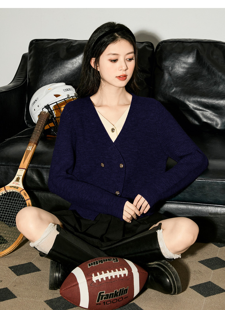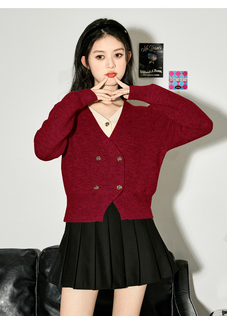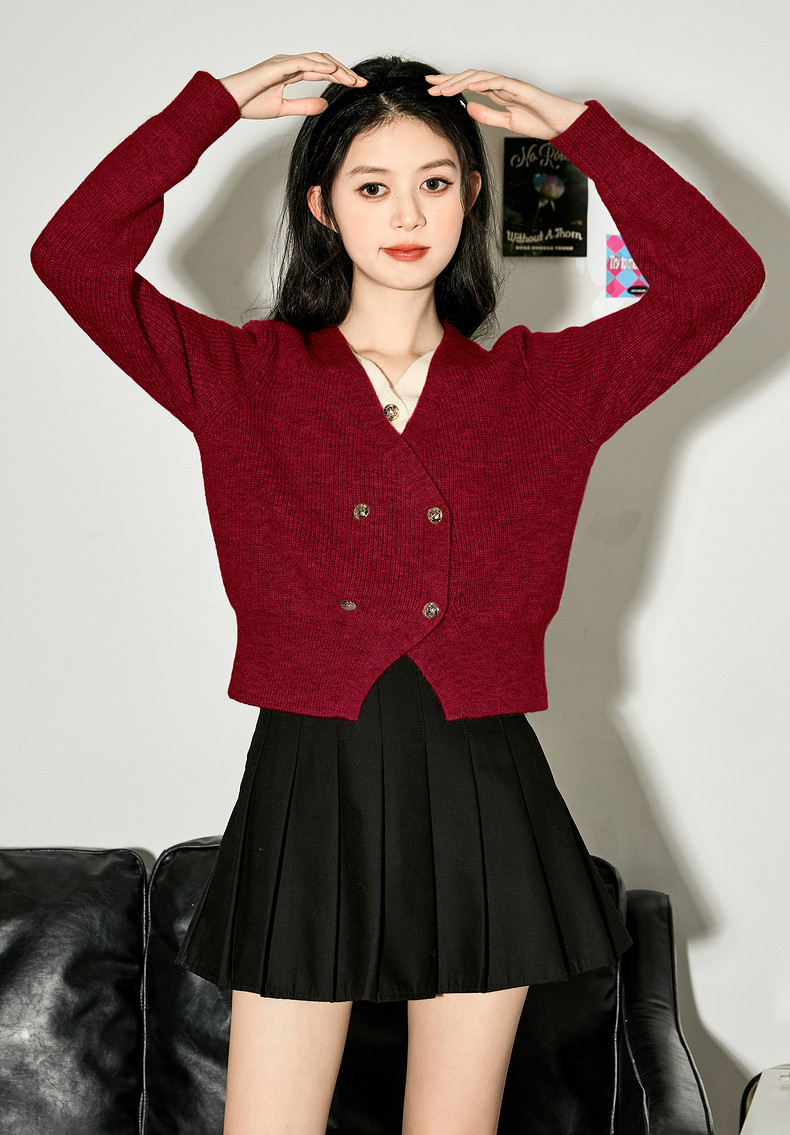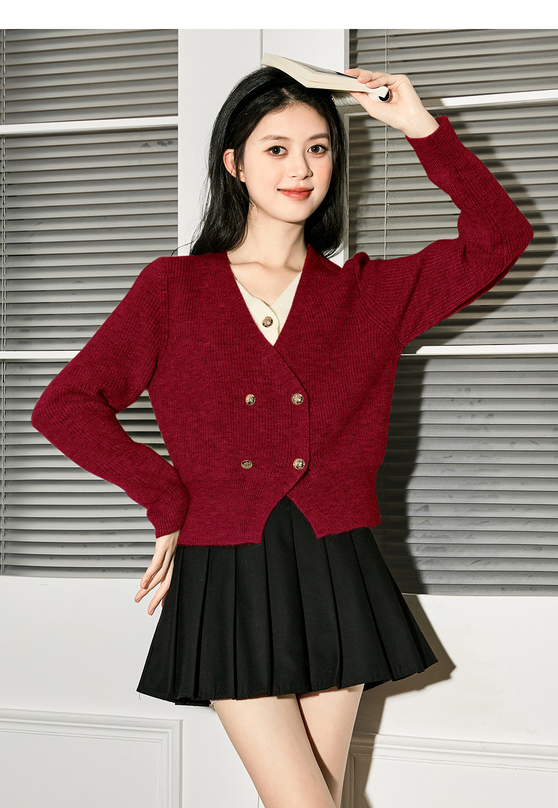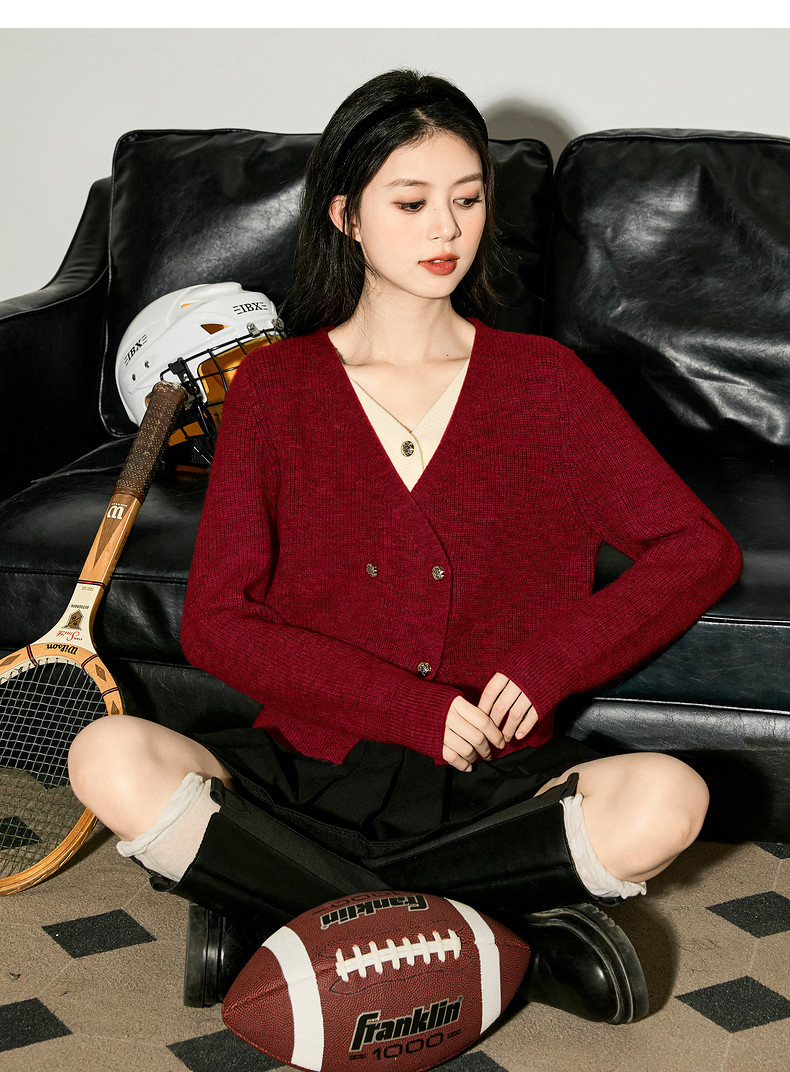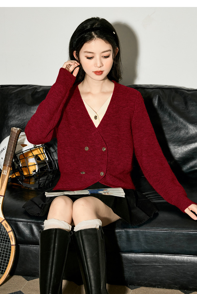 唐狮2024秋冬季新款V领慵懒红色毛衣女假两件设计感套头毛线衫