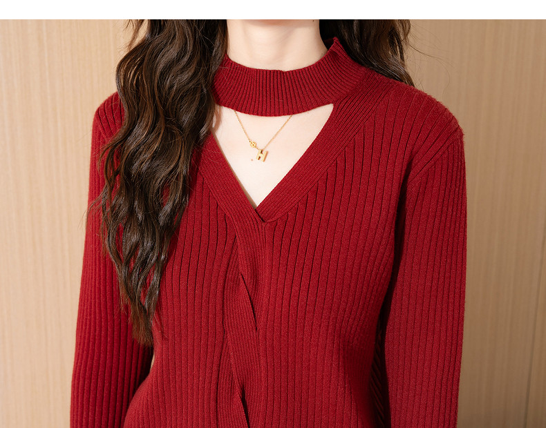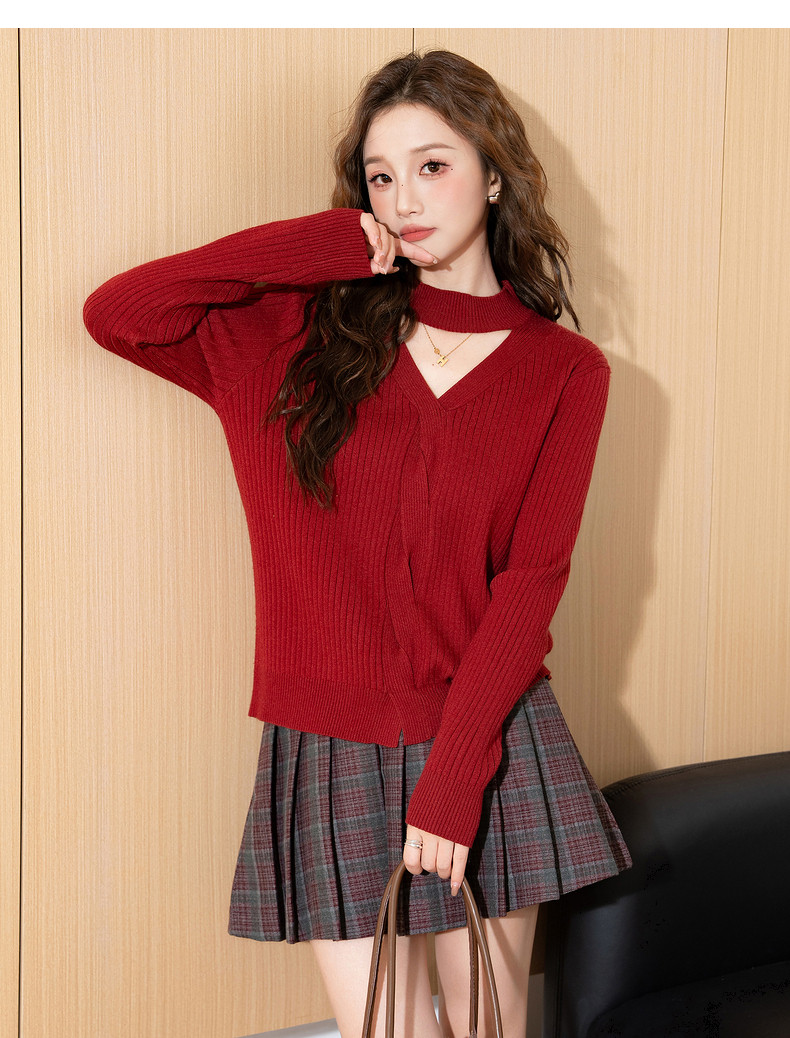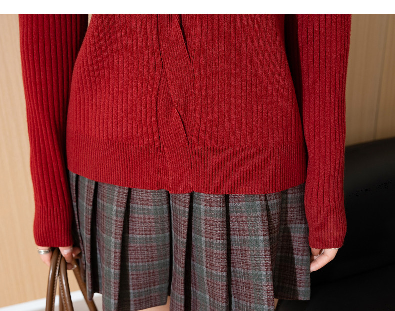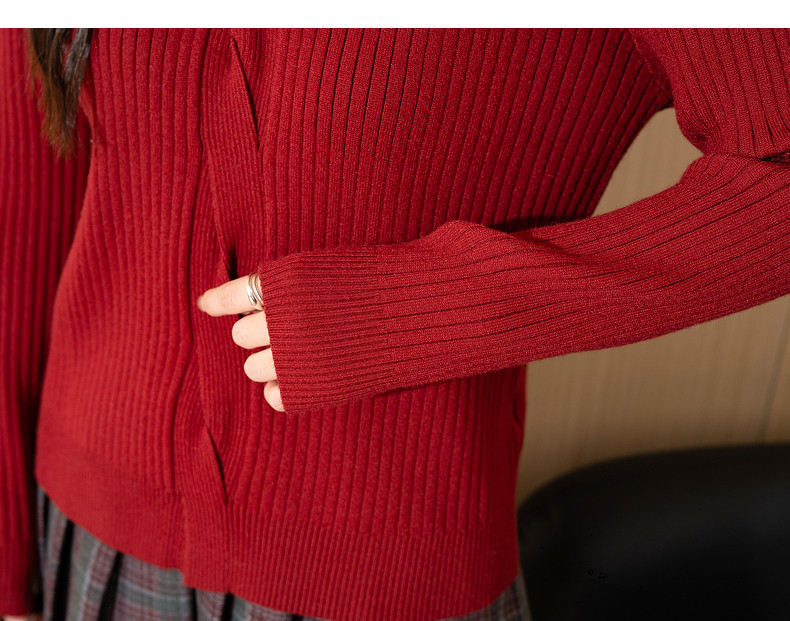 唐狮2024新款秋冬红色毛衣女V领净色超好看小众设计感绞花毛线衫