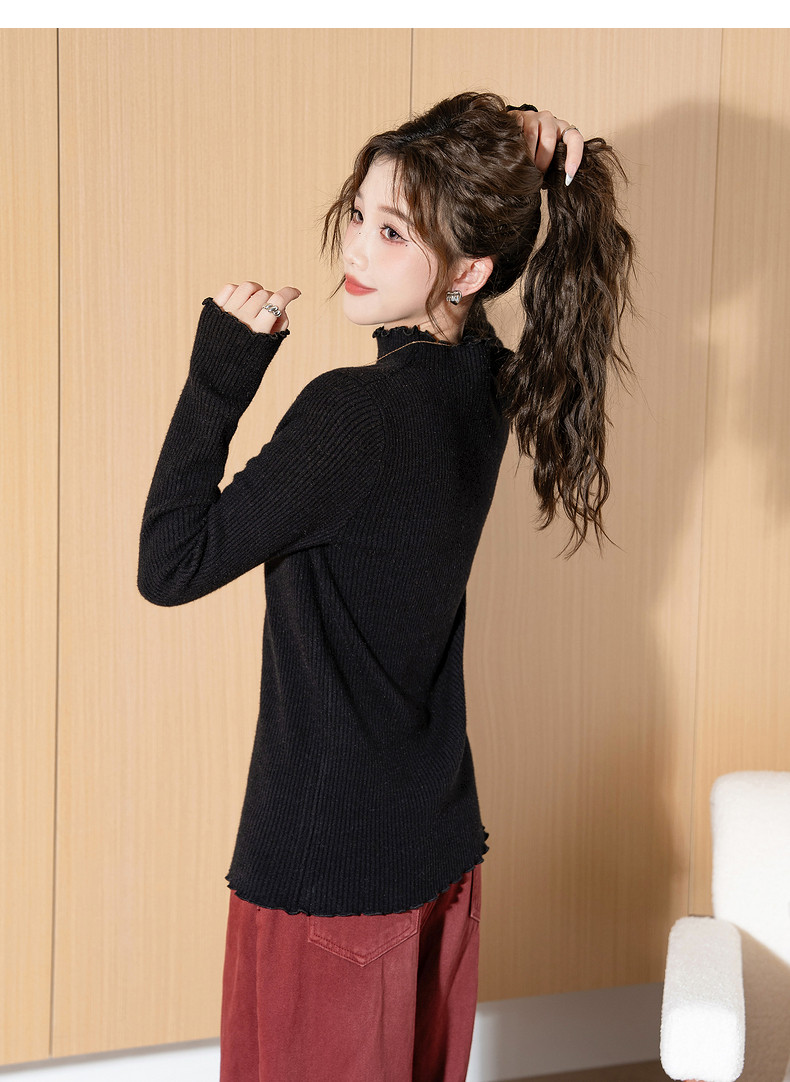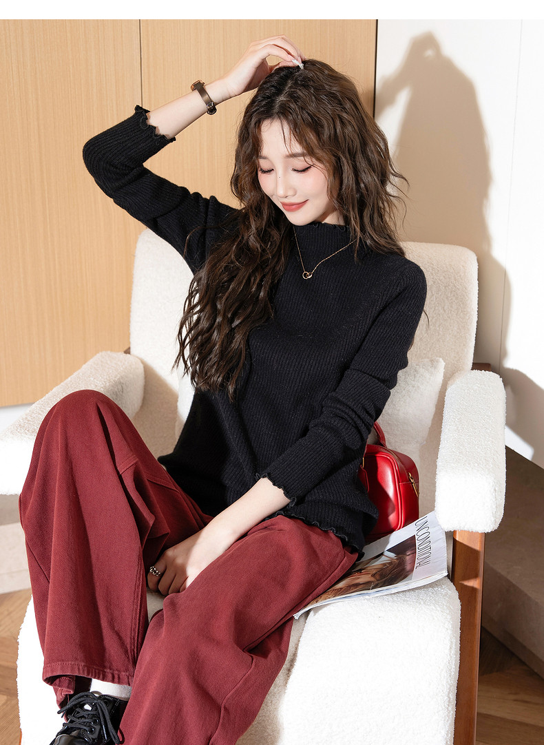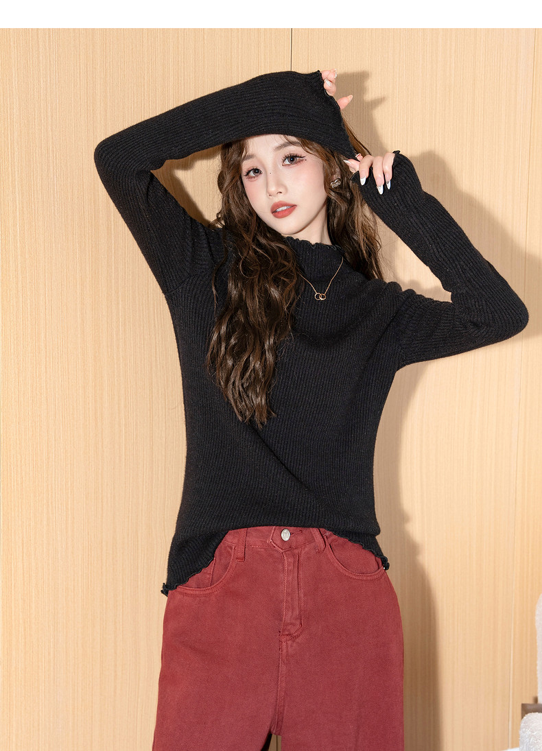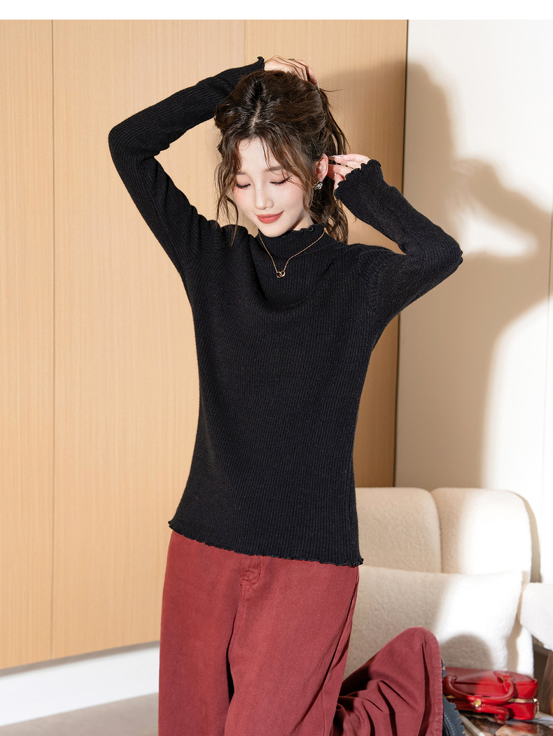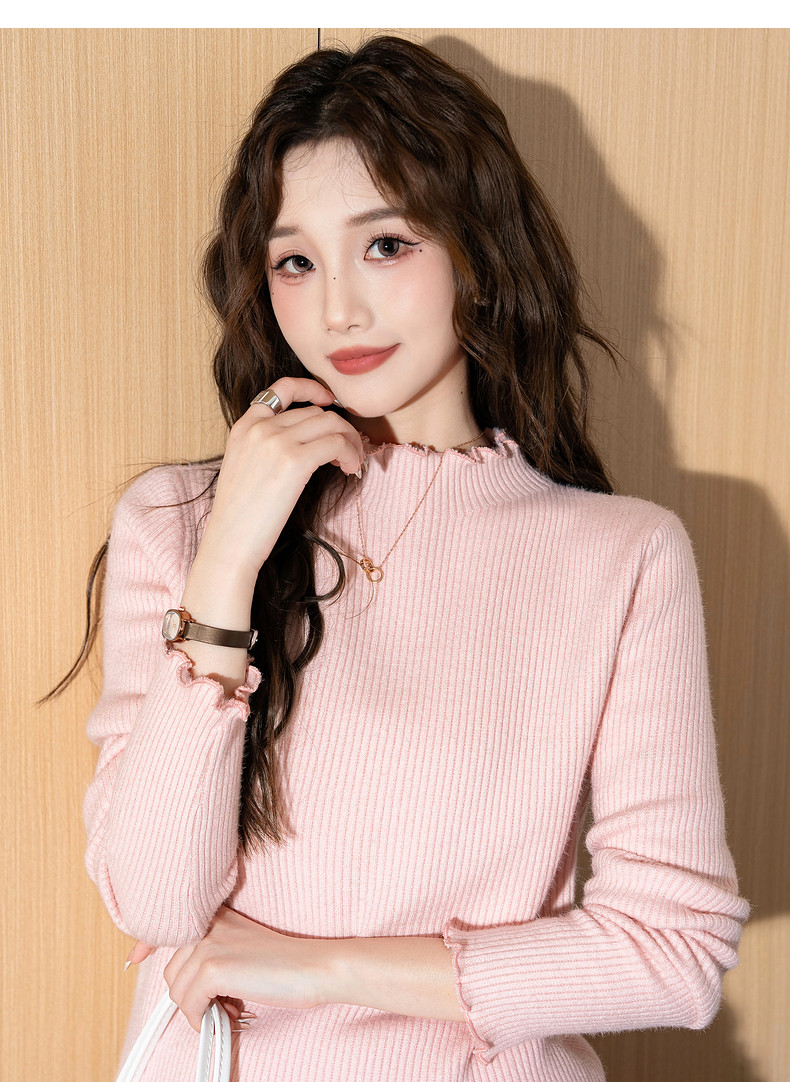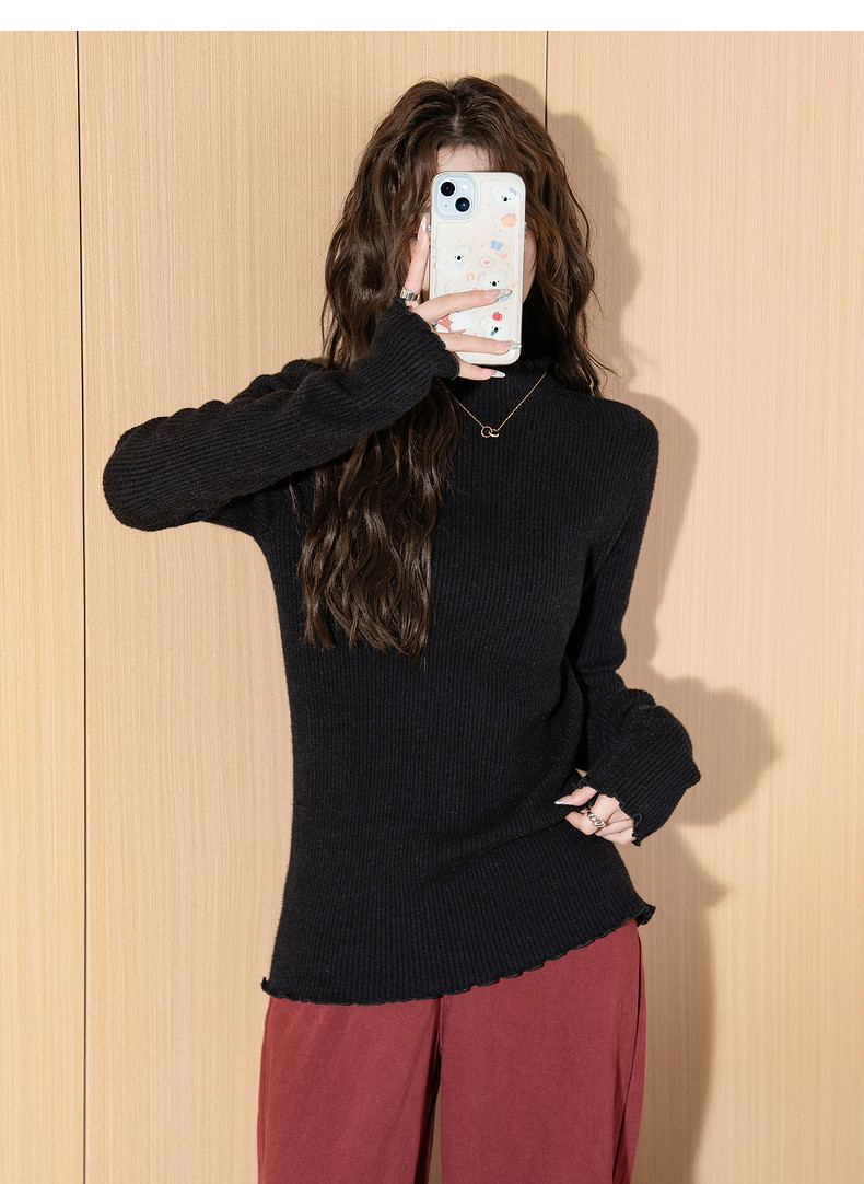 唐狮2024秋冬新款半高领打底衫女木耳领加绒慵懒风高级感百搭毛衣