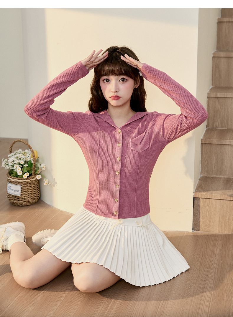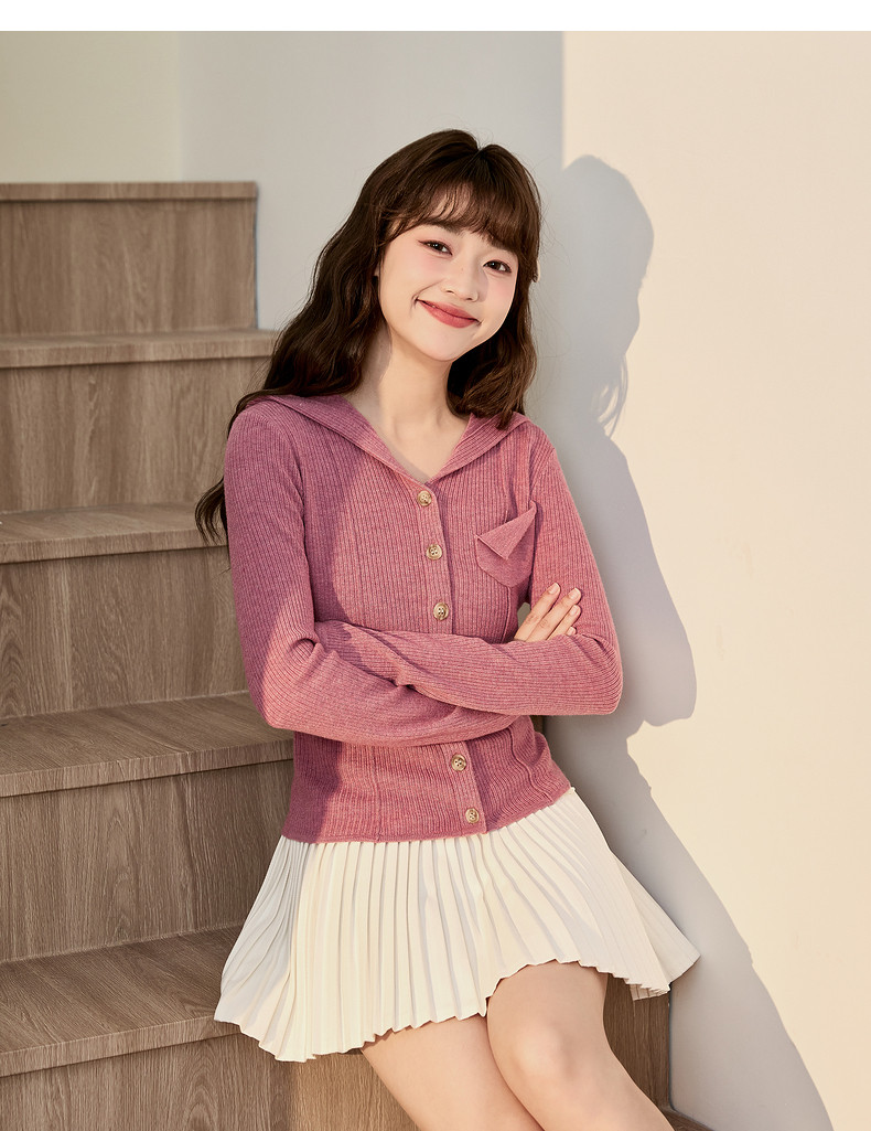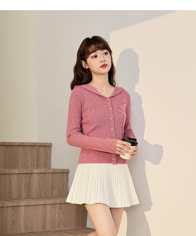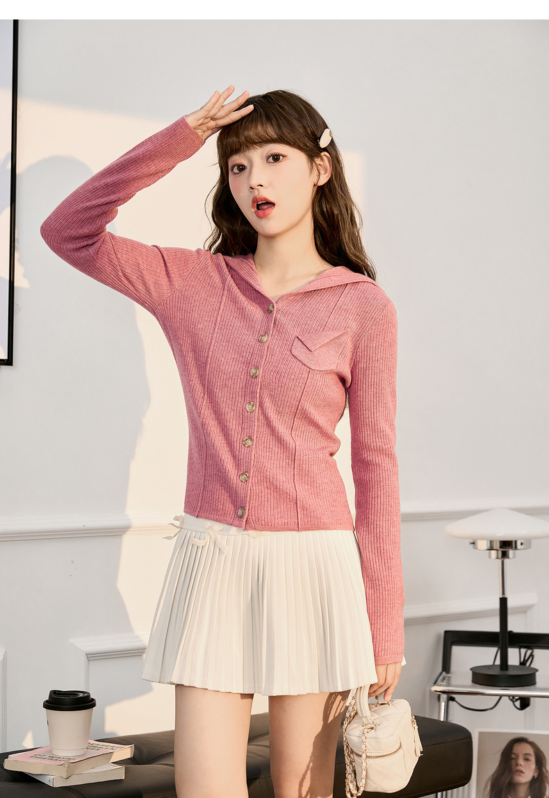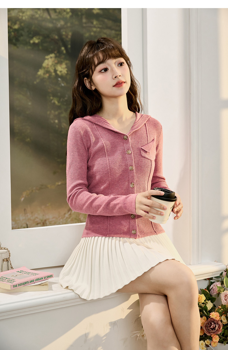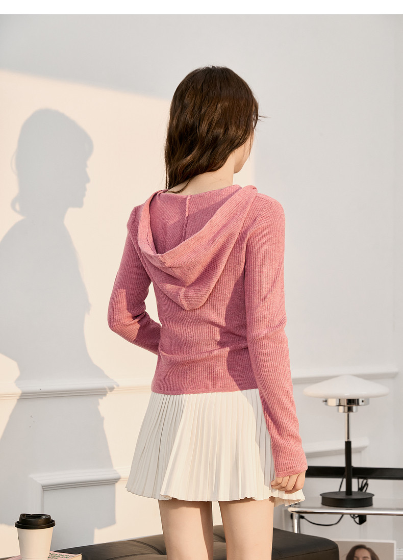 唐狮粉色连帽针织衫女2024早秋新款修身显瘦甜美长袖打底衫设计感