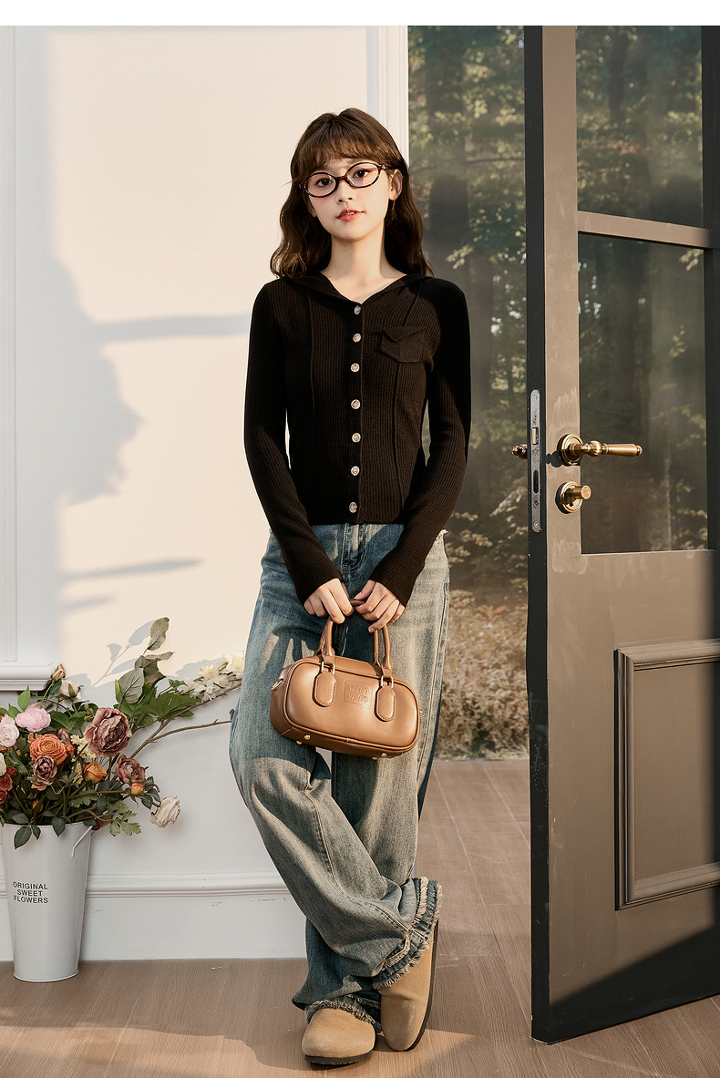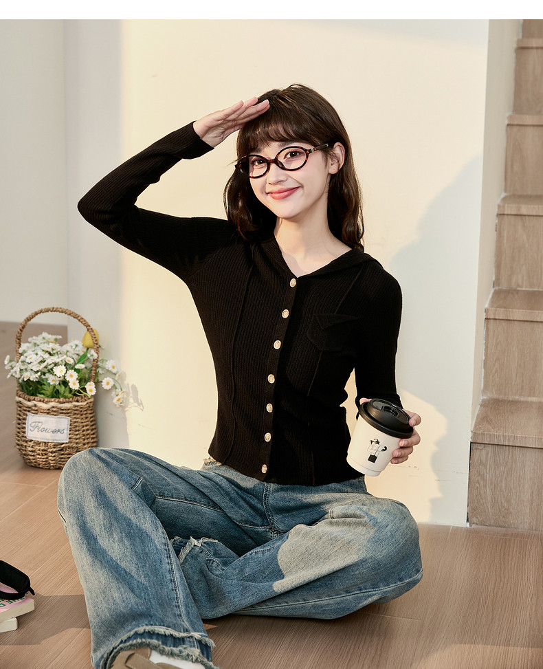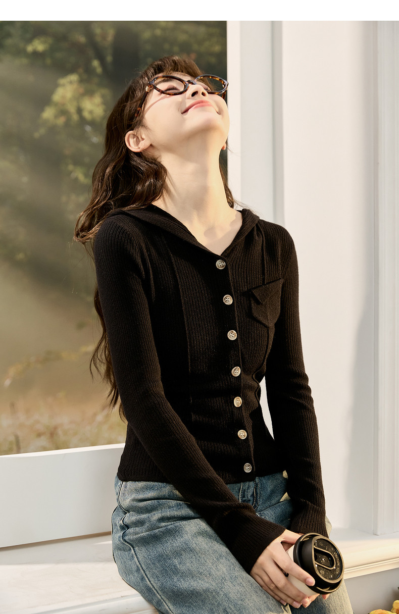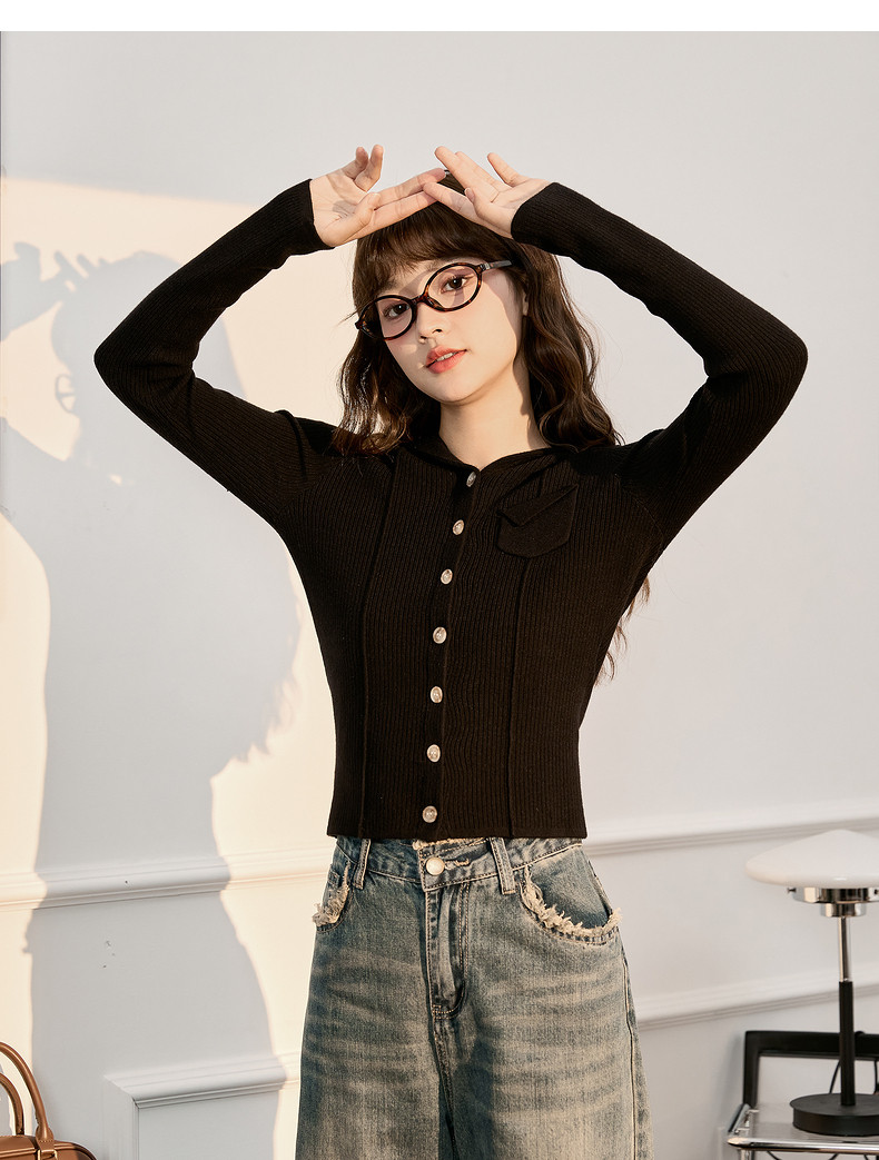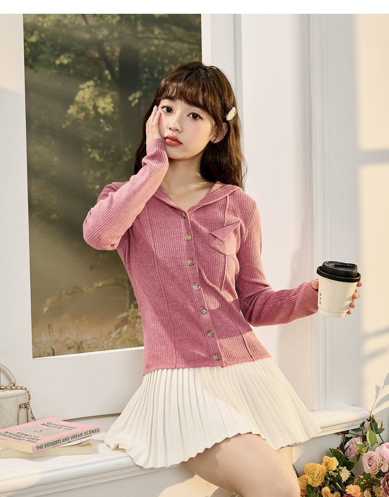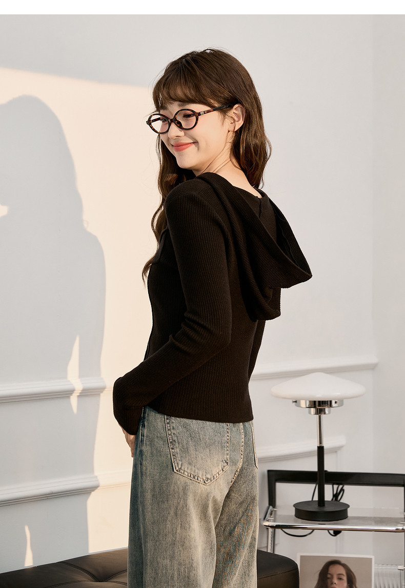 唐狮粉色连帽针织衫女2024早秋新款修身显瘦甜美长袖打底衫设计感