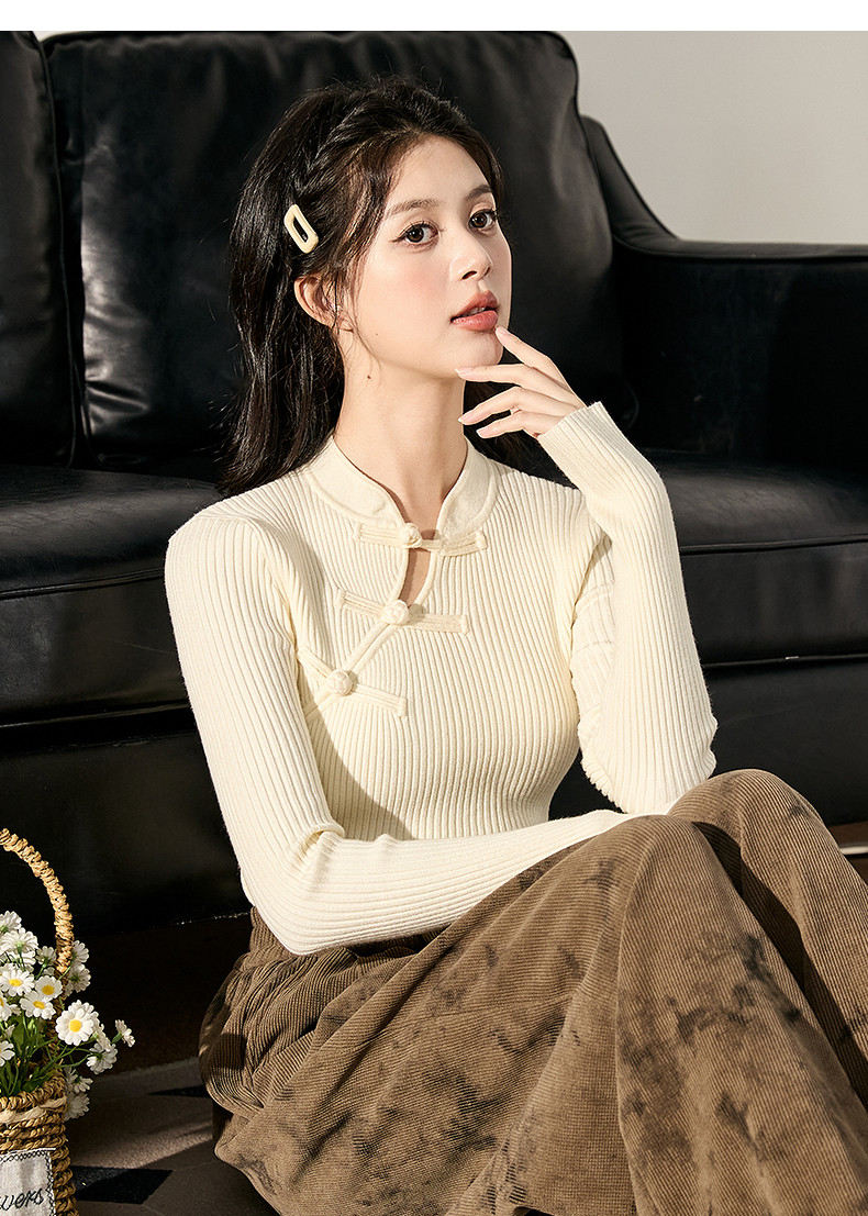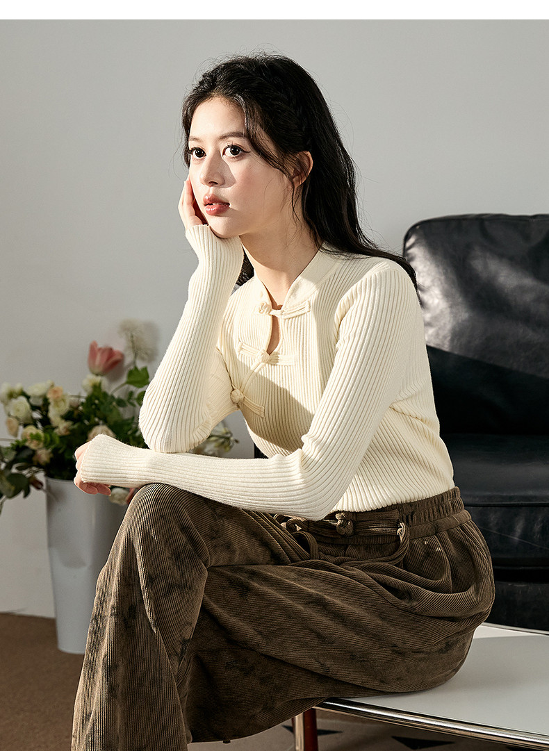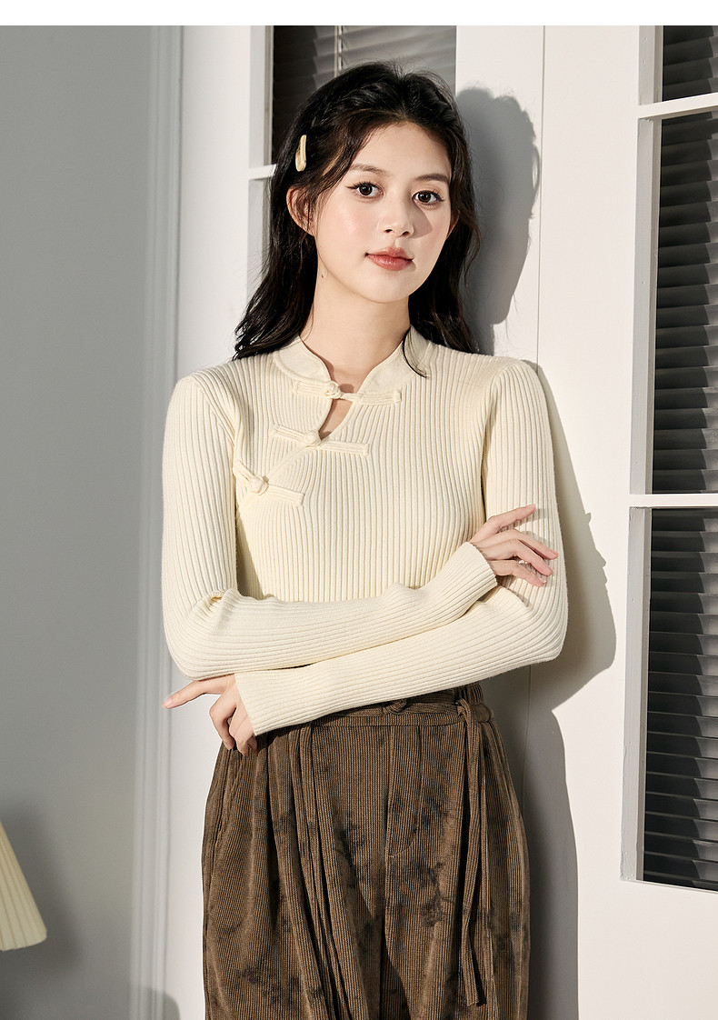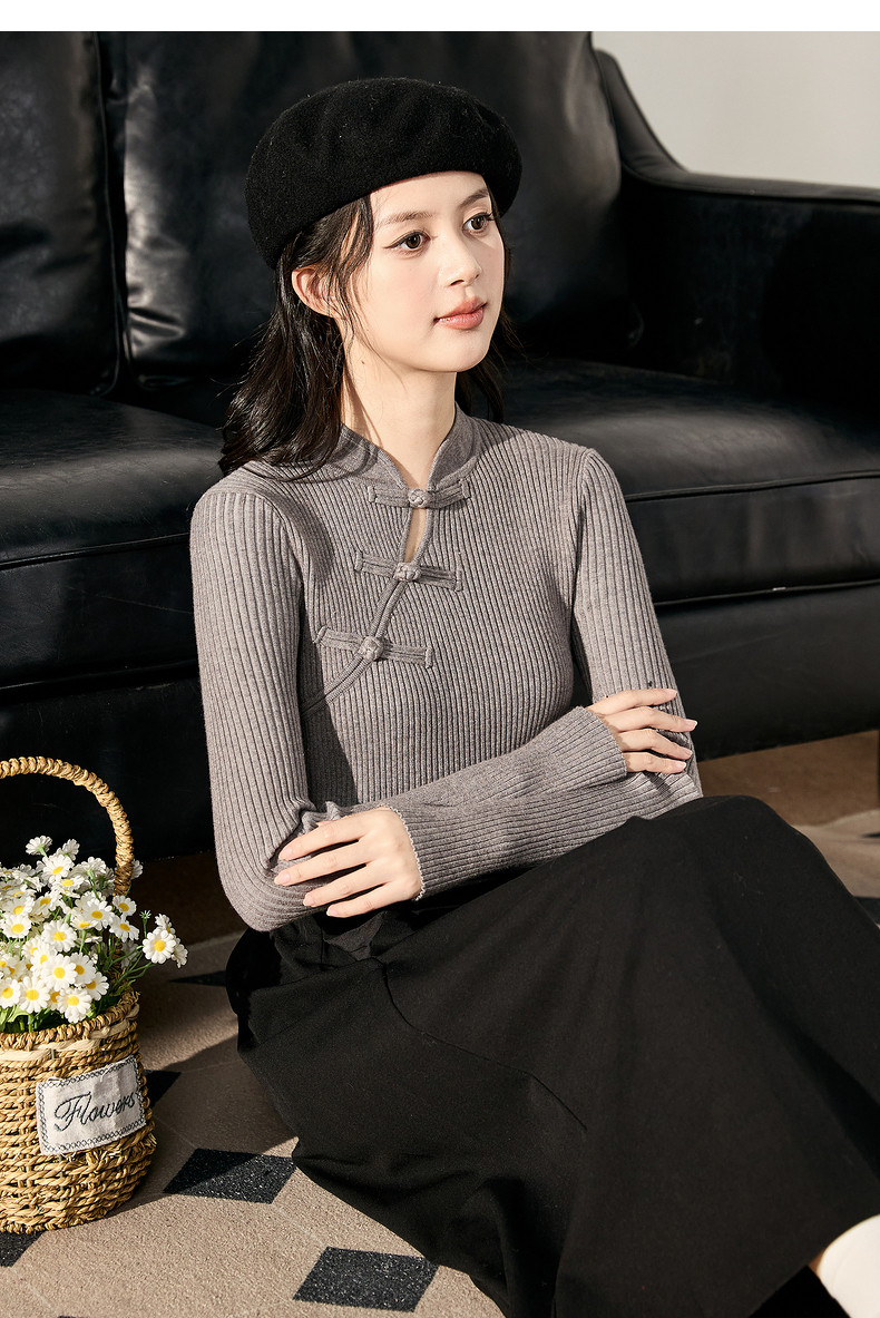 唐狮2024新款秋冬女毛织新中式净色国风盘扣打底衫修身显瘦上衣