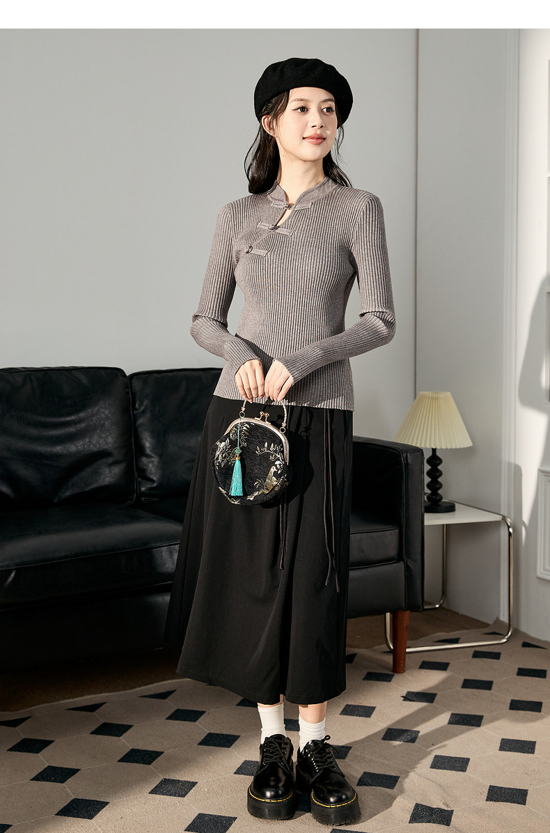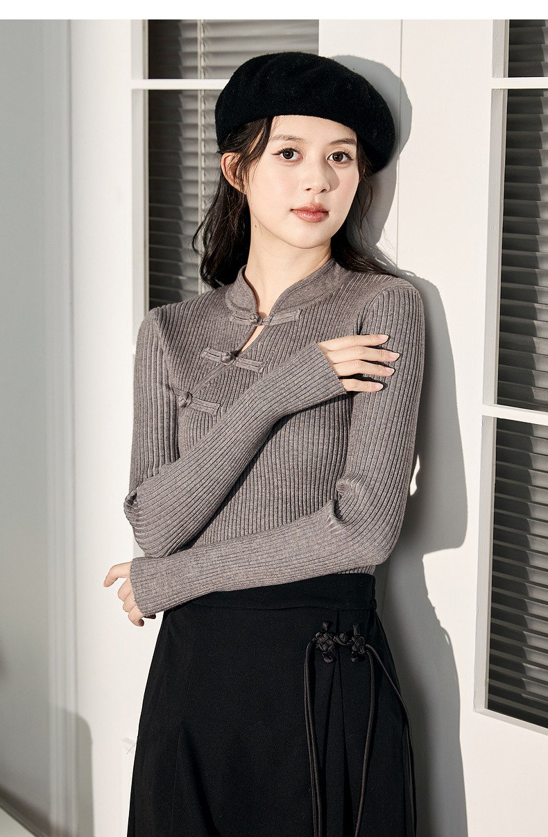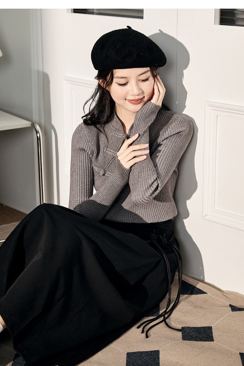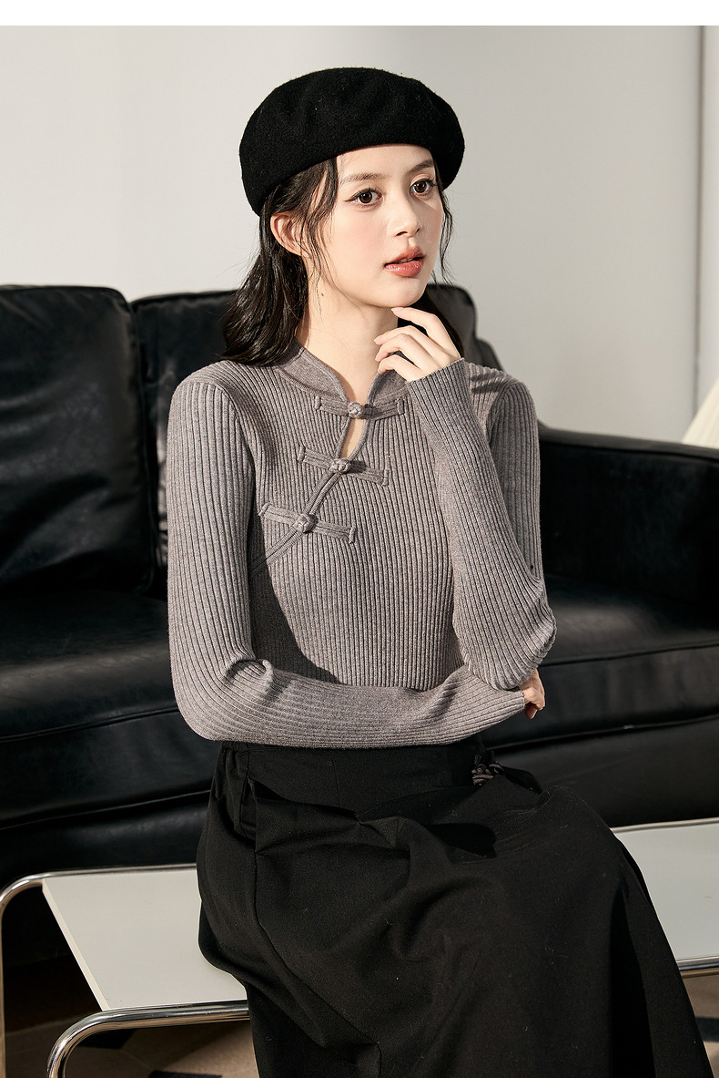 唐狮2024新款秋冬女毛织新中式净色国风盘扣打底衫修身显瘦上衣