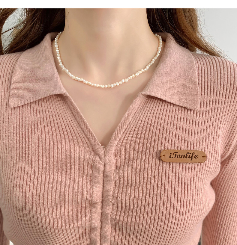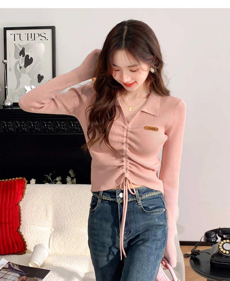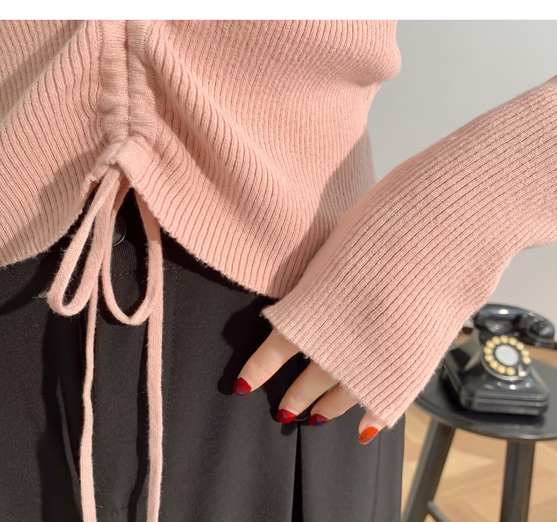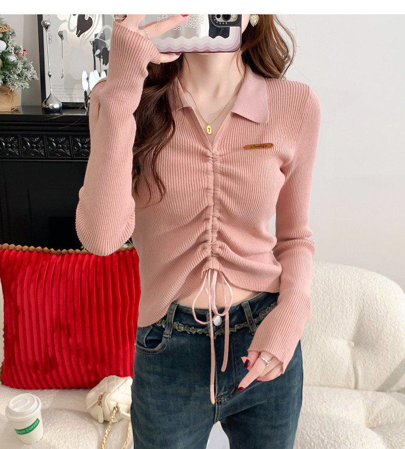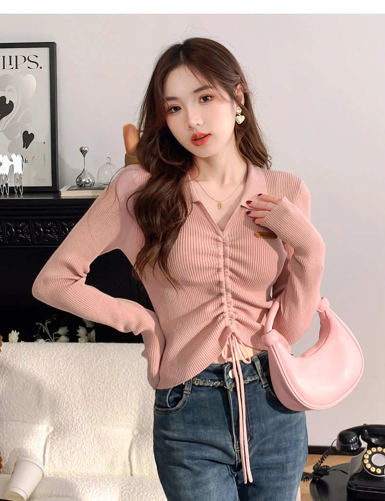 唐狮粉色抽绳翻领针织衫秋冬2024修身短款打底衫女甜辣气质毛衣
