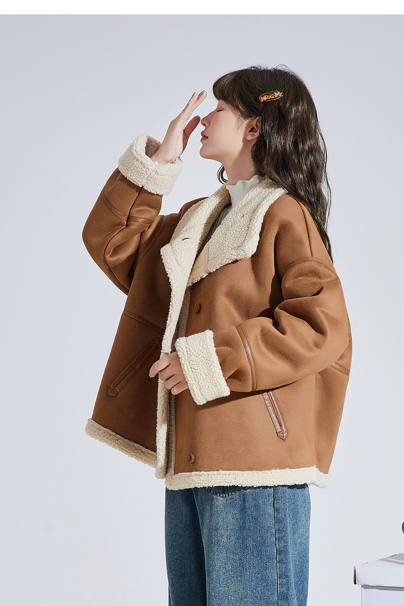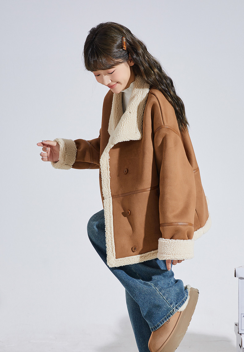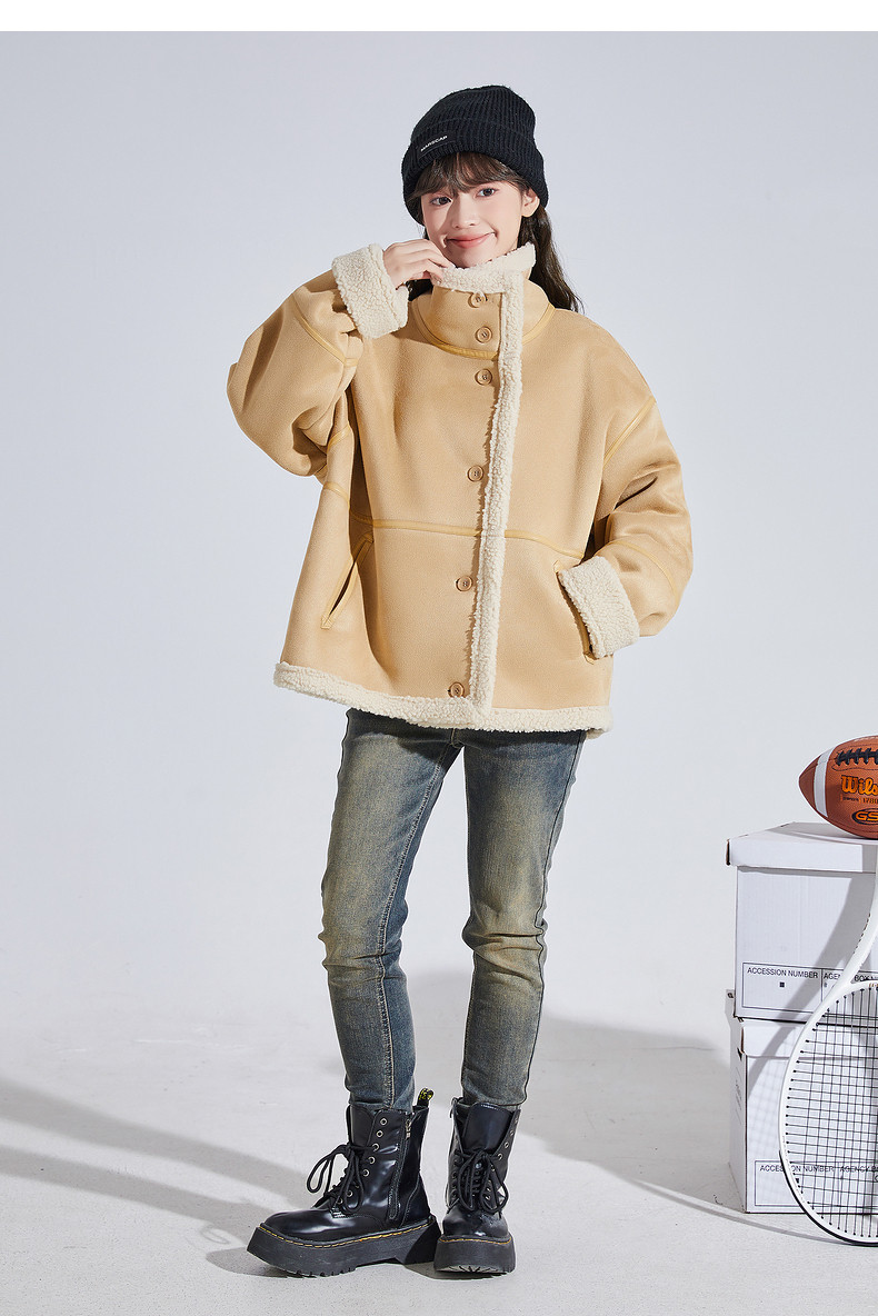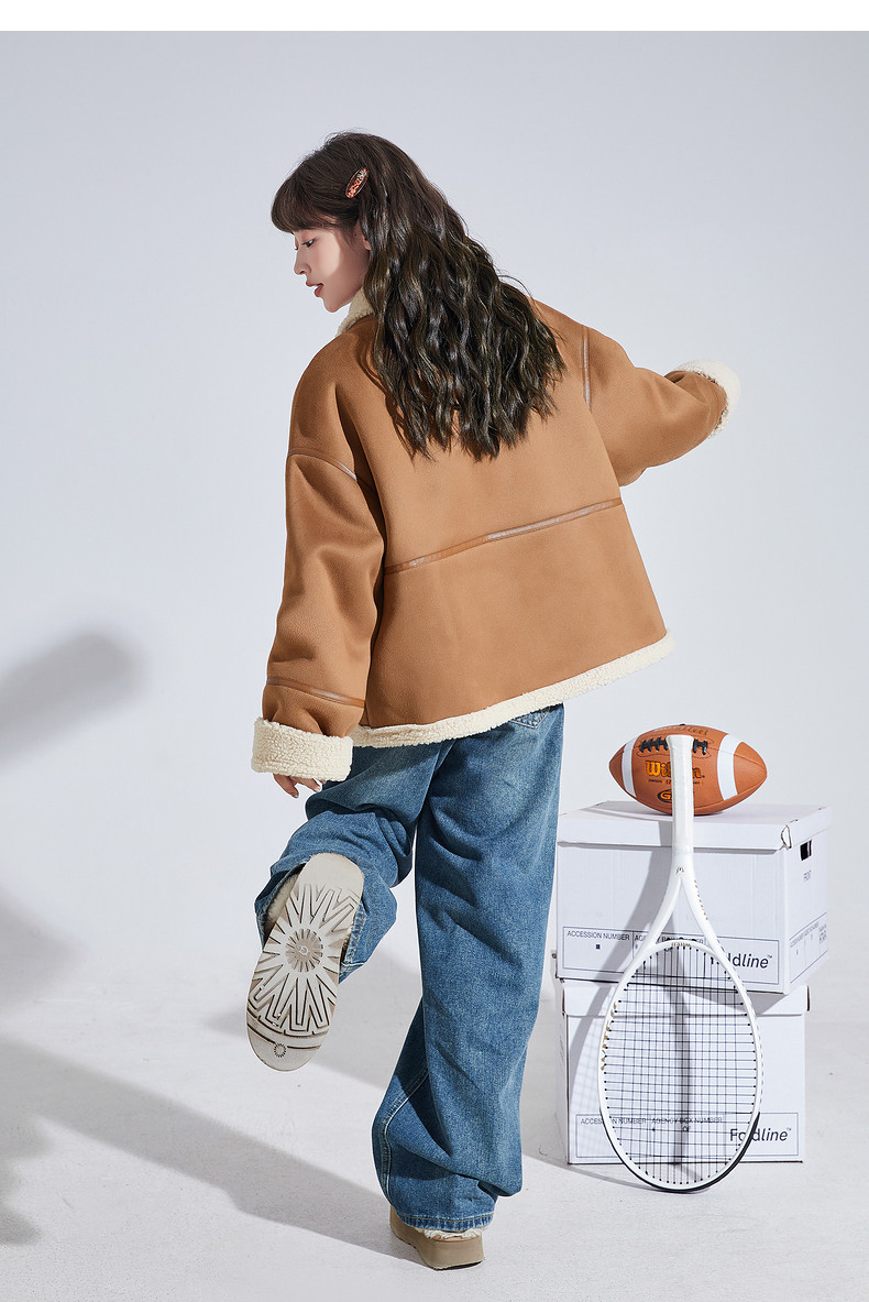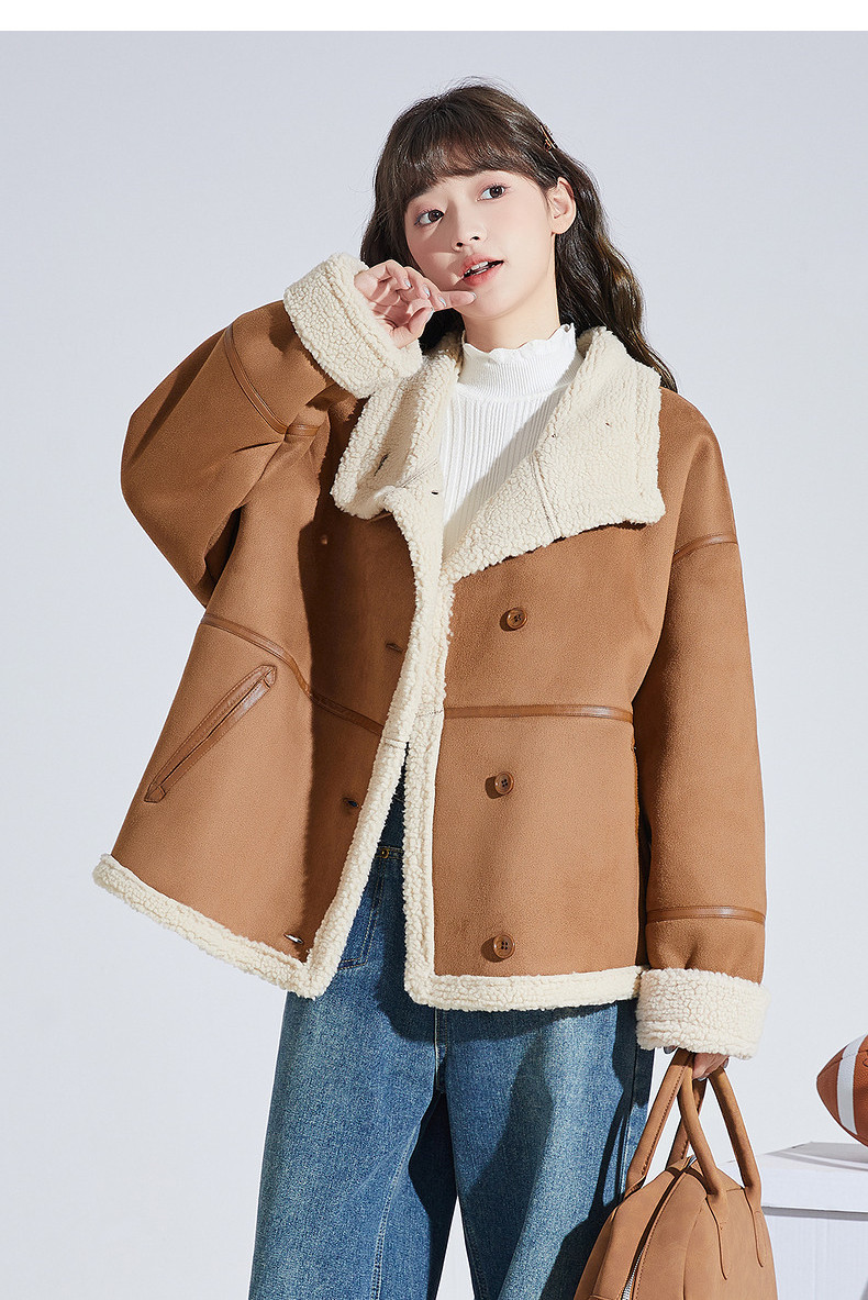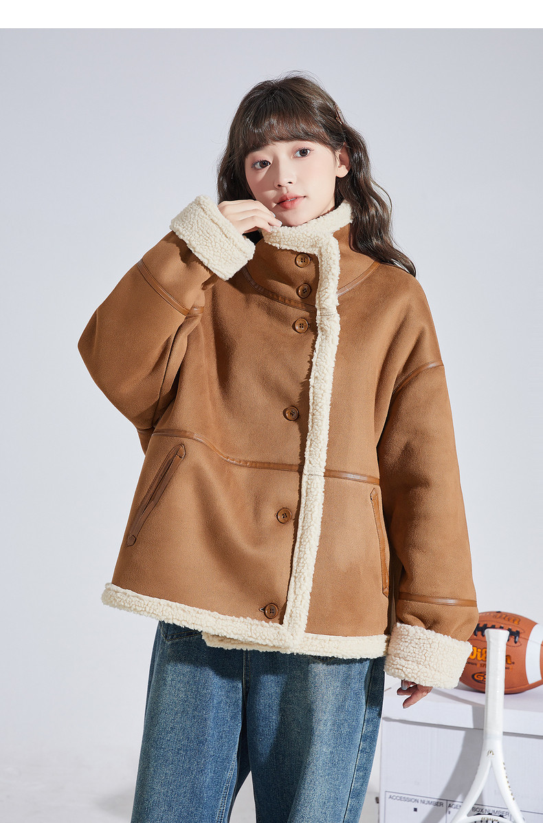 唐狮2024冬季新款韩系外套女立领撞色仿麂皮绒仿羊羔绒短款外套