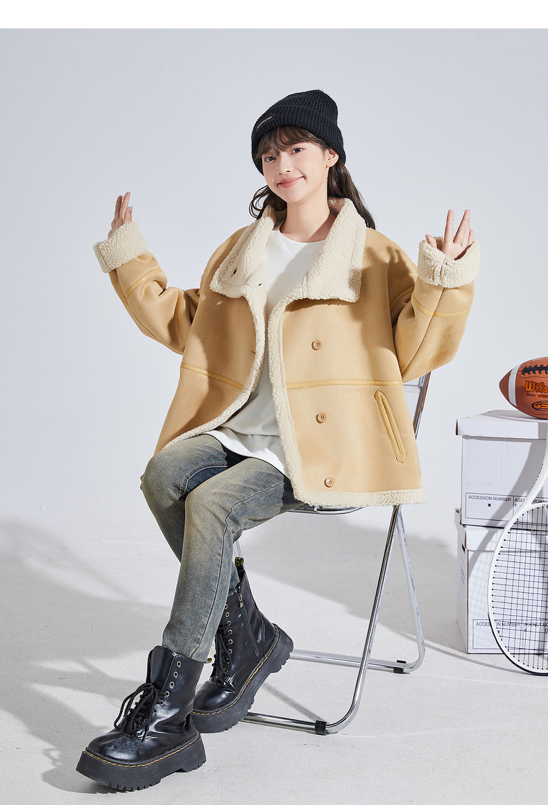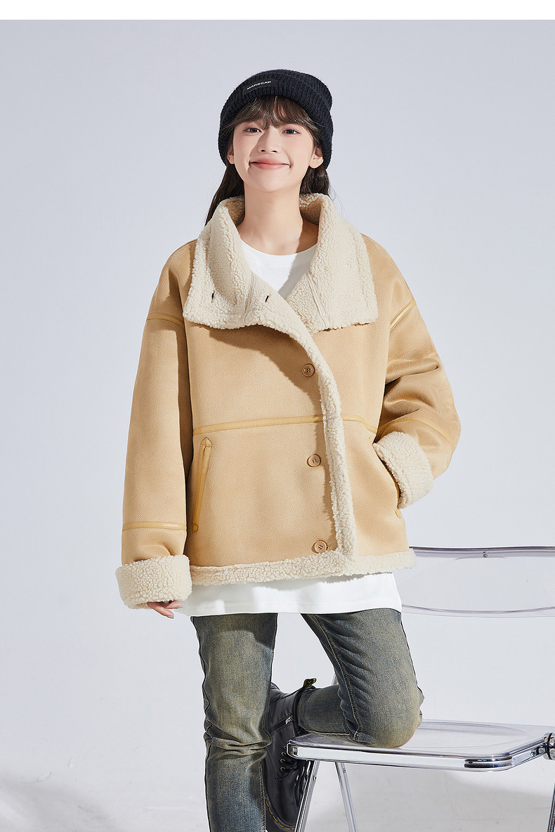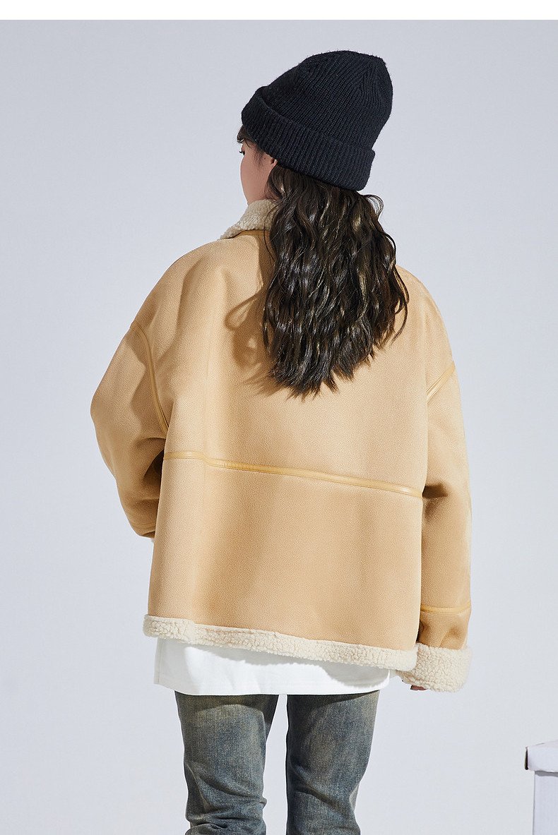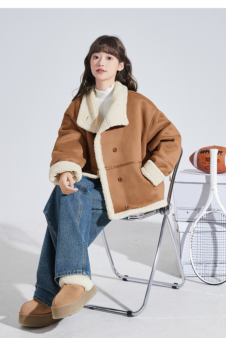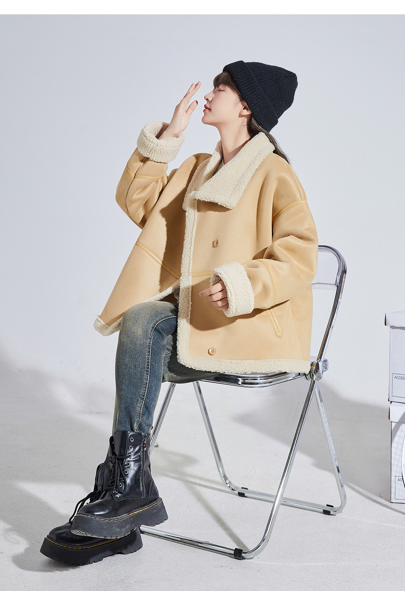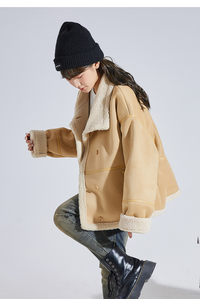 唐狮2024冬季新款韩系外套女立领撞色仿麂皮绒仿羊羔绒短款外套