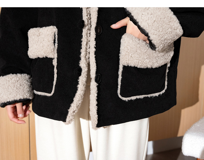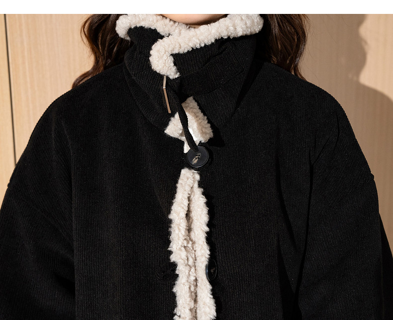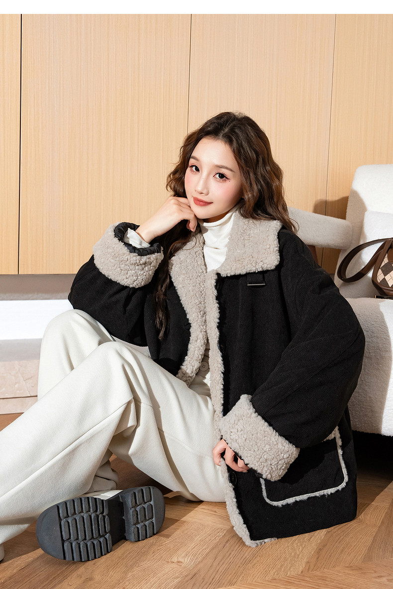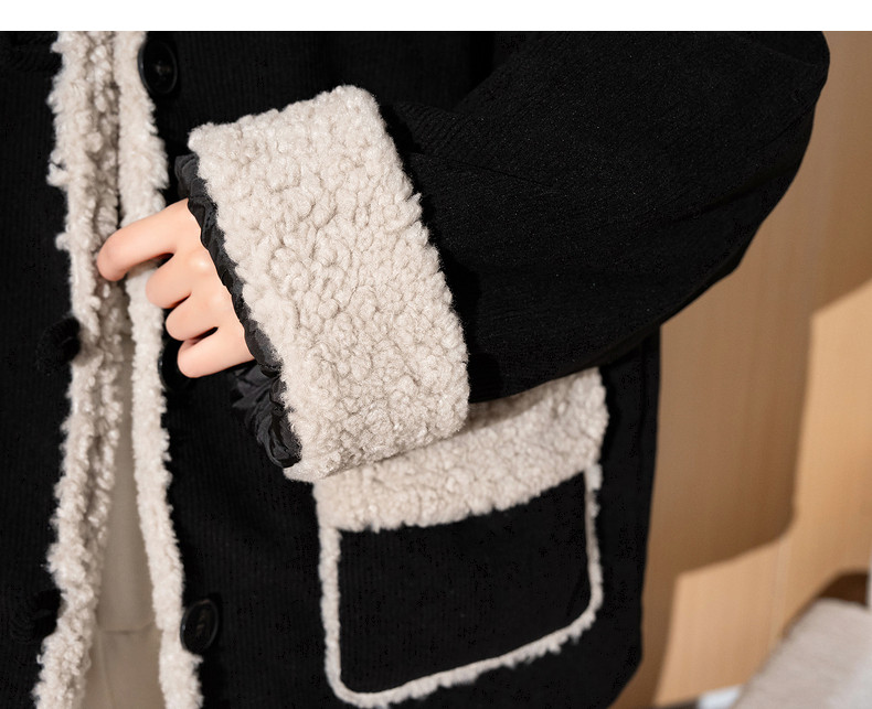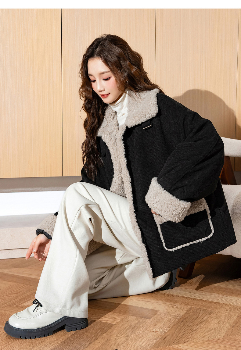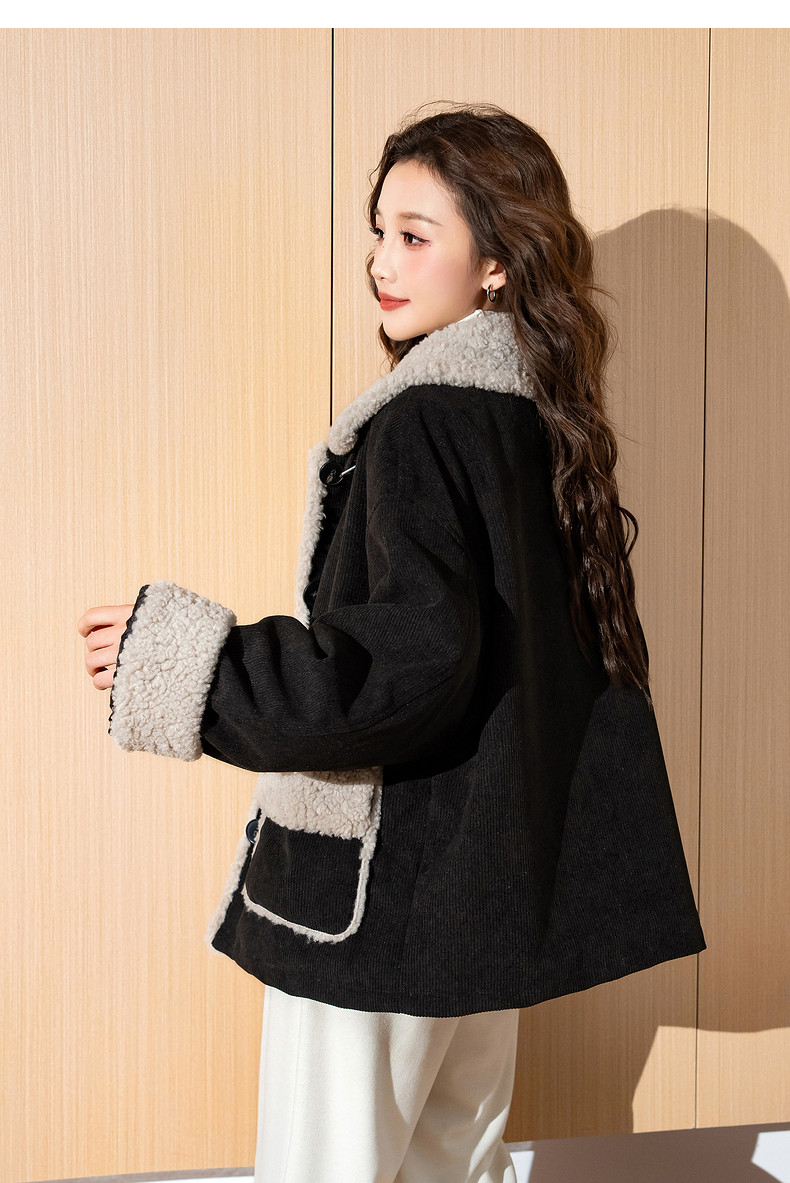 唐狮2024冬季新款外套女翻领灯芯绒拼接仿羊羔毛外套超好看爆款