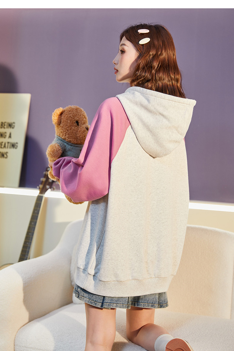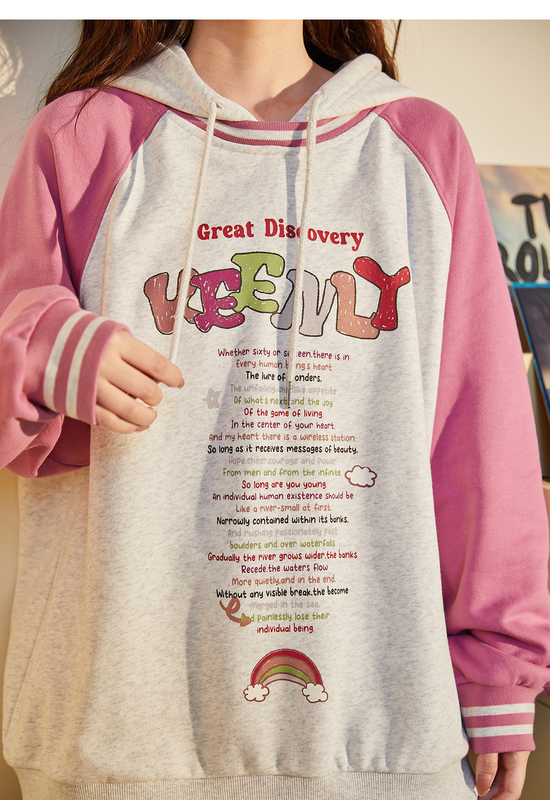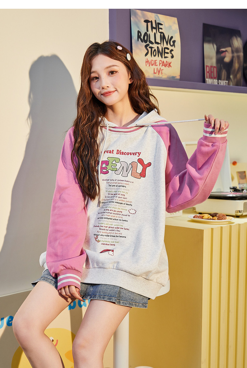 唐狮2024新款女卫衣针织连帽休闲拼接ins长袖女士插肩袖撞色卫衣