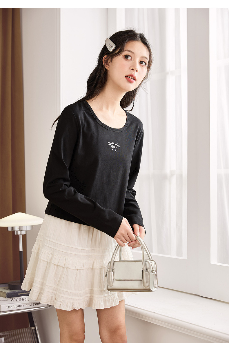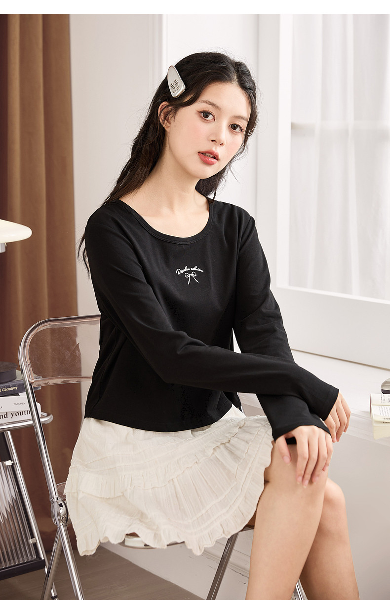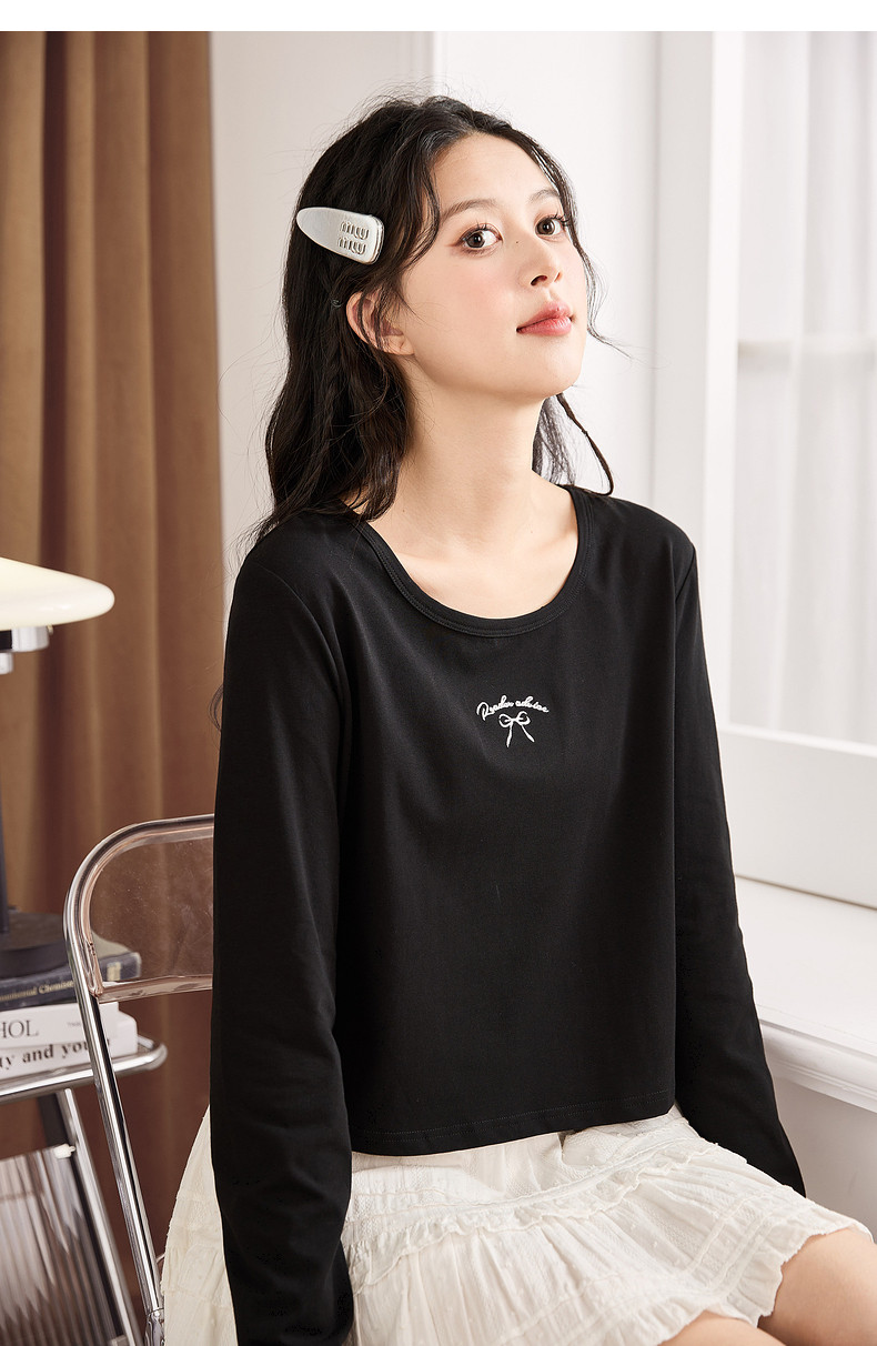 唐狮2024秋季新款短款长袖T恤女韩系百搭内搭甜美上衣女黑色显瘦