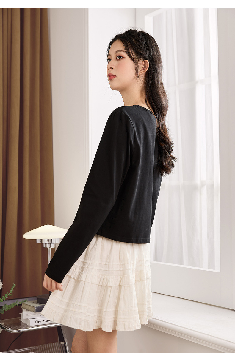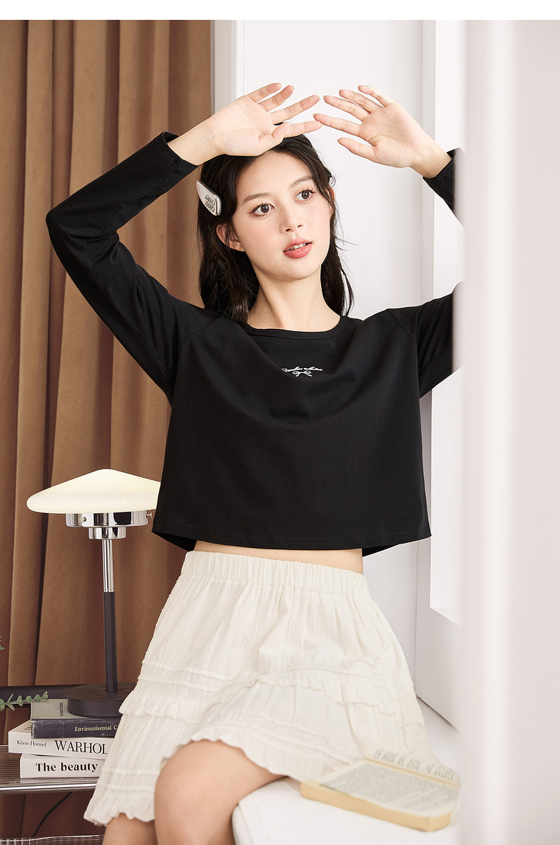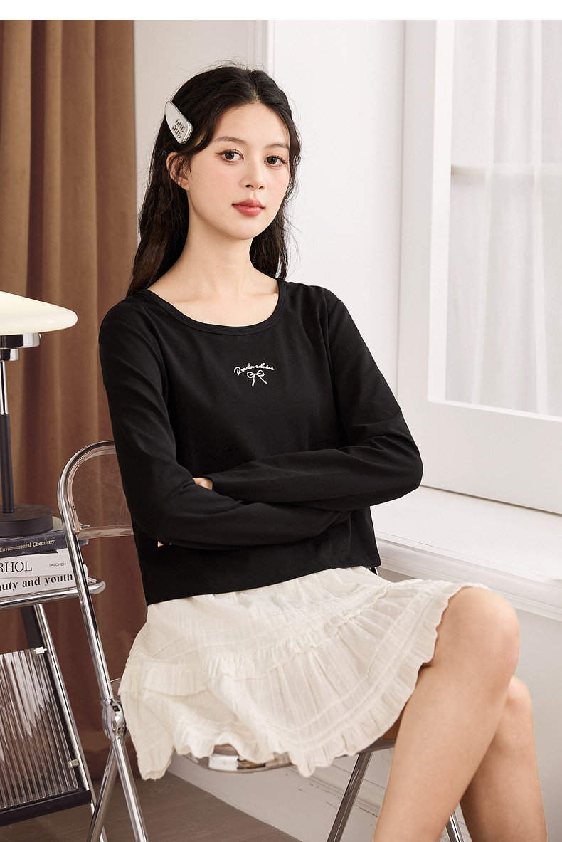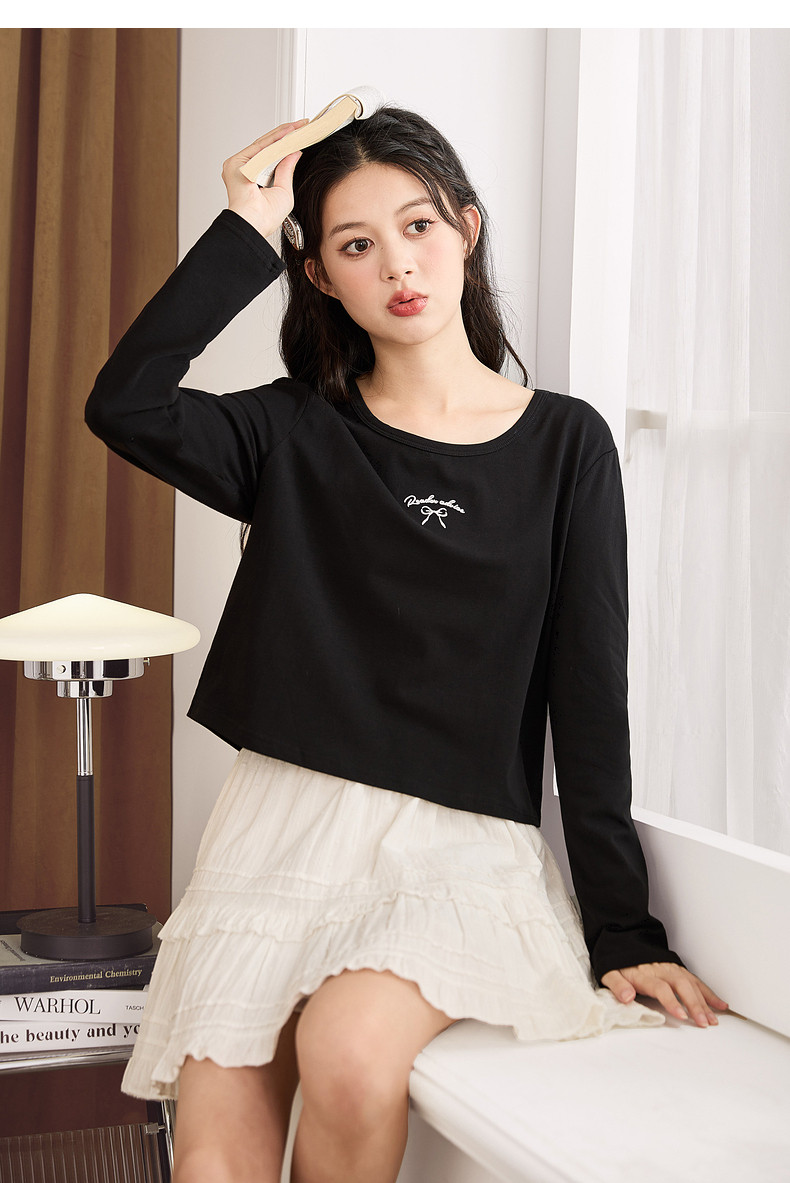 唐狮2024秋季新款短款长袖T恤女韩系百搭内搭甜美上衣女黑色显瘦