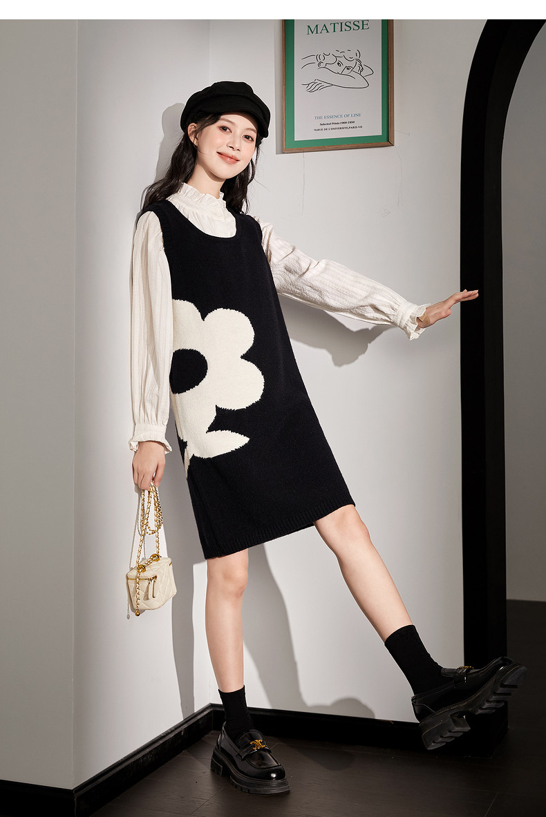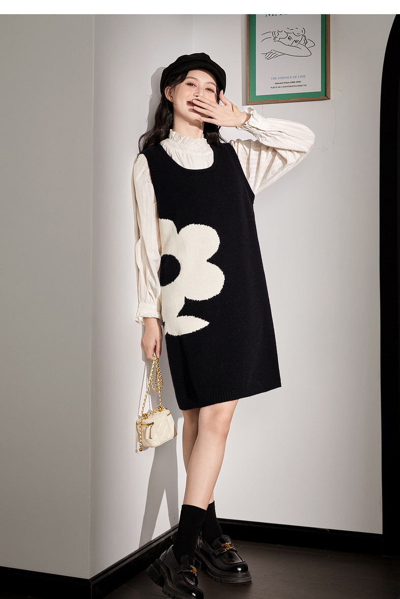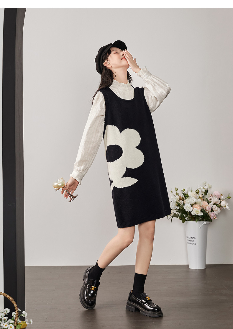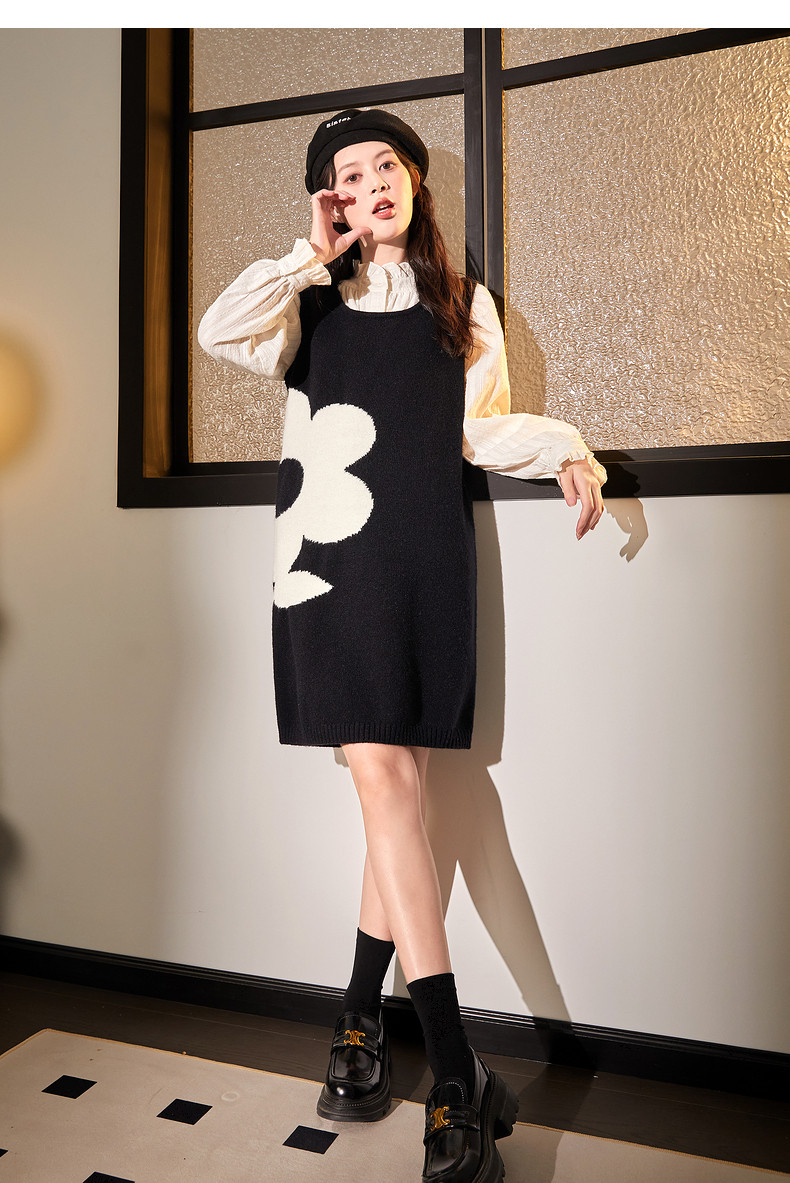唐狮黑色花朵背心裙女小个子入秋连衣裙秋冬季背带裙毛衣马甲裙y6