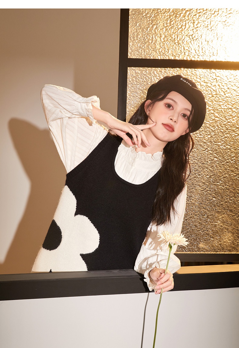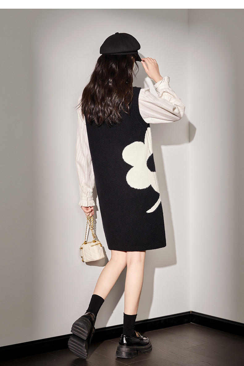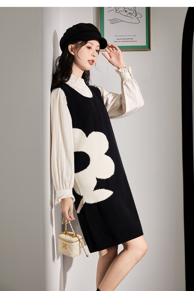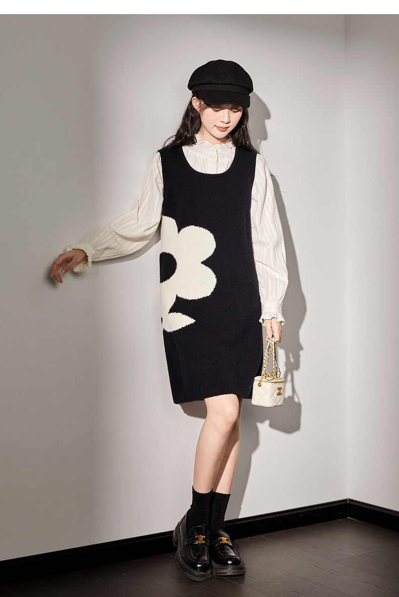 唐狮黑色花朵背心裙女小个子入秋连衣裙秋冬季背带裙毛衣马甲裙y6