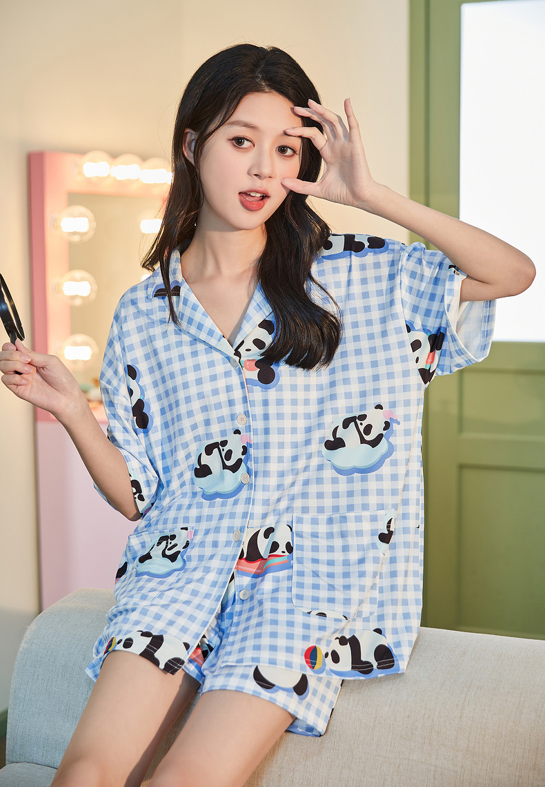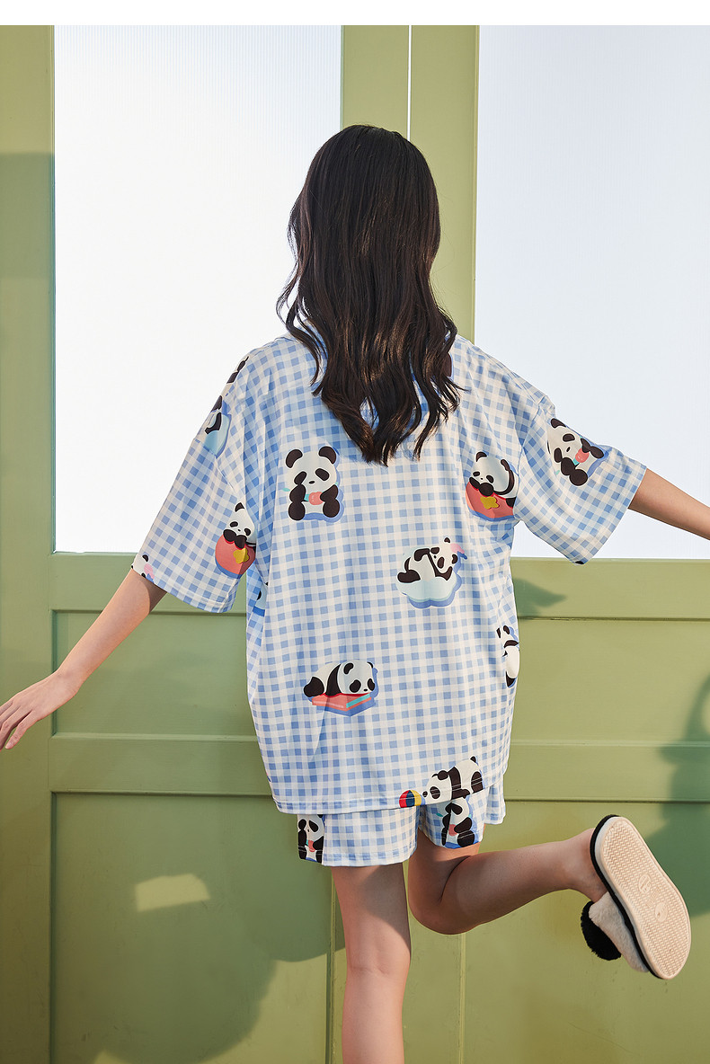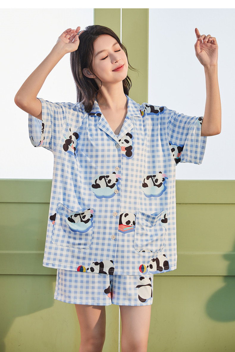 唐狮新款睡衣女夏季可爱熊猫满印短袖短裤薄款可外穿家居服套装女