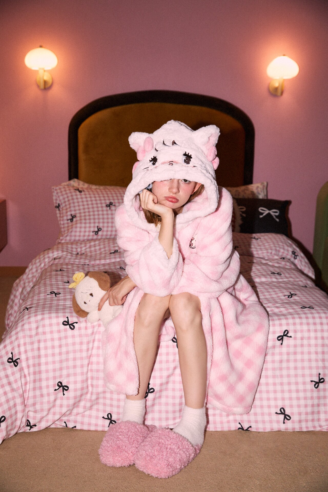 【Gukoo果壳】Mikko系列冬款睡衣女粉色格纹甜美女士家居服连帽睡袍
