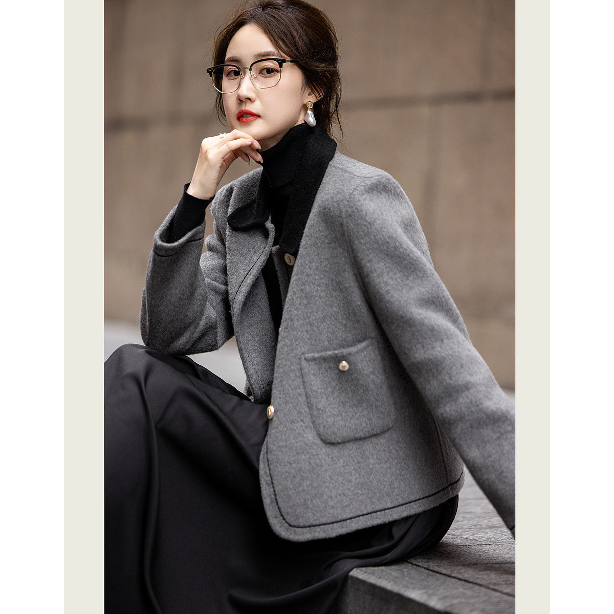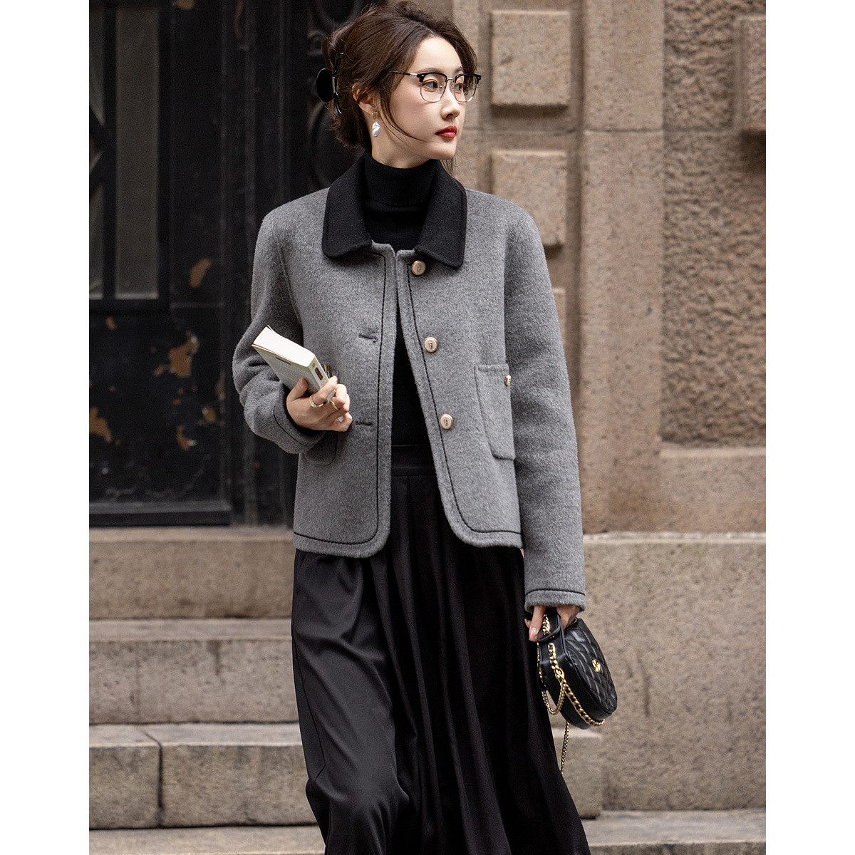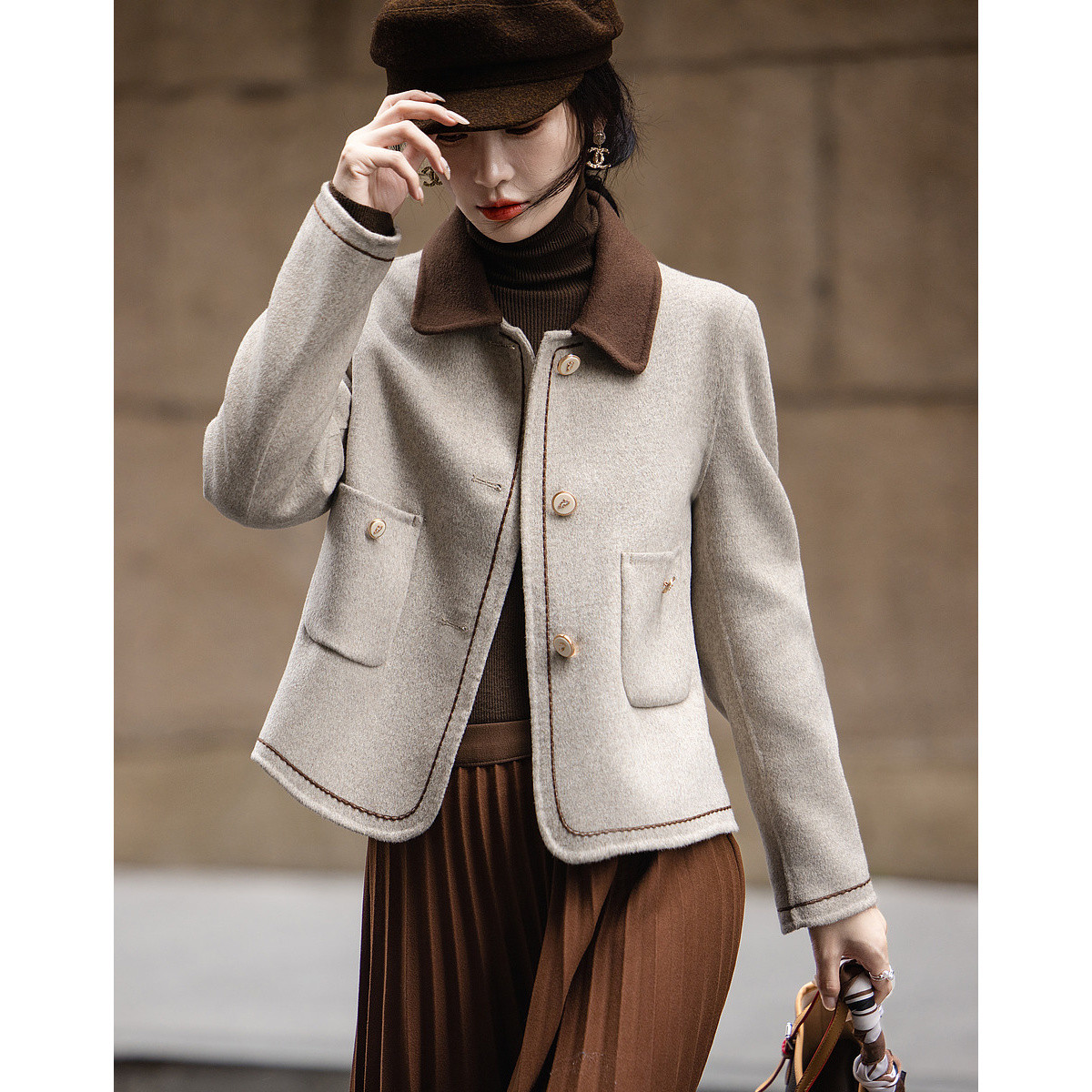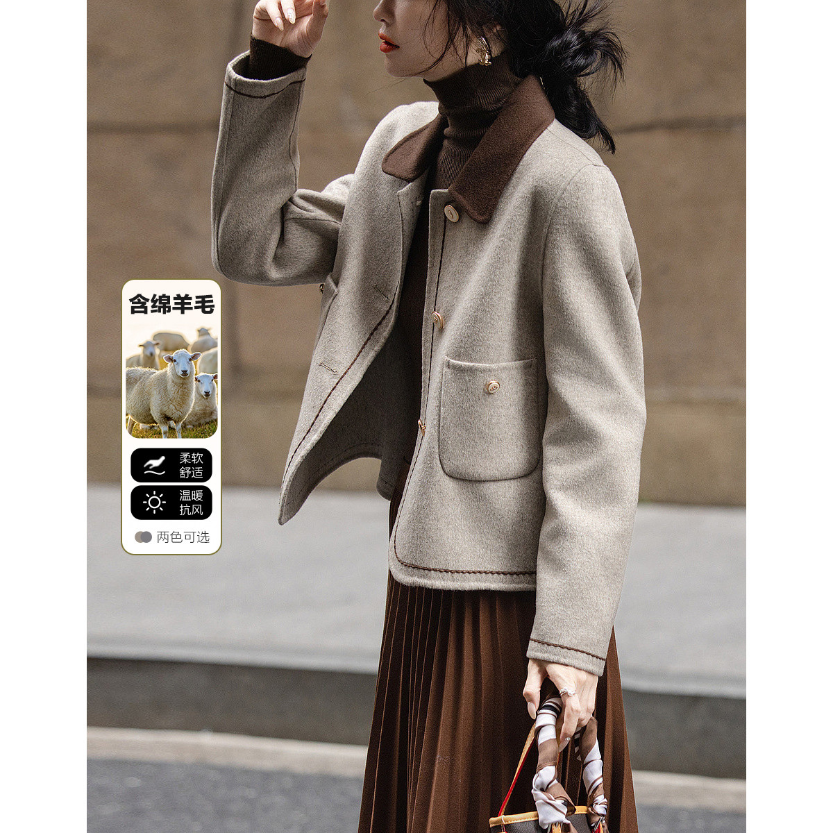 【雪野一梦】冬季静奢撞色翻领氧感绵羊毛双面呢绣线大衣女短外套
