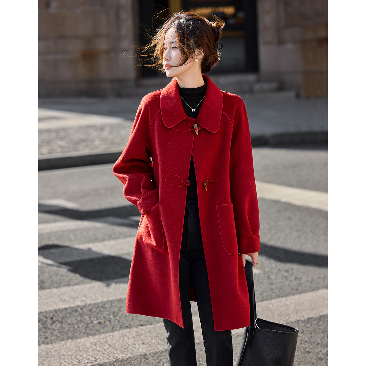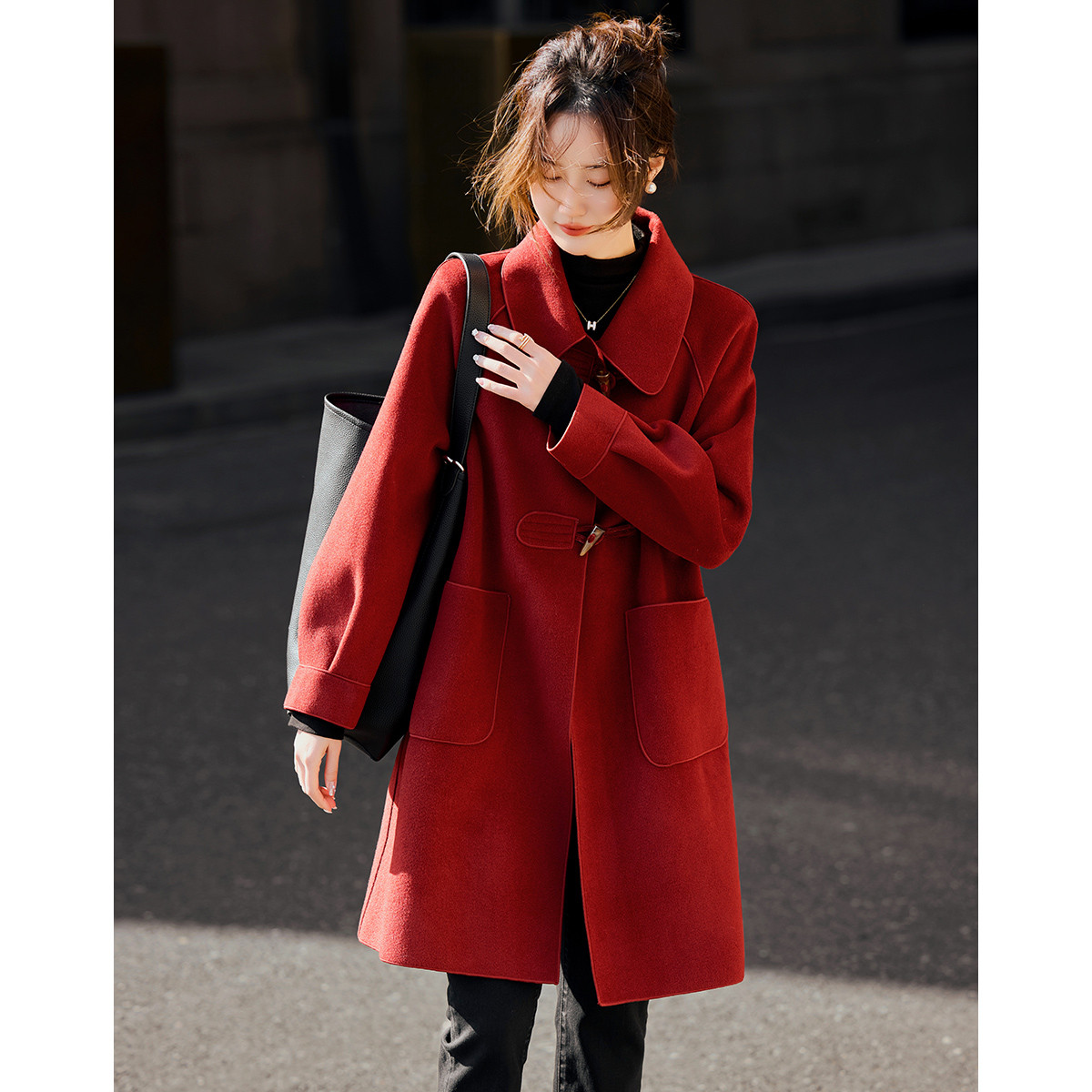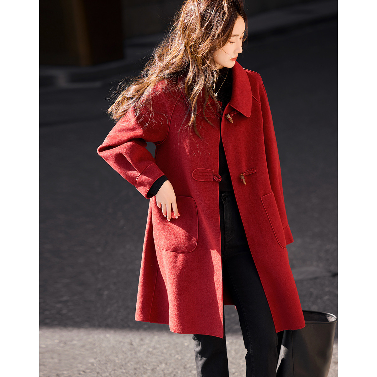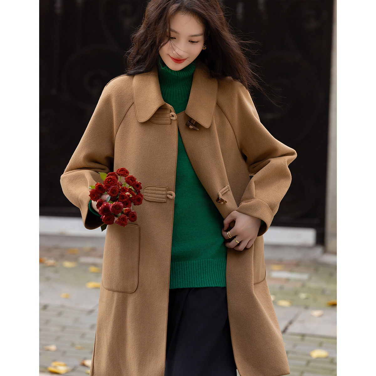 【韩剧女主穿搭】冬季静奢老钱风牛角扣大贴袋遮肉中长大衣外套女