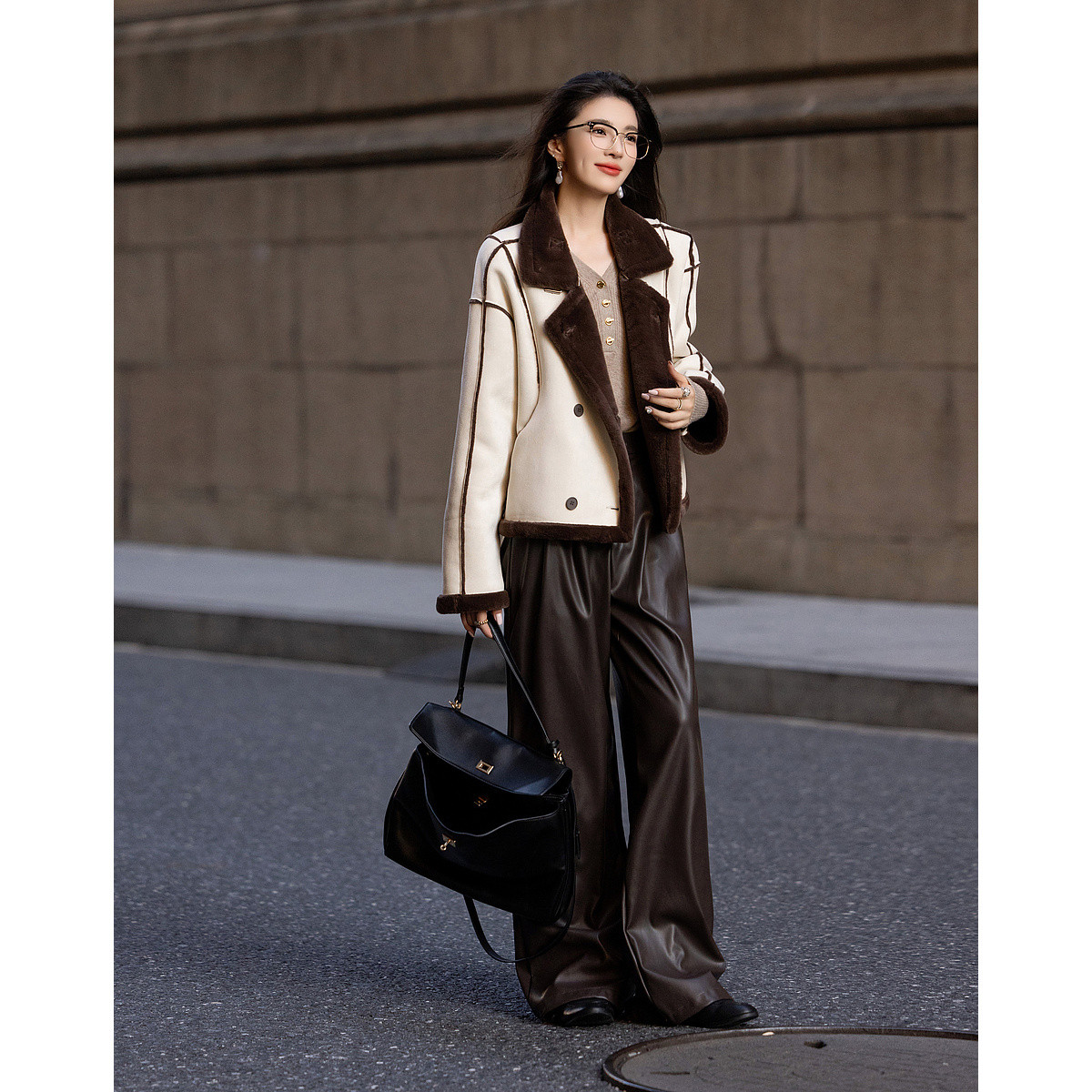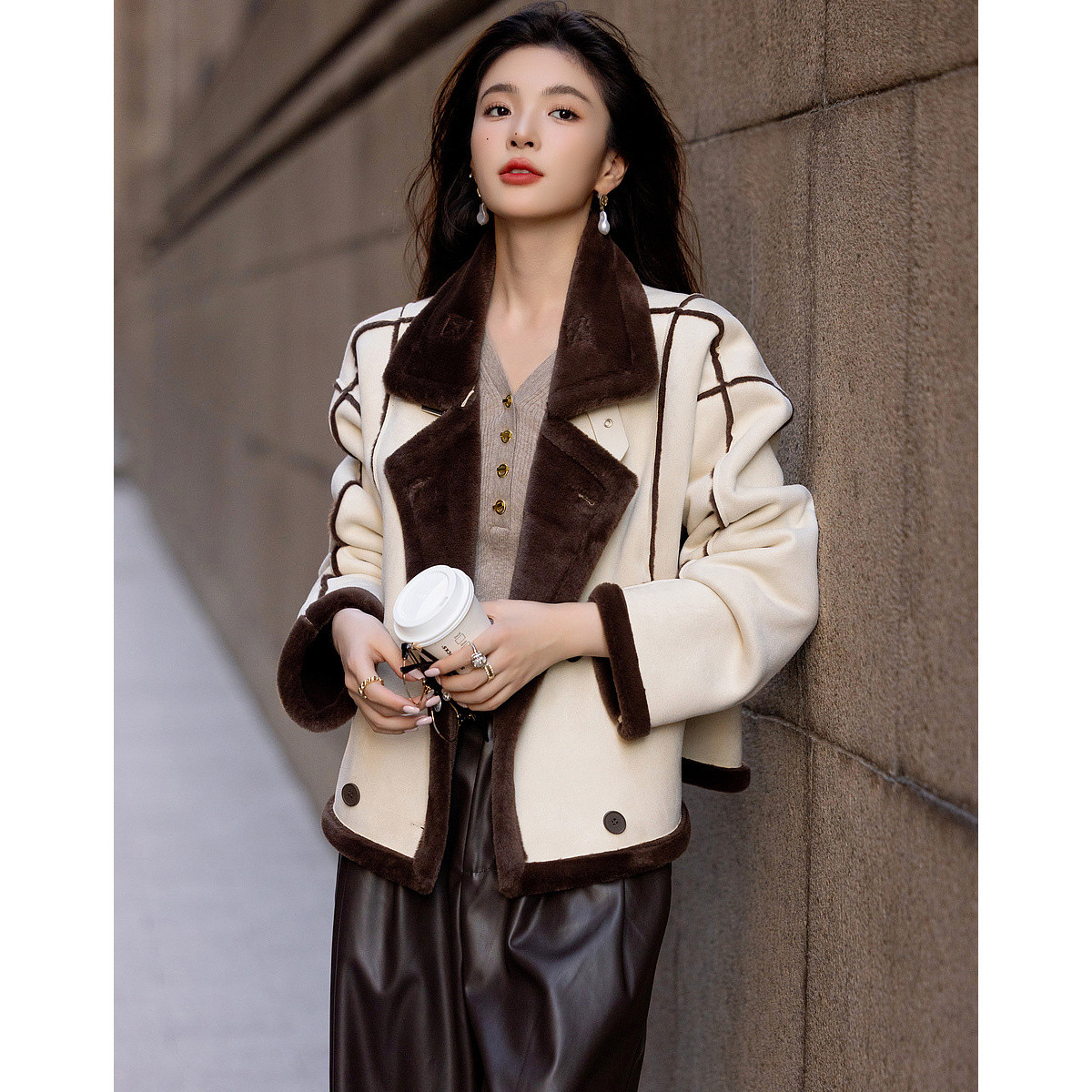 【青春纪念册】冬学院风复合聚酯摇粒绒翻袖口拼色棉衣外套女短款