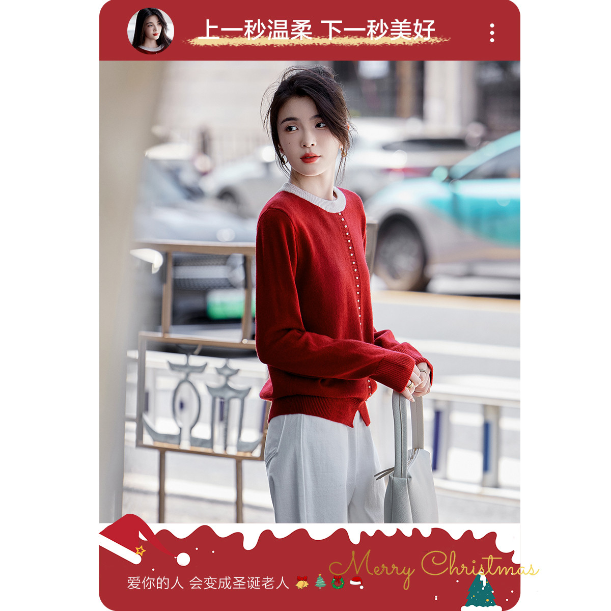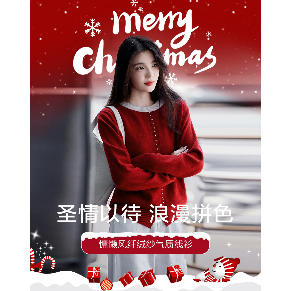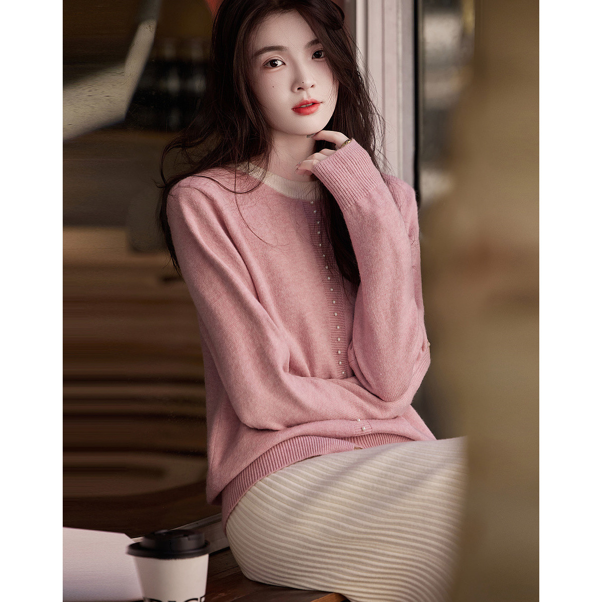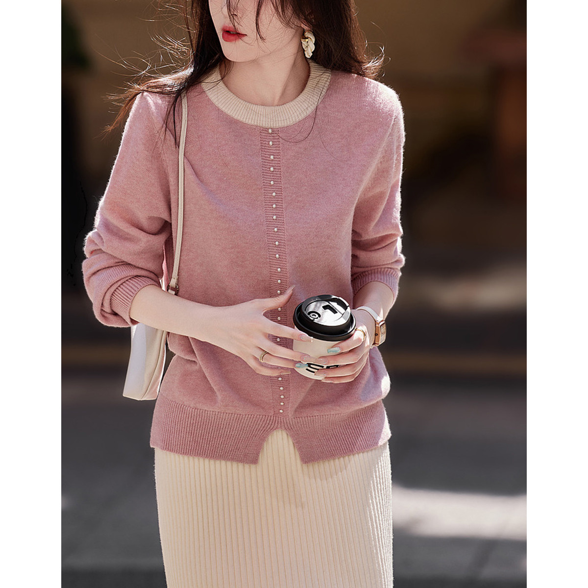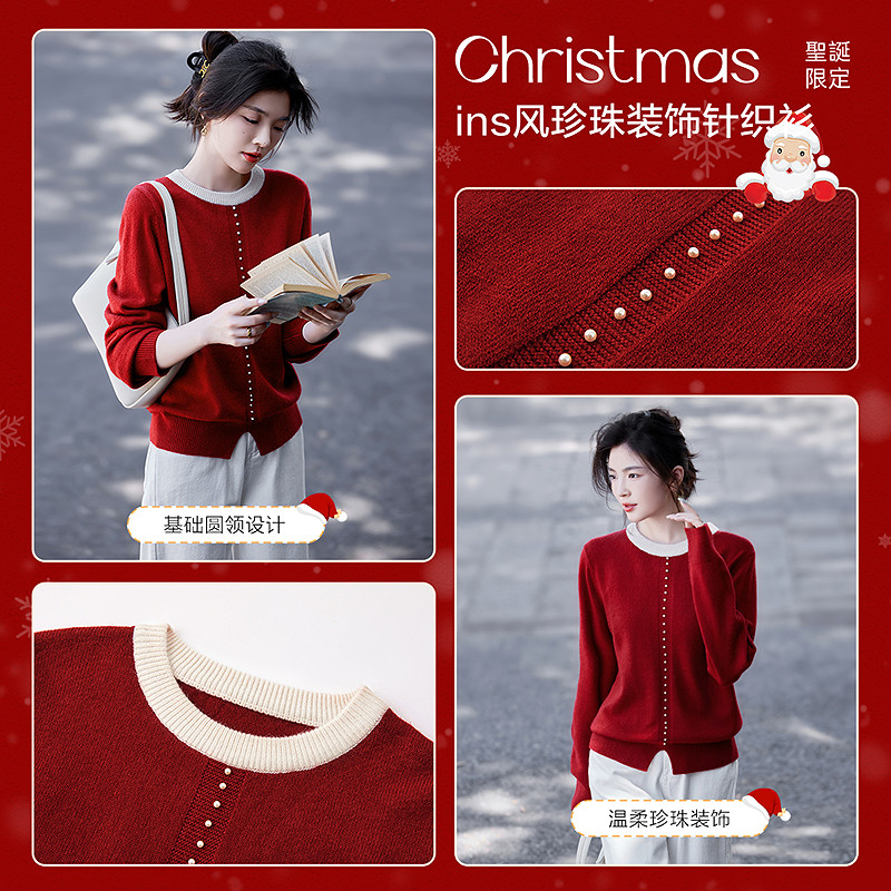 【圣情以待】秋冬慵懒风拼色圆领纤绒纱线衫温柔珍珠针织衫女上衣