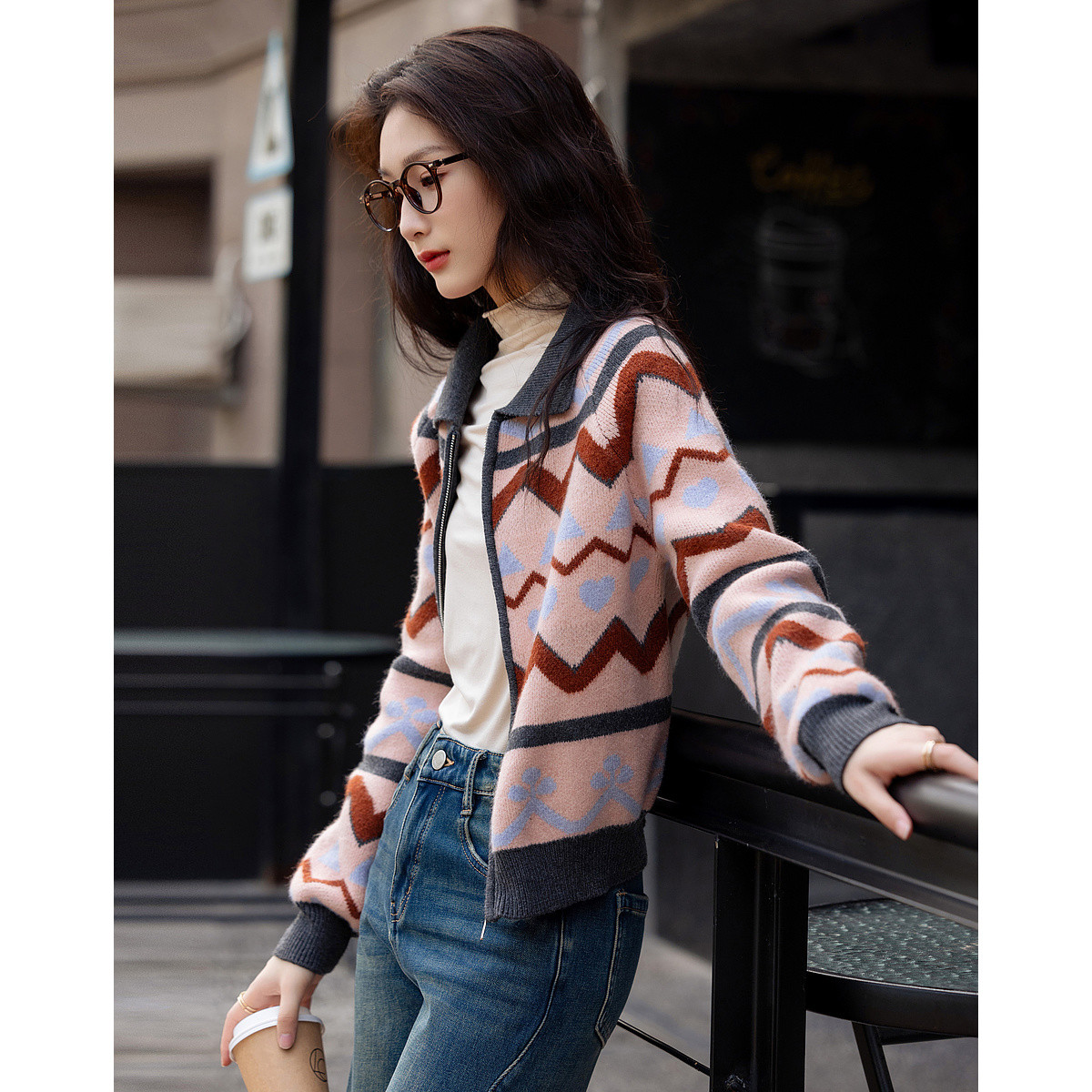 【抽象几何学院】冬时髦拉链翻领开衫撞色线衫纤绒纱针织衫女上衣