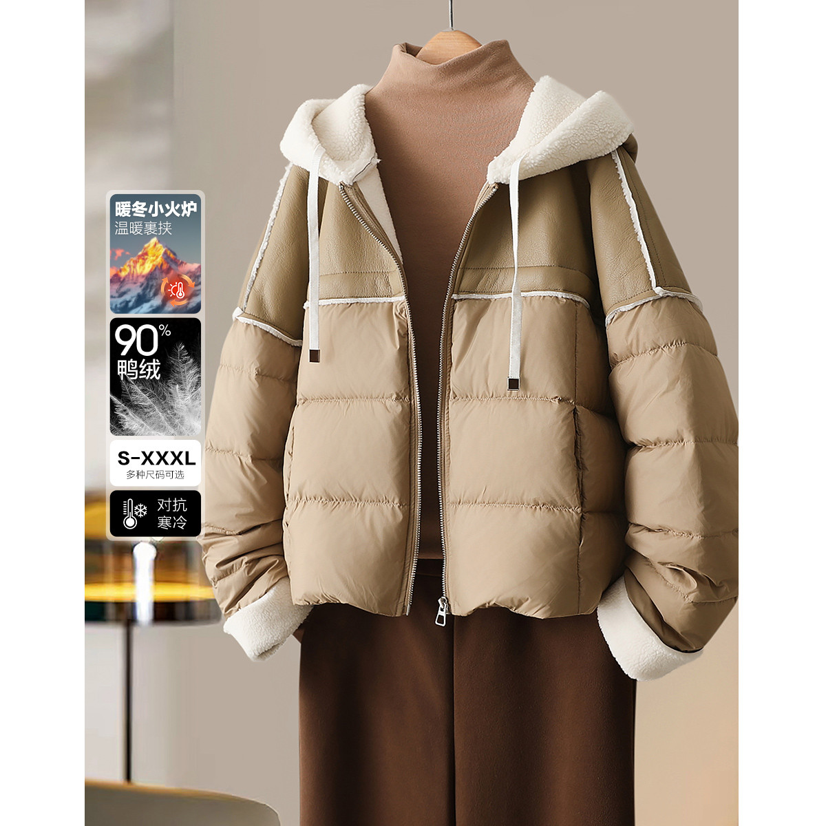 【雪山都市】冬400T春亚纺轻奢90鸭绒连帽拼接橡筋羽绒服女