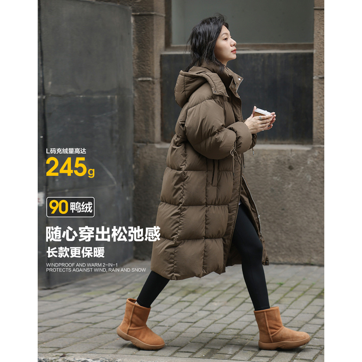 【简约实穿】2024冬款连帽防风扣设计袖口长款羽绒外套女