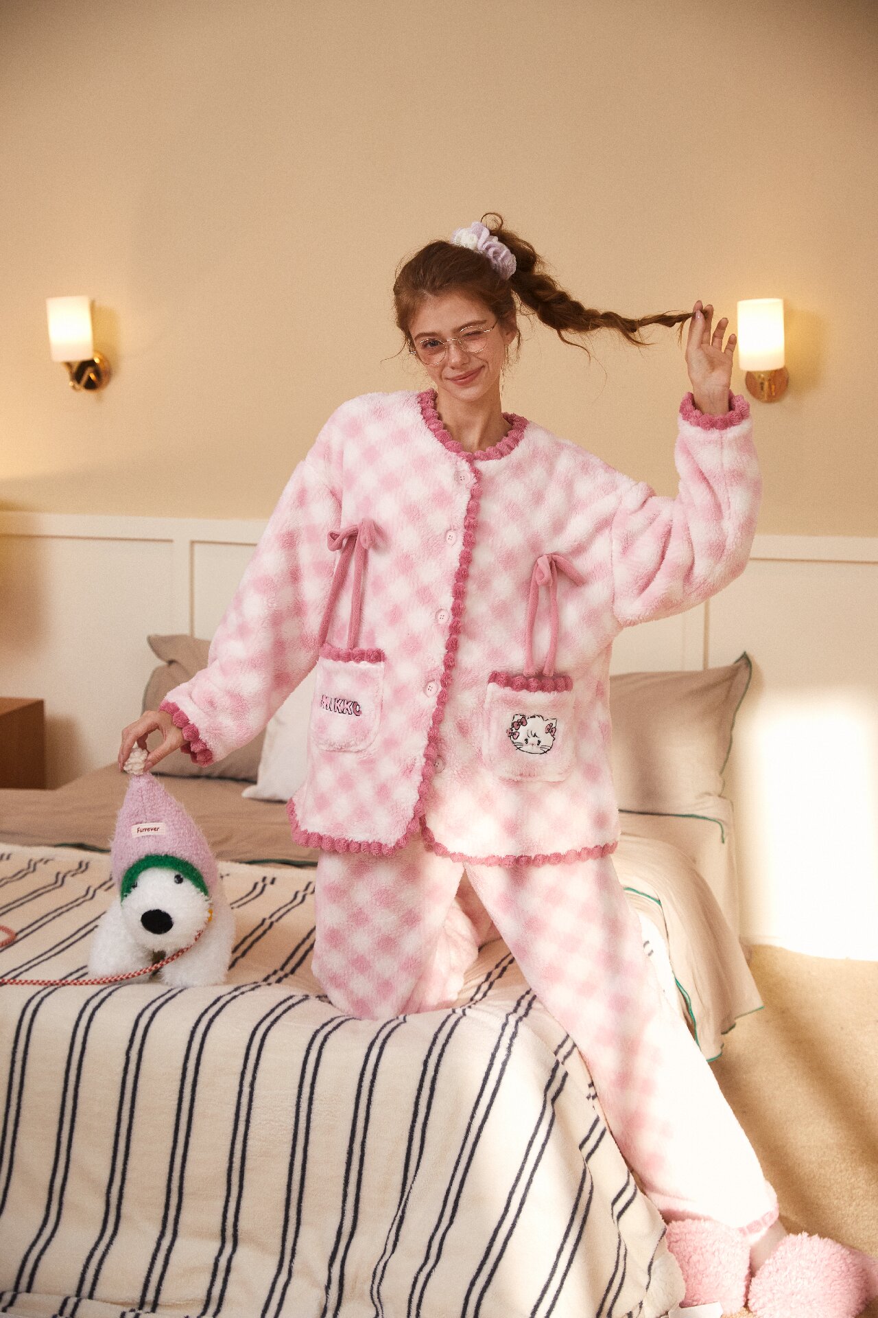 Gukoo/果壳睡衣冬季大耳狗联名新款保暖格子可爱女士家居服套装D