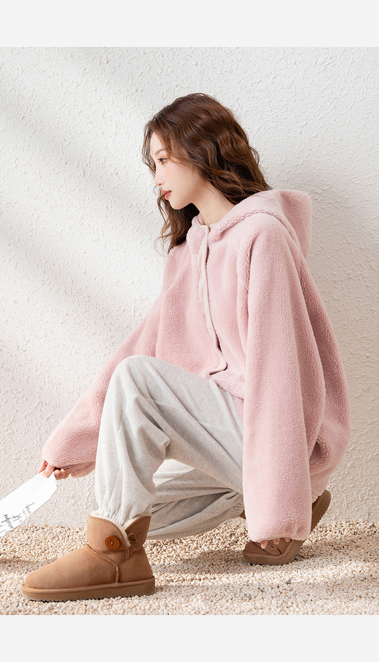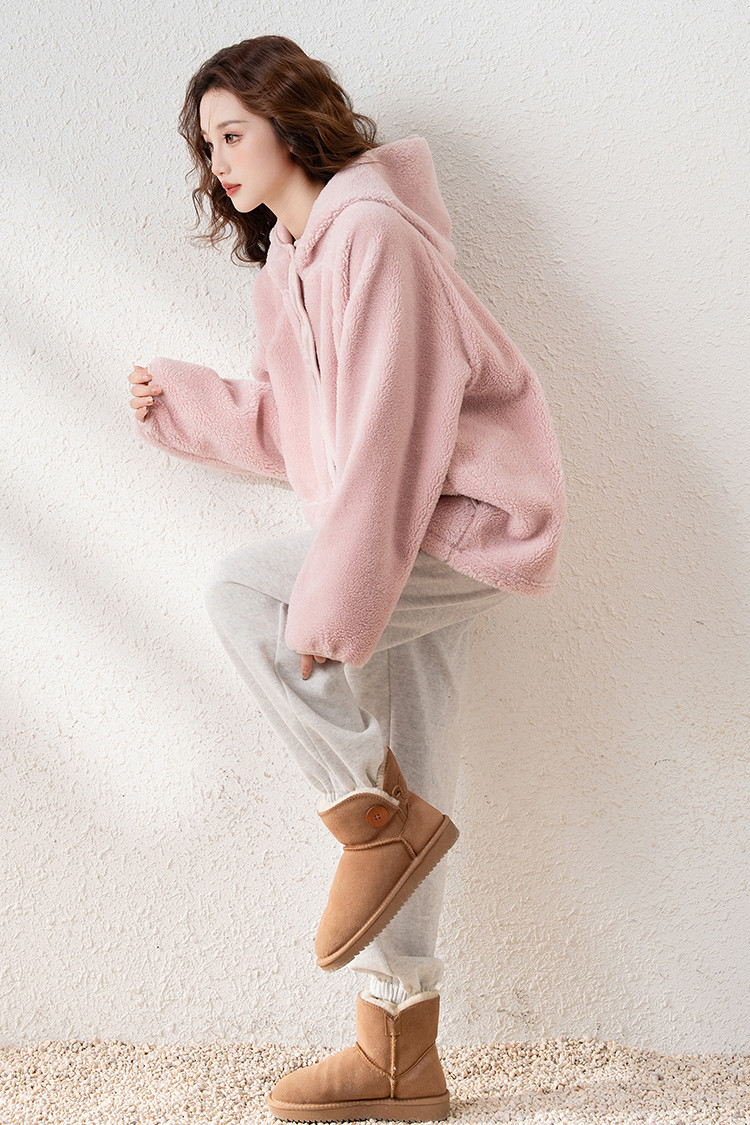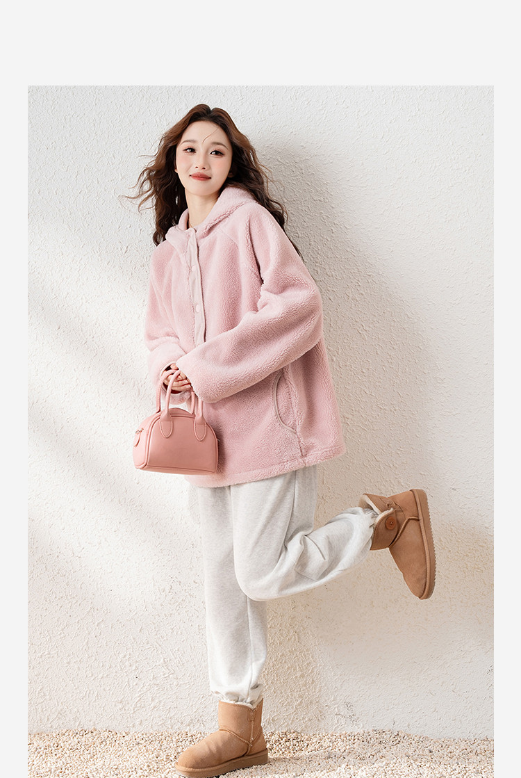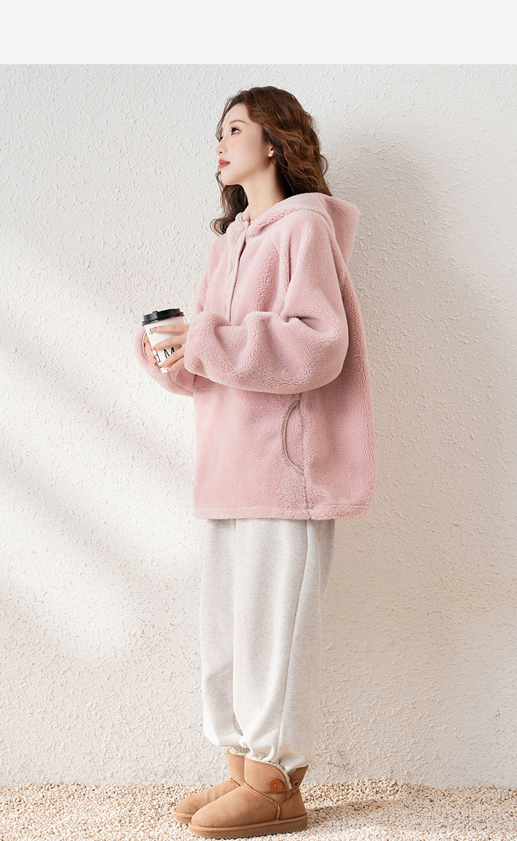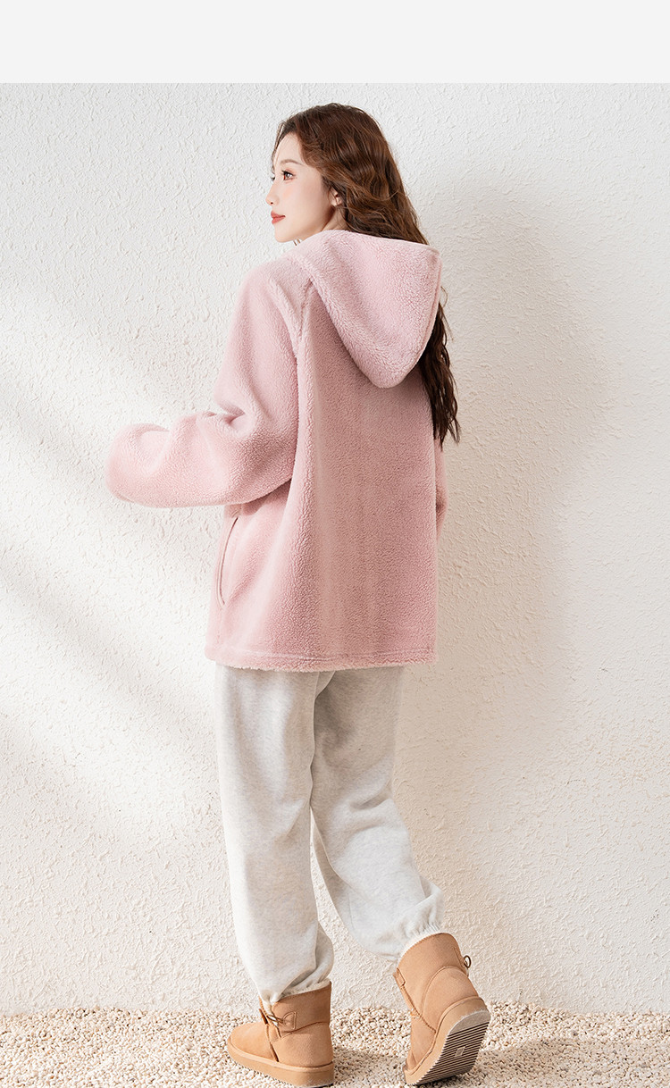 2024冬季女连帽净色长袖宽松仿羊羔毛外套毛绒绒可爱百搭休闲