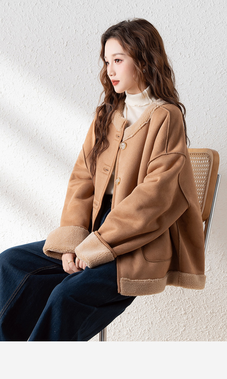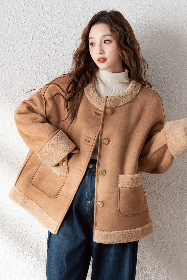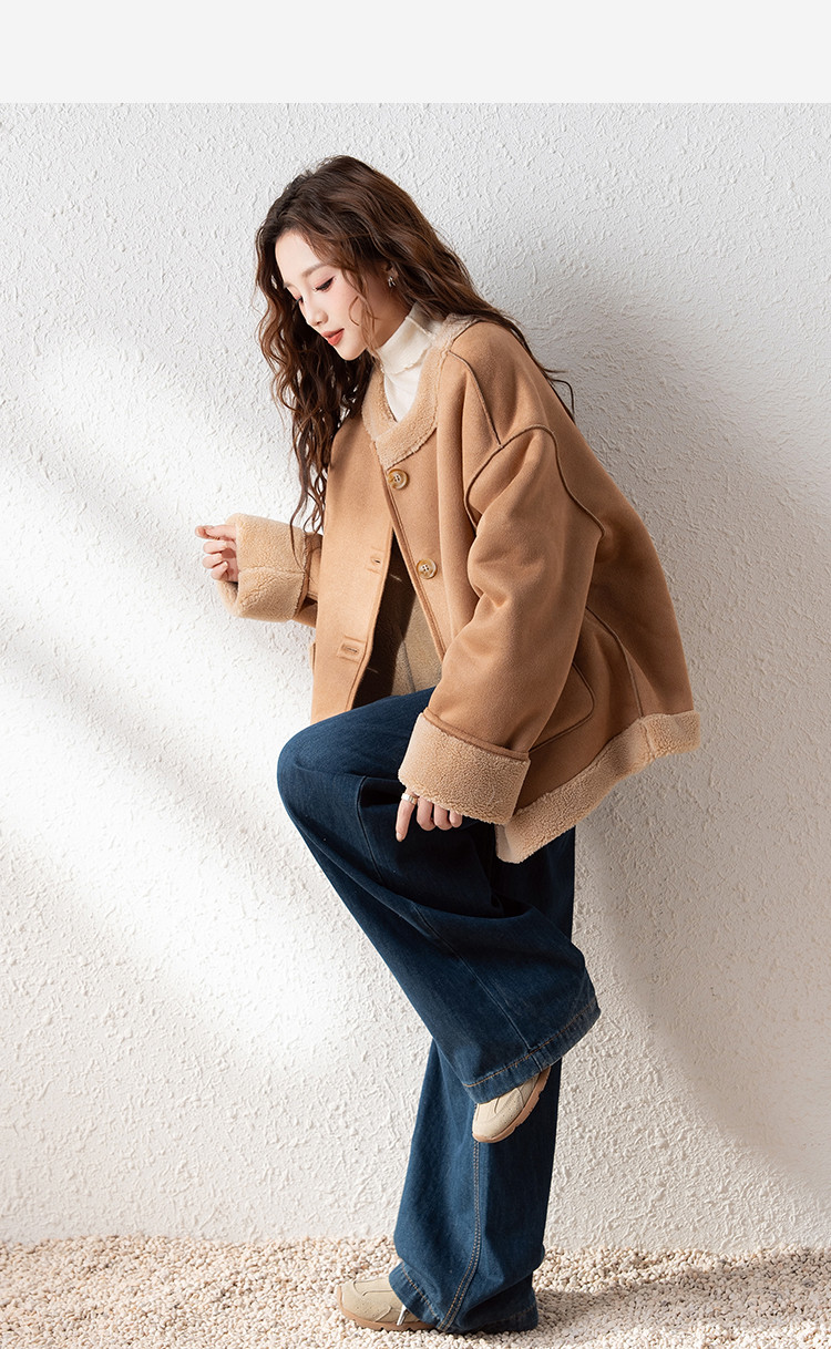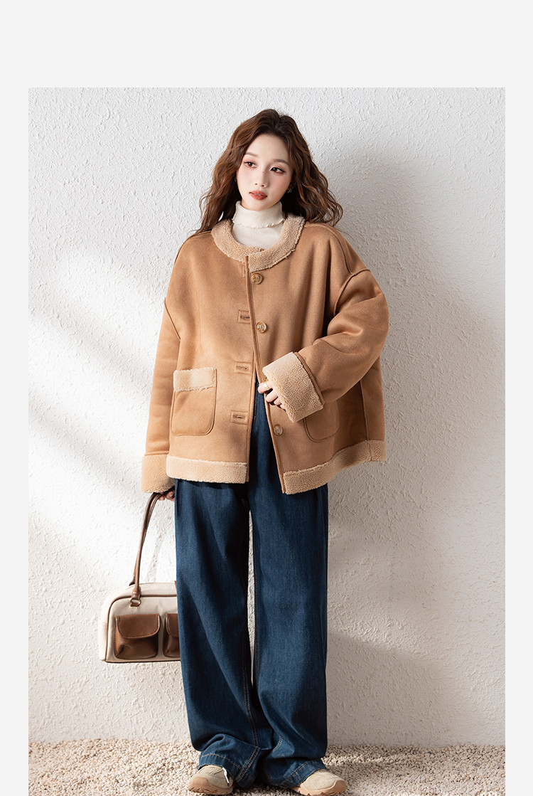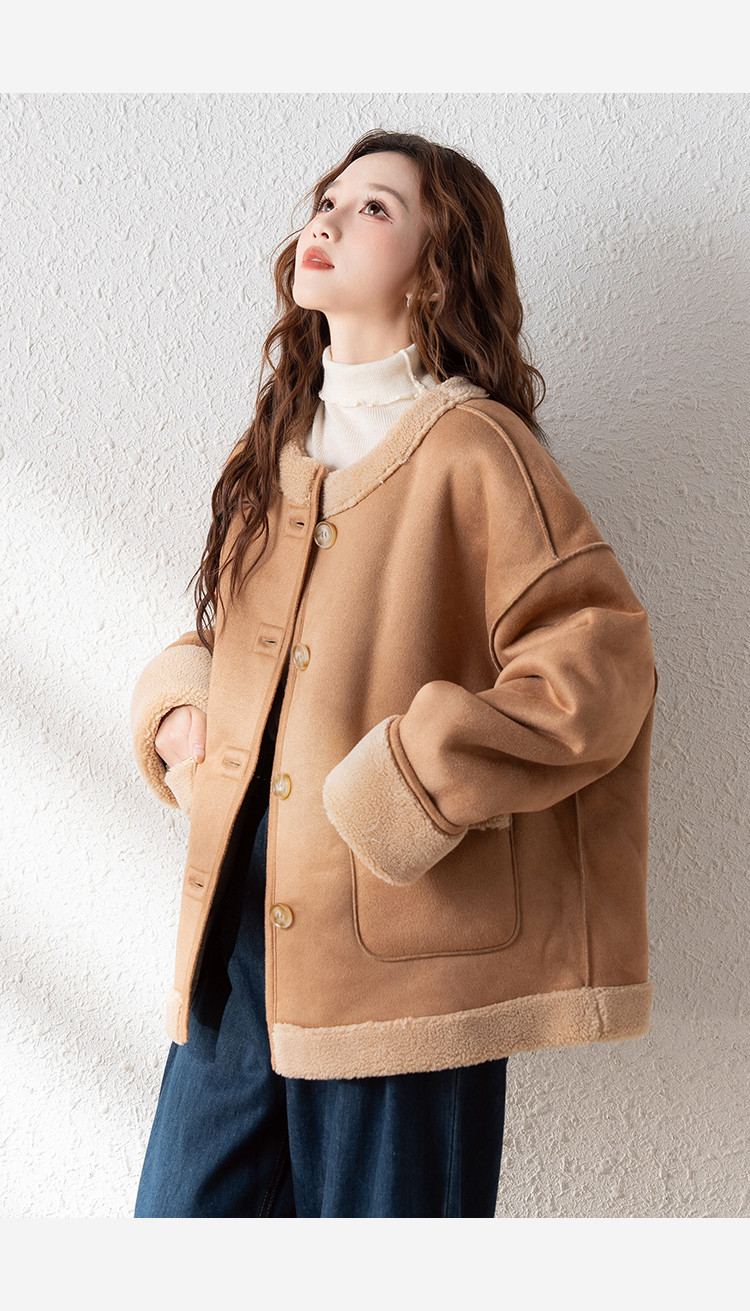 2024冬季女圆领麂皮绒复合仿羊羔毛外套复古气质百搭温柔休闲潮