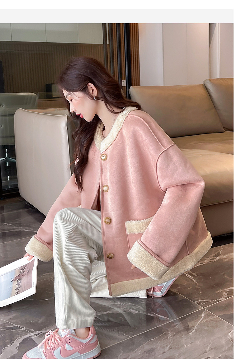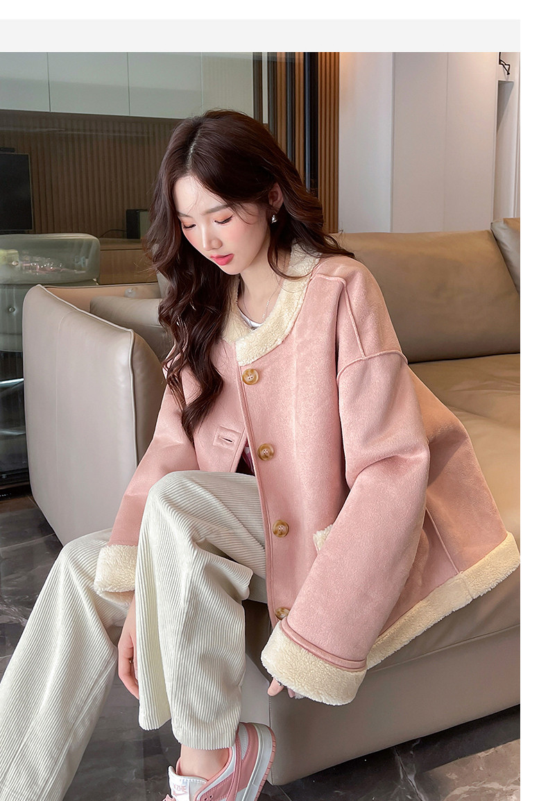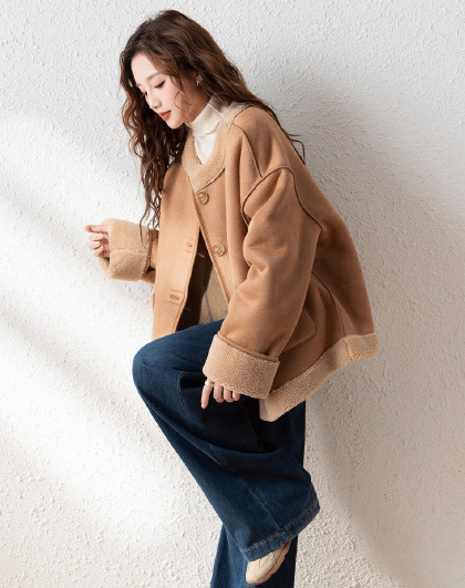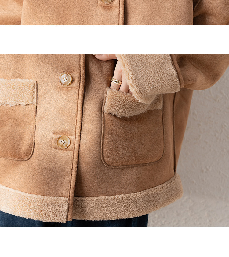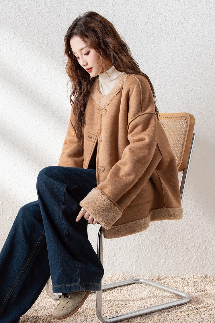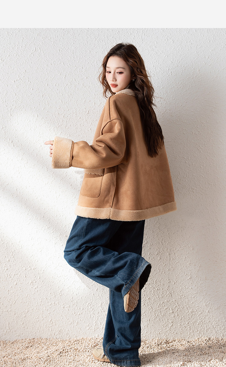 2024冬季女圆领麂皮绒复合仿羊羔毛外套复古气质百搭温柔休闲潮