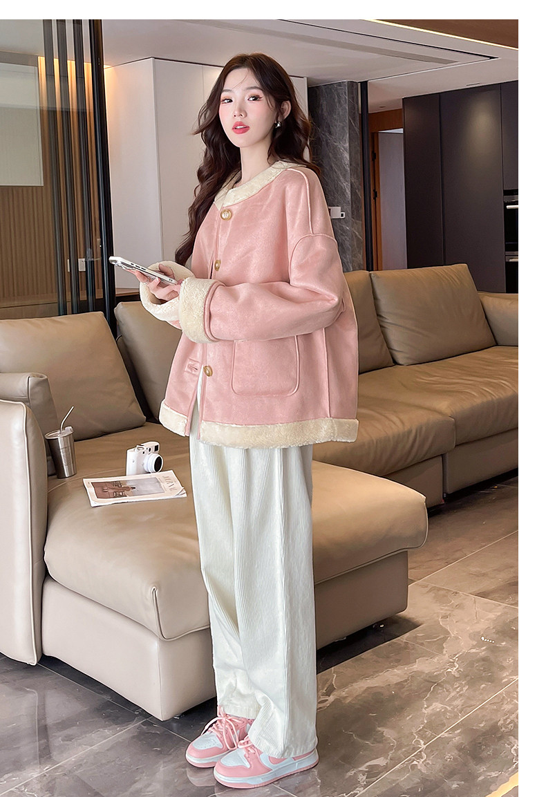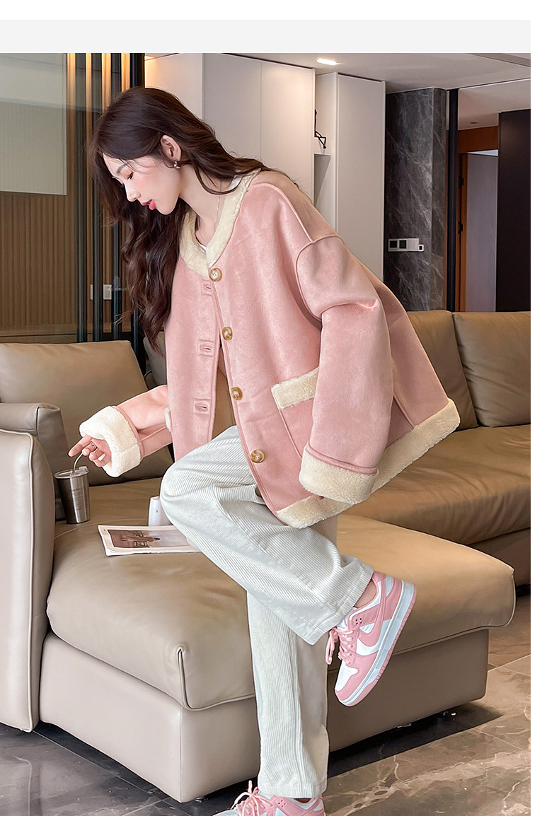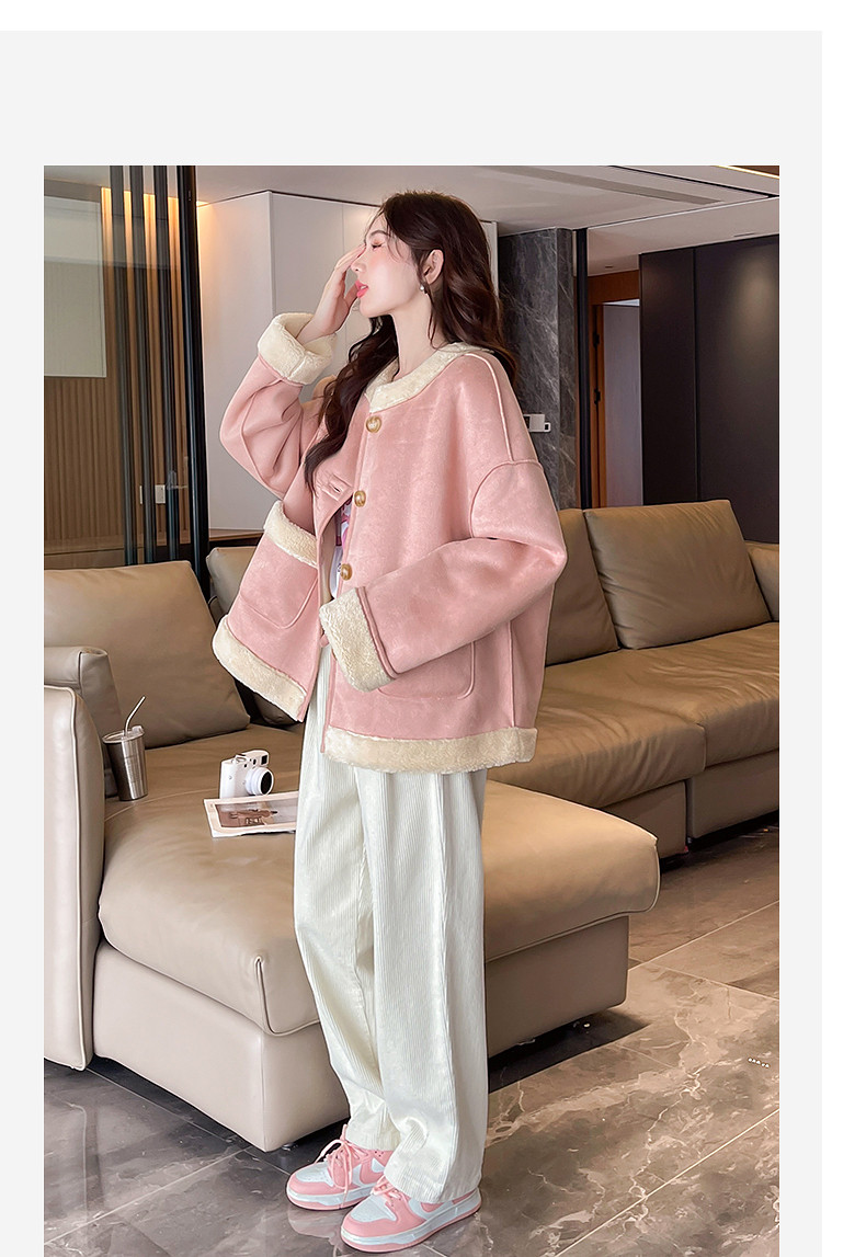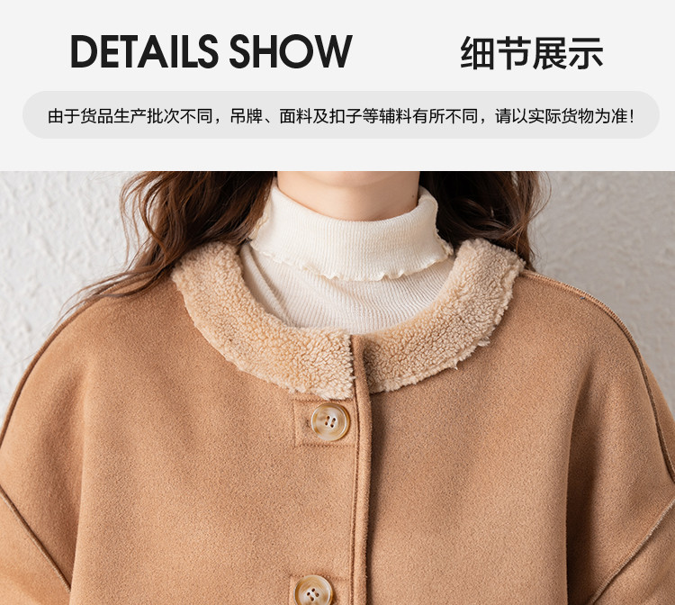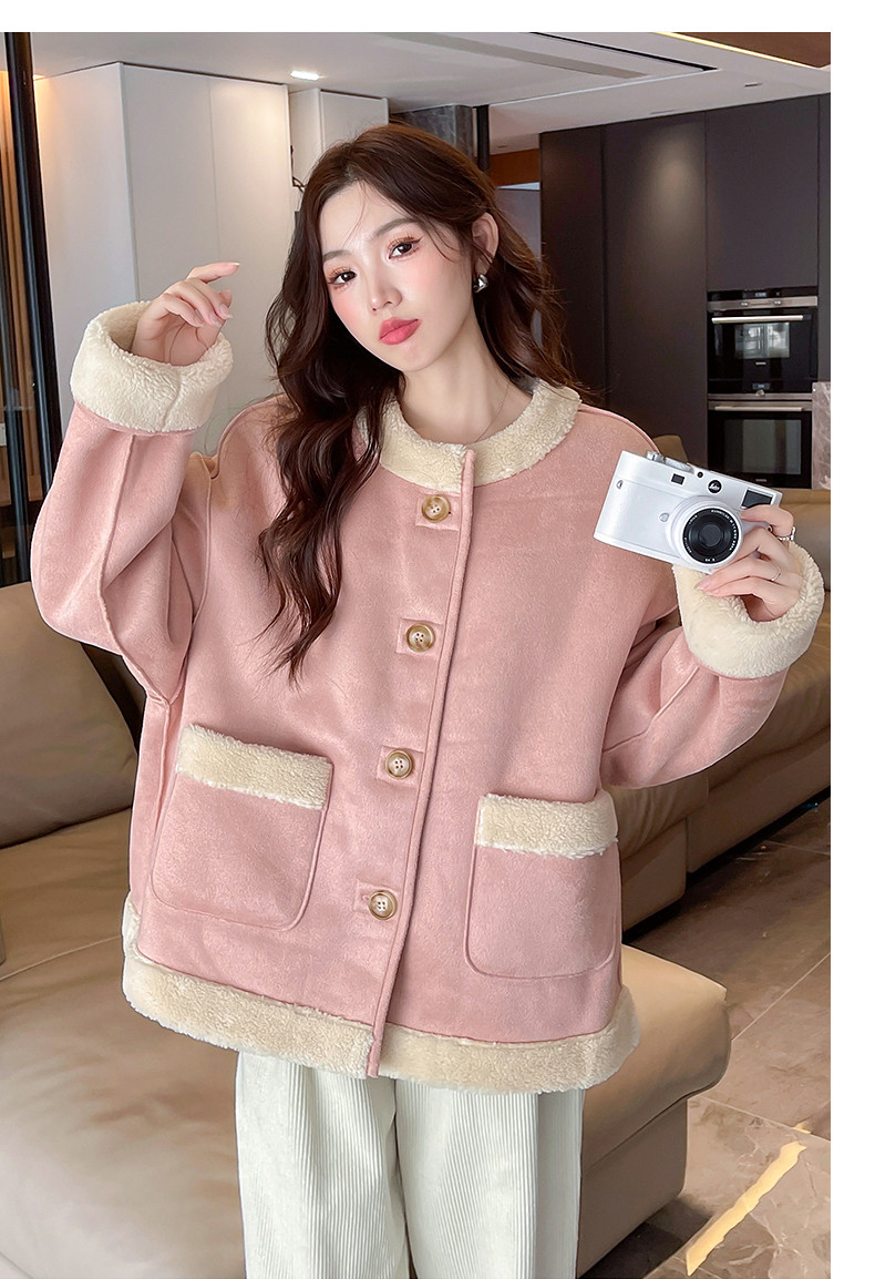 2024冬季女圆领麂皮绒复合仿羊羔毛外套复古气质百搭温柔休闲潮