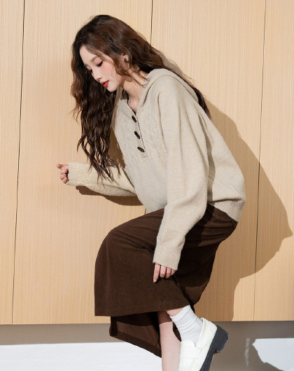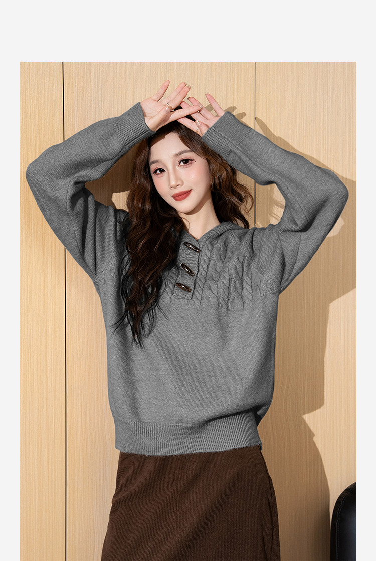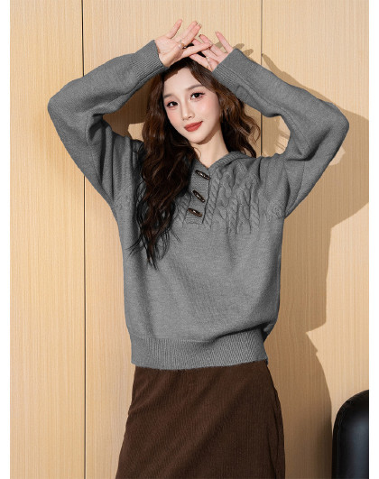 2024冬季女连帽绞花毛线衫毛衣复古休闲百搭简约温柔时尚