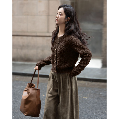 【咖色绒感针织衫】2024冬款圆领假门襟设计长袖针织衫女
