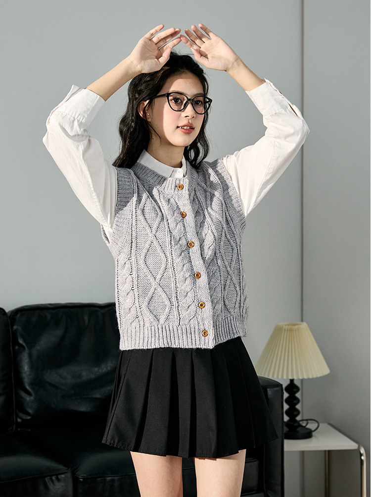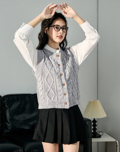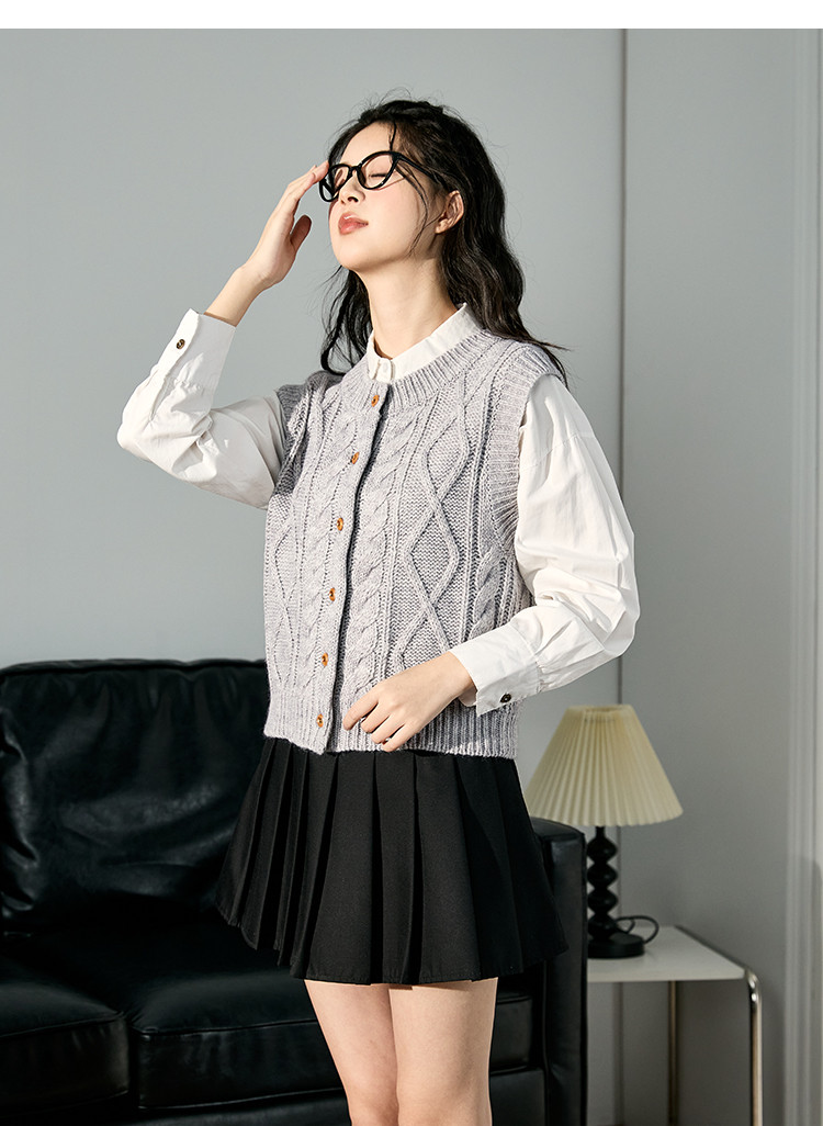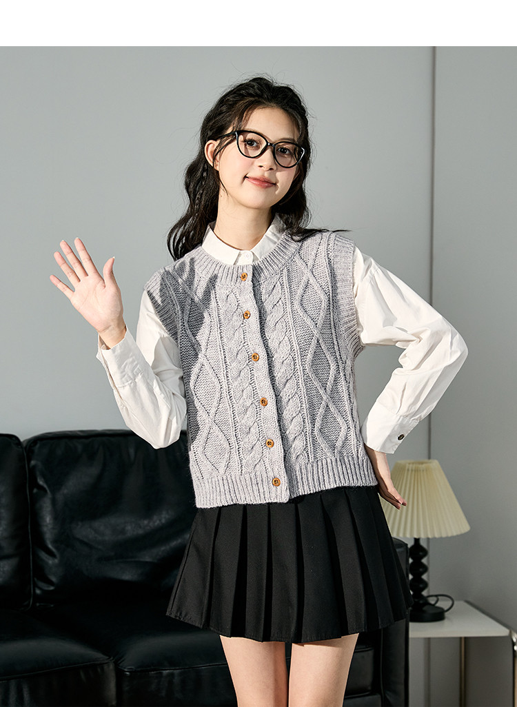 2024秋冬女圆领绞花毛线衫马甲净色简约韩版百搭上衣