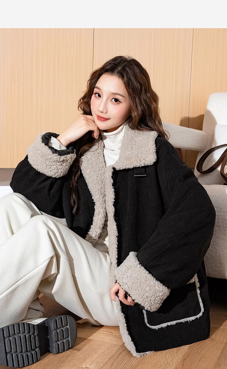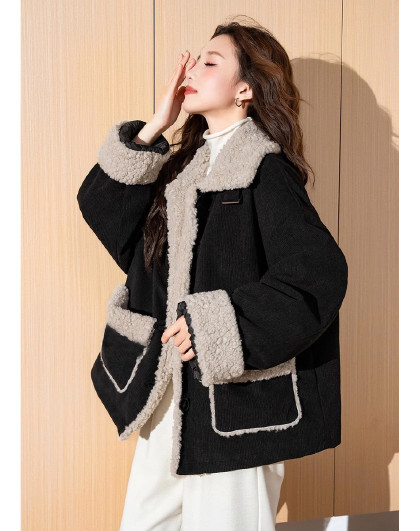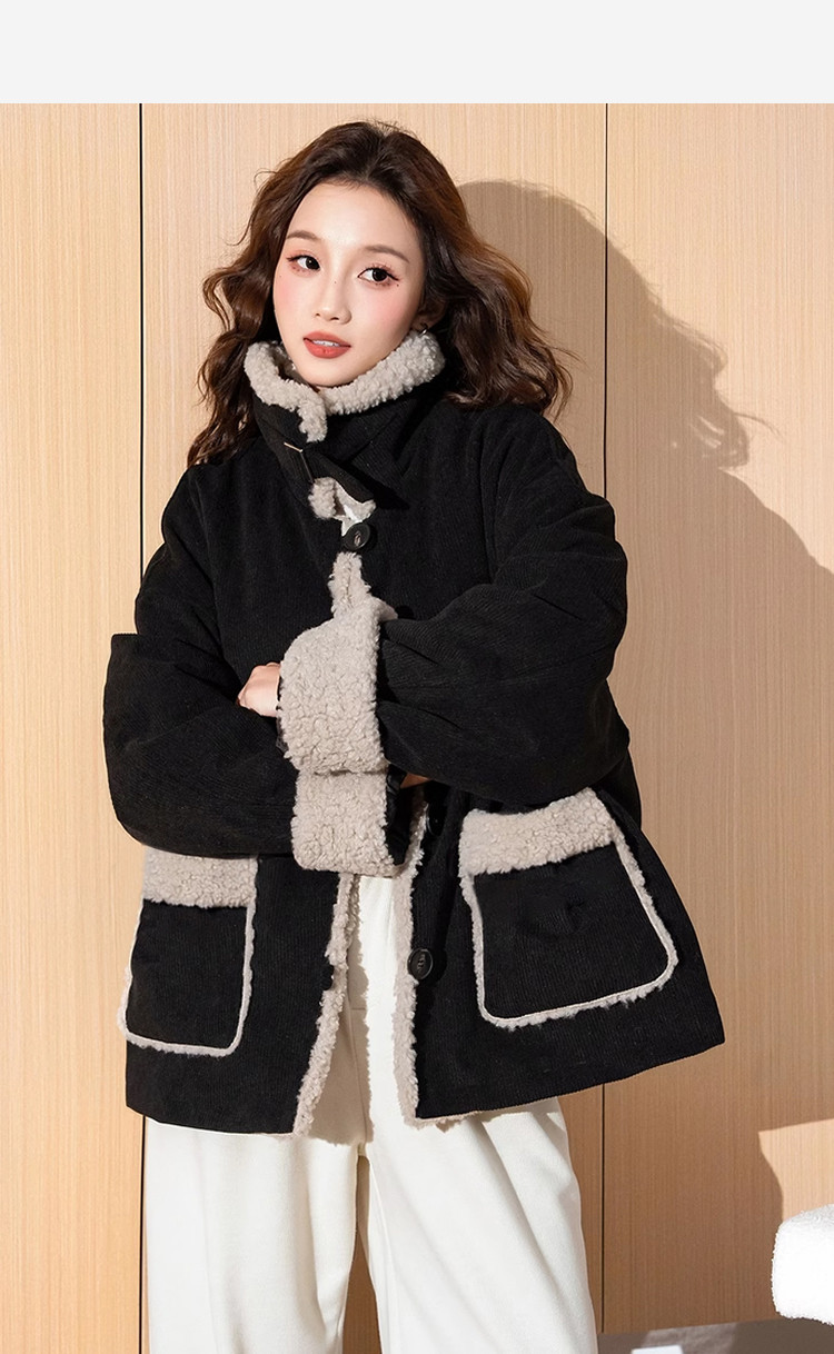 2024冬季女立领灯芯绒拼接短款外套气质百搭高级感休闲时髦