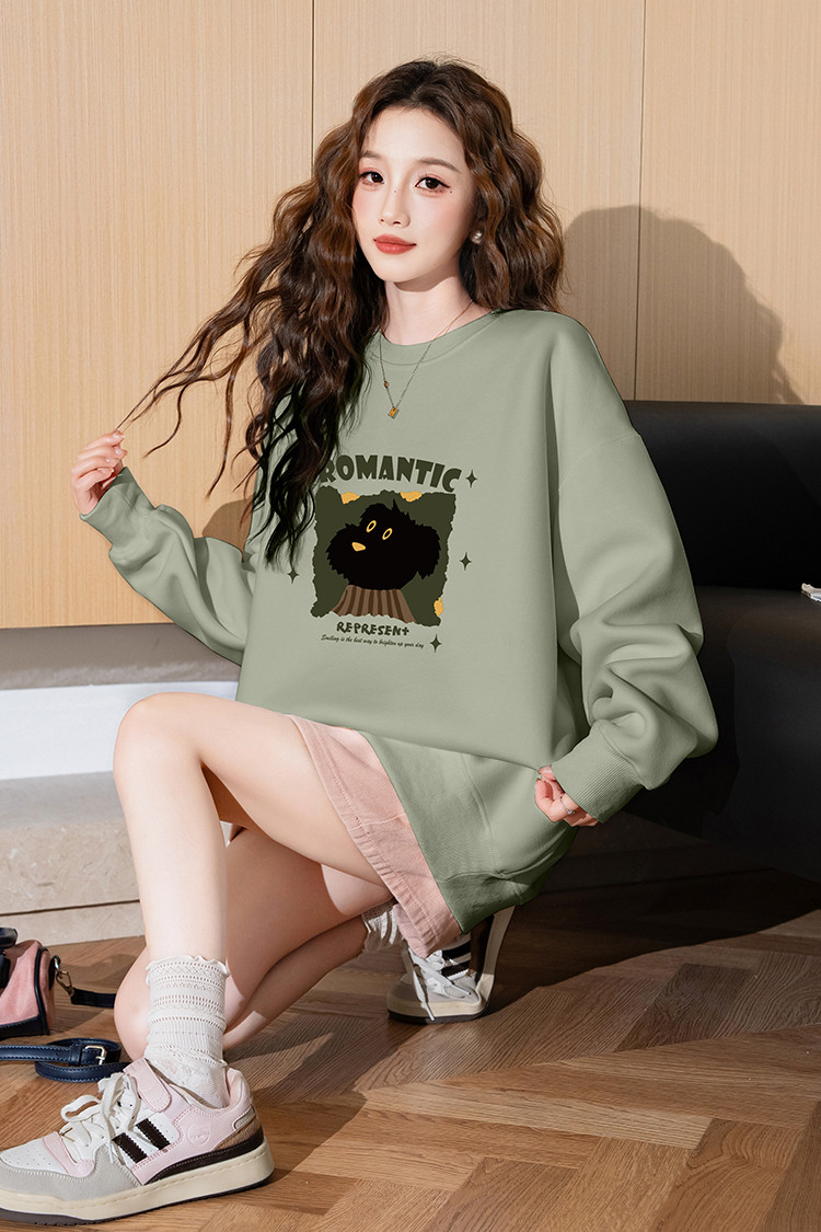 2024冬季女圆领前胸框型图案加绒卫衣慵懒风百搭韩版休闲时尚