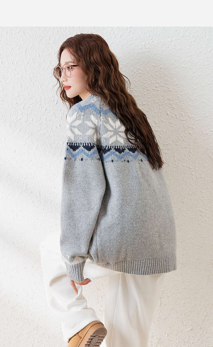 【费尔岛】2024冬季女圆领民族风复古提花图案套头毛线衫毛衣