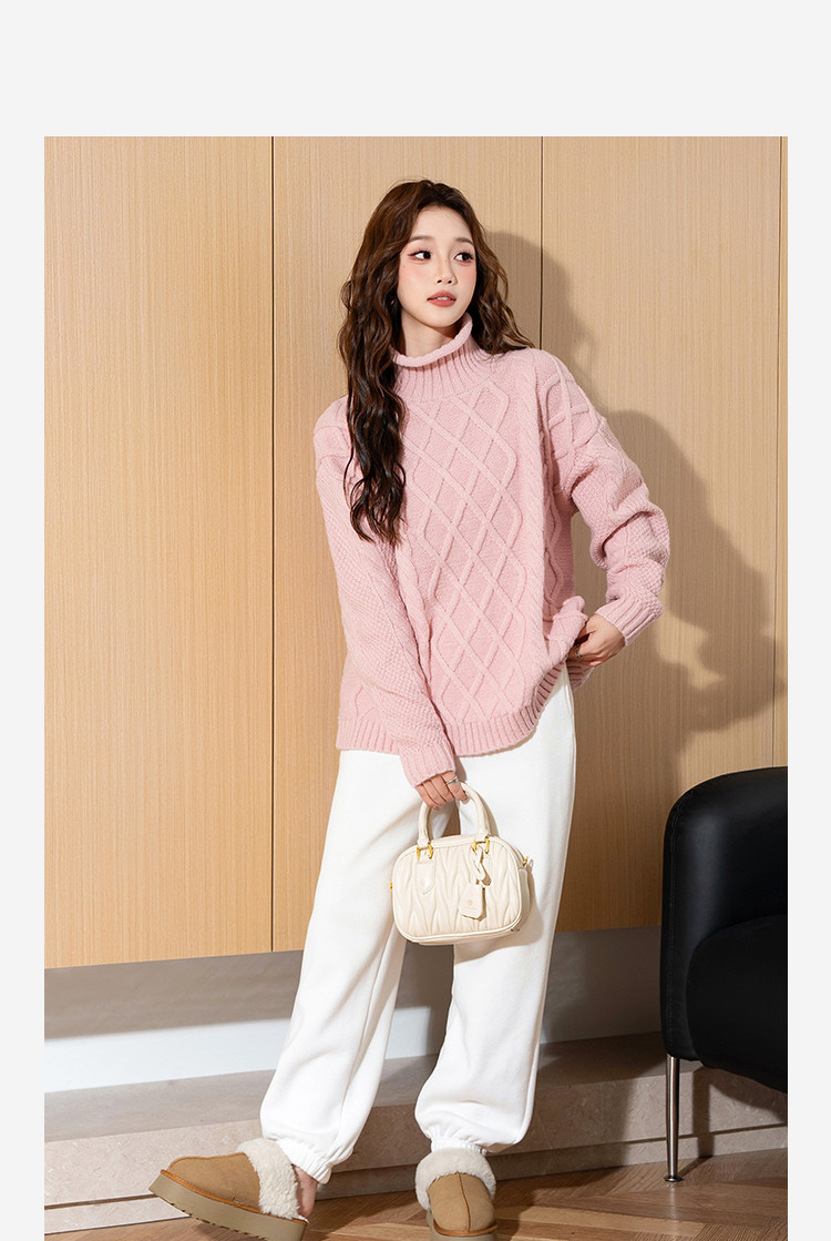 2024冬季女半高领绞花毛线衫净色简约上衣时尚百搭