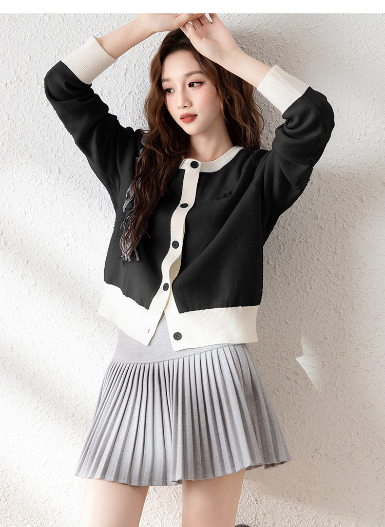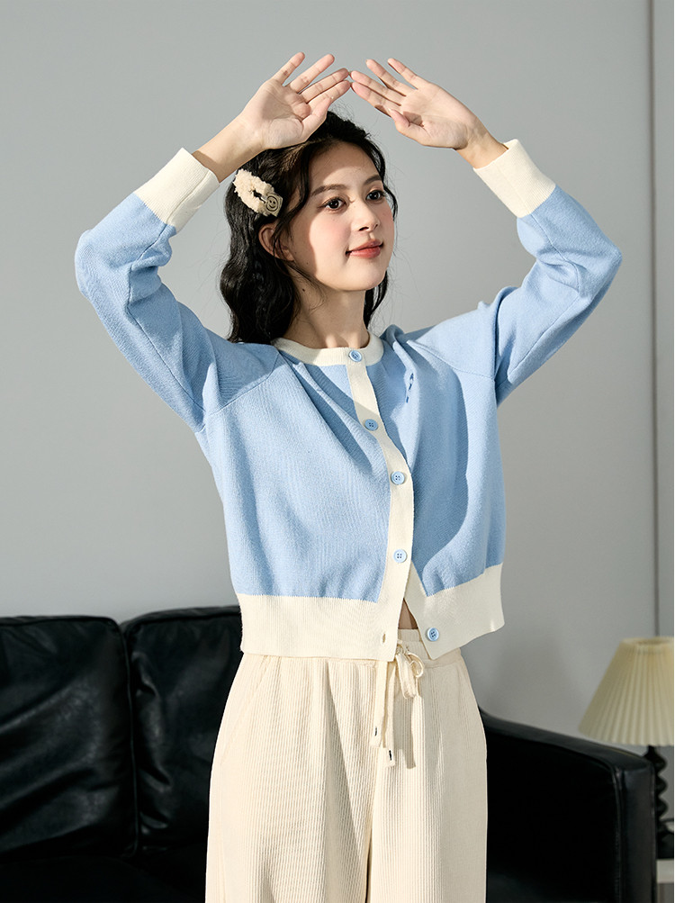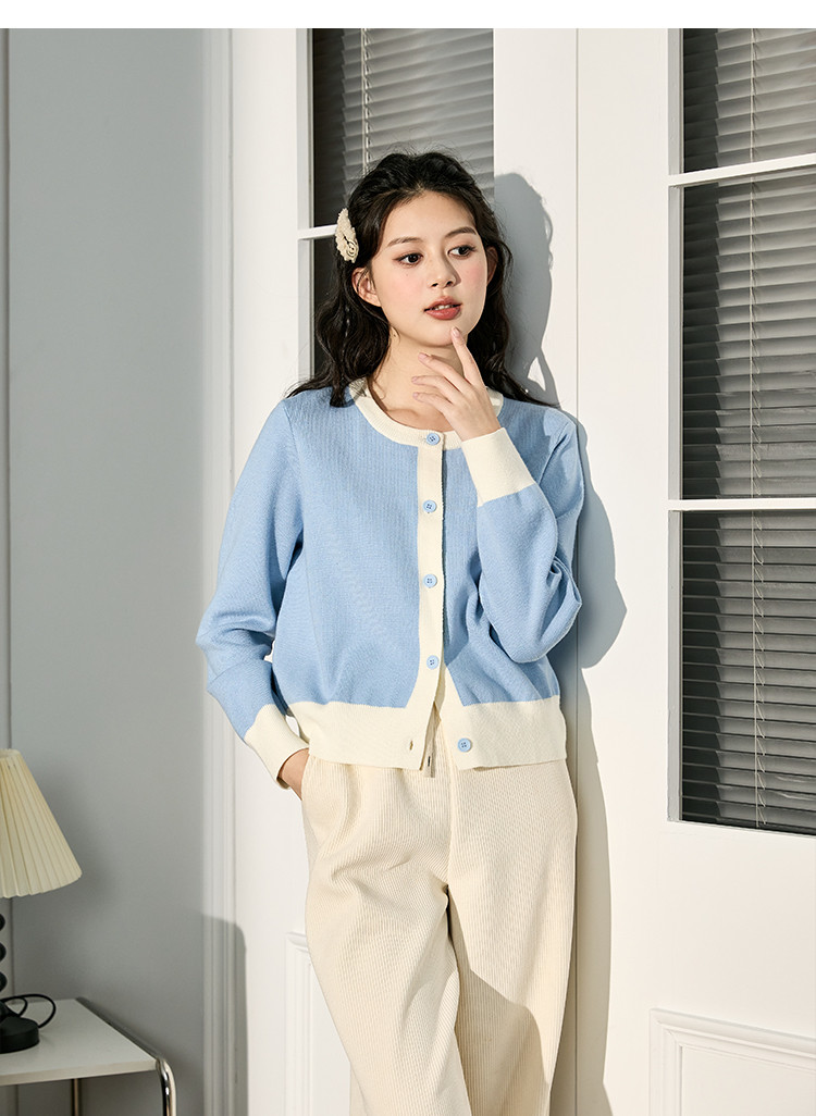 2024秋冬女圆领拼色开衫毛线衫简约百搭短款上衣设计感休闲