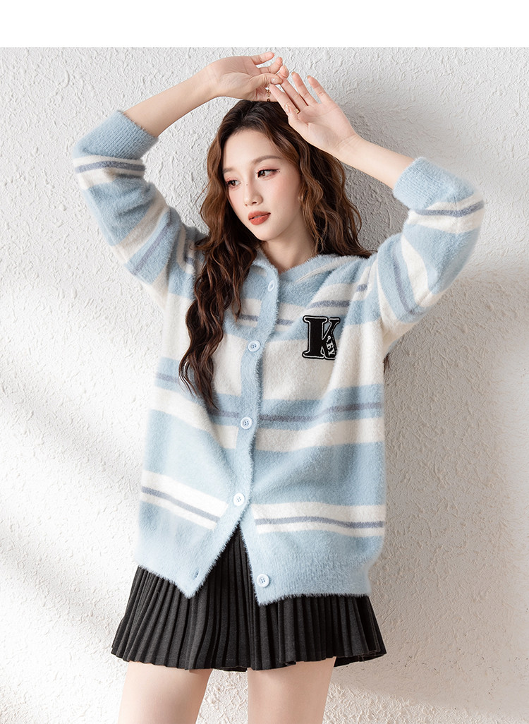 2024冬季女连帽左胸字母条纹拼色开衫毛线衫休闲时尚