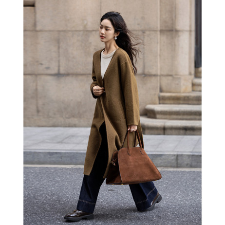 【复古绿V领大衣】2024冬款钉扣斜插袋长袖中长款呢大衣女