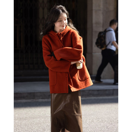 【礼颂新岁】冬季氛围感绵羊毛连帽呢大衣宽松中长款女式毛呢外套