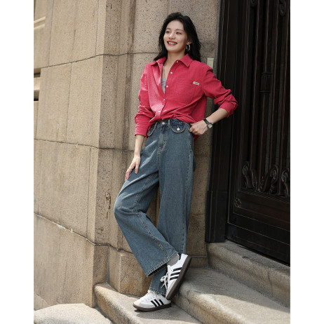 【玫红色翻领衬衫】2024冬款竖坑条多巴胺灯芯绒小众吸睛衬衫
