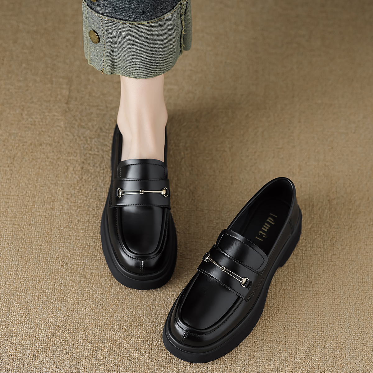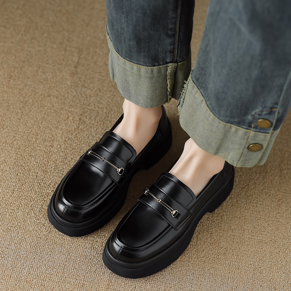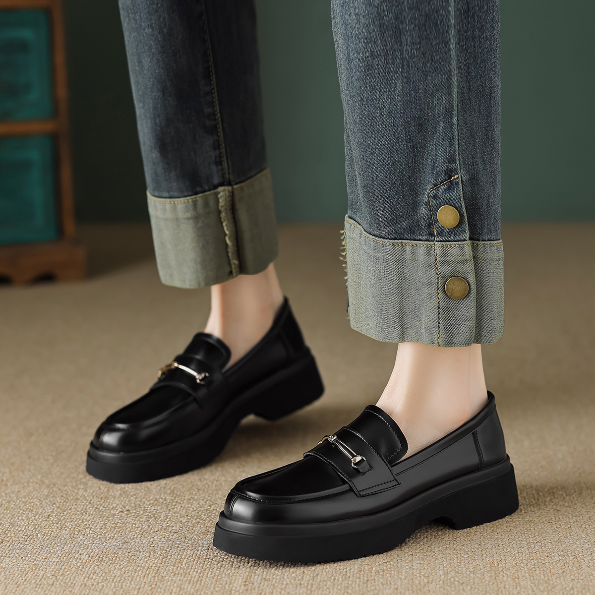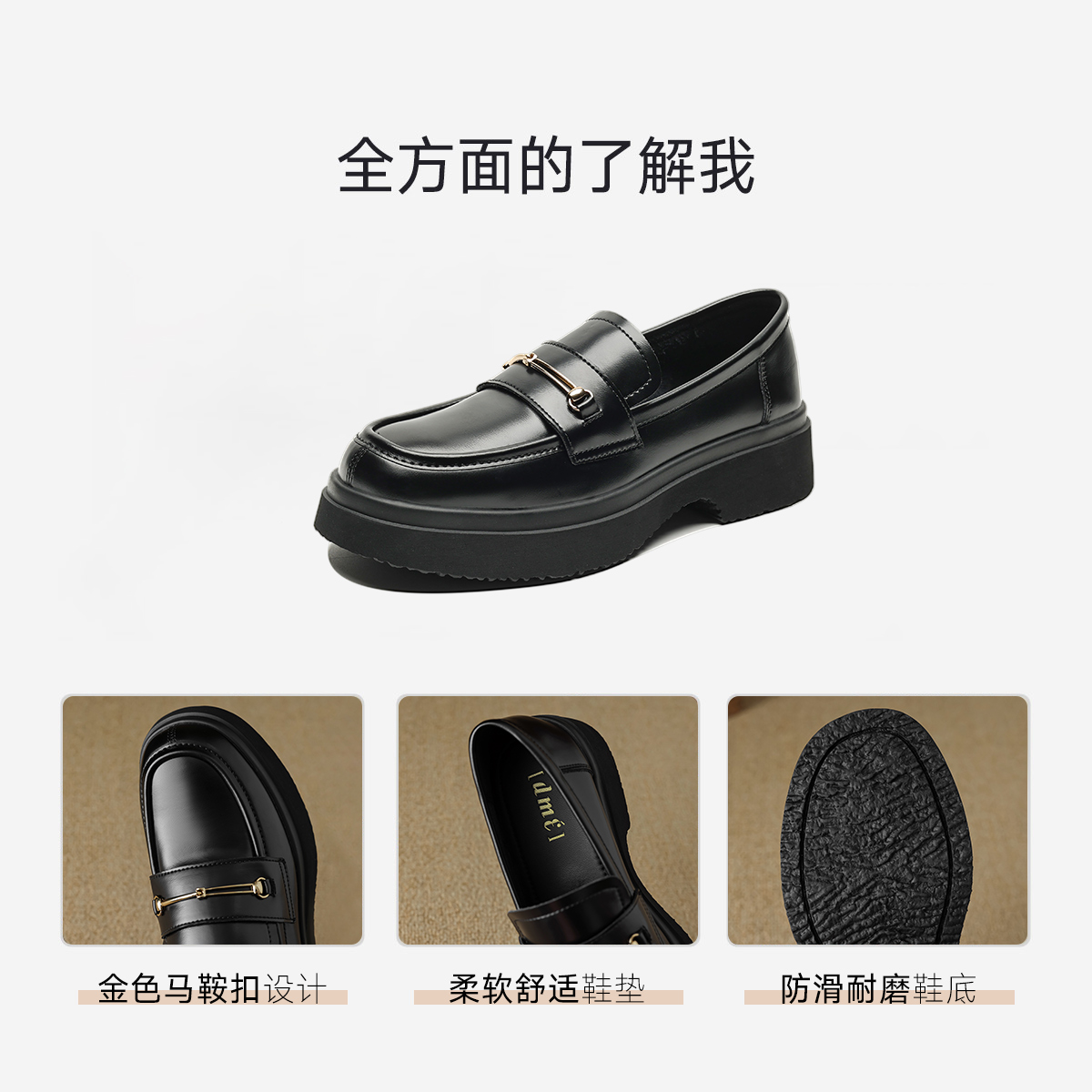 2024年春季新款简约百搭英伦风金色马鞍扣圆头深口乐福鞋女单鞋