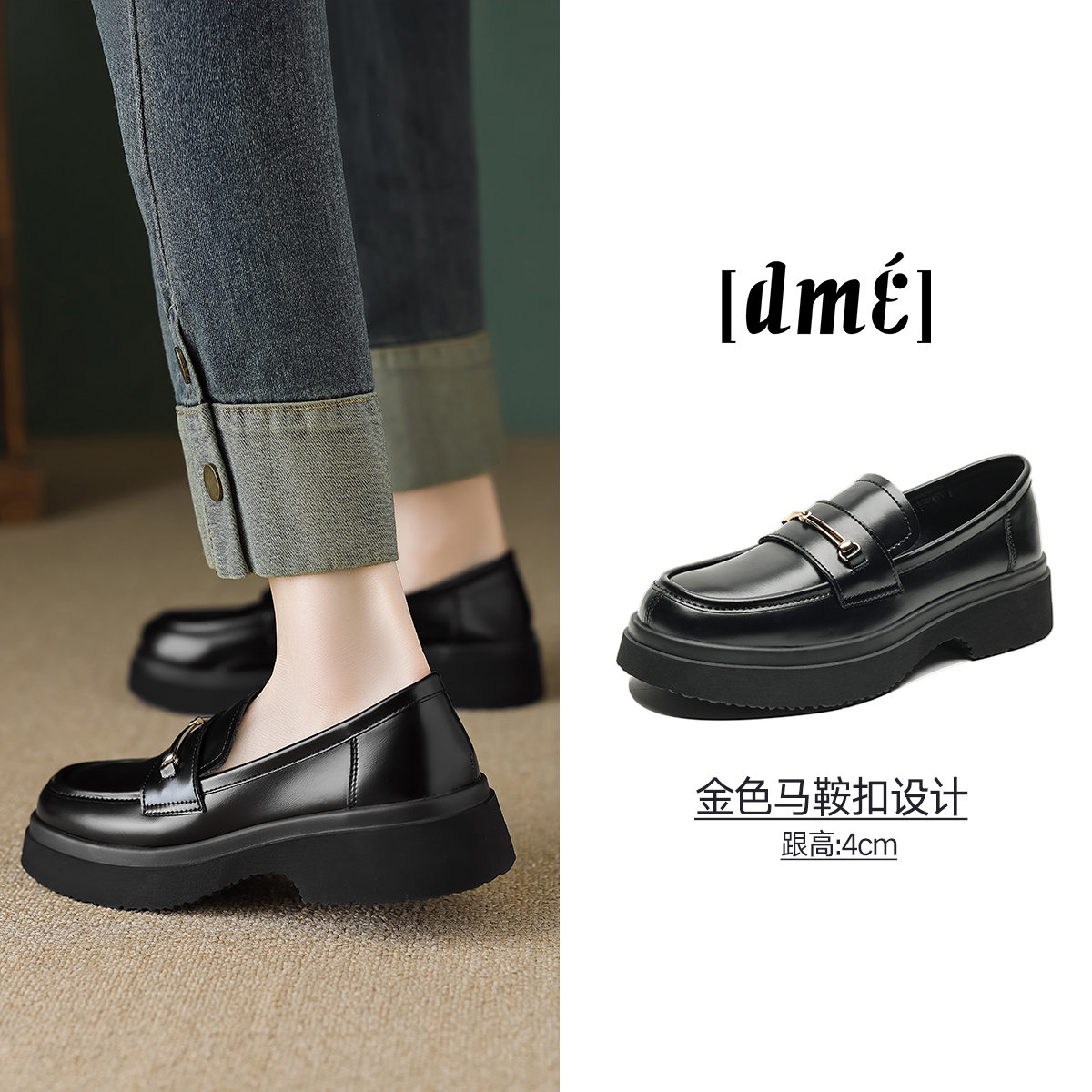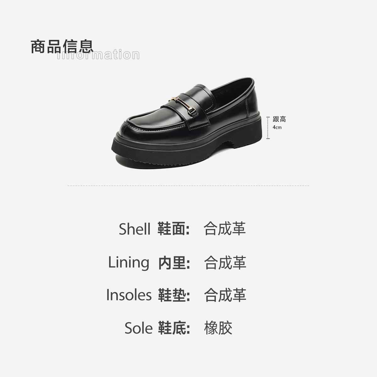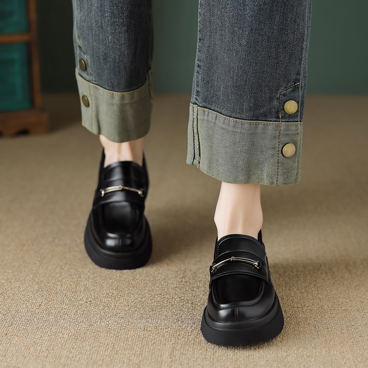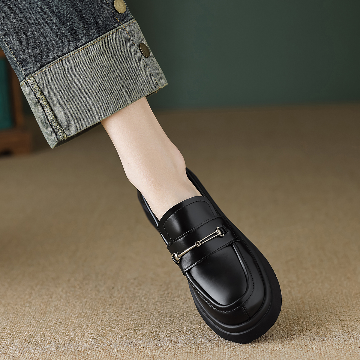 2024年春季新款简约百搭英伦风金色马鞍扣圆头深口乐福鞋女单鞋