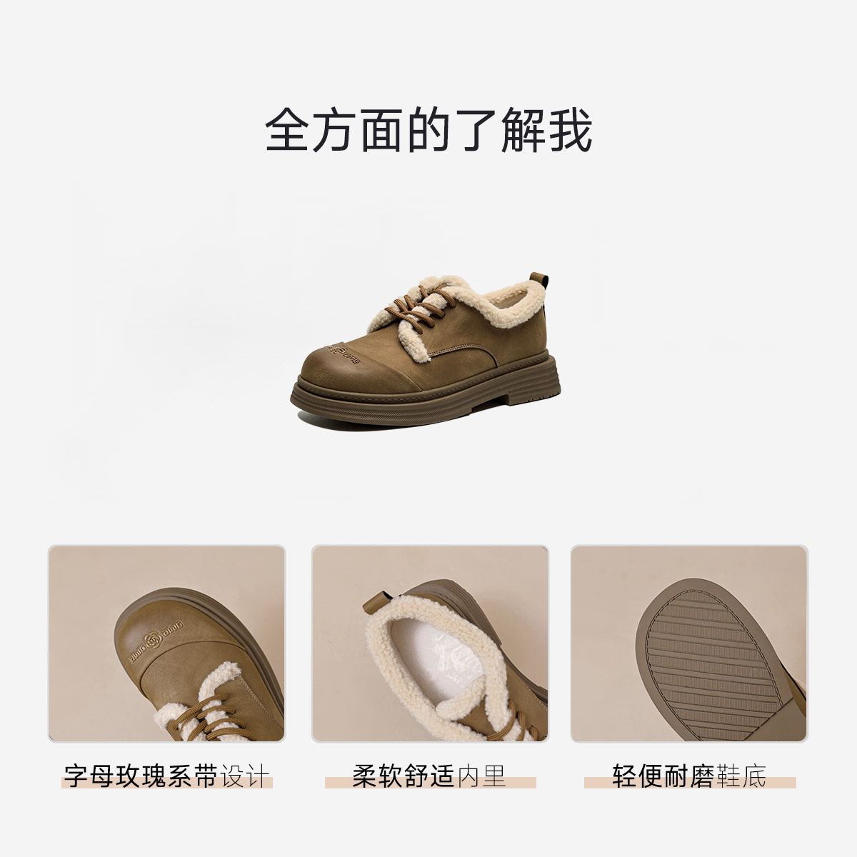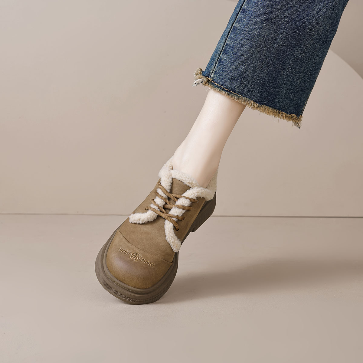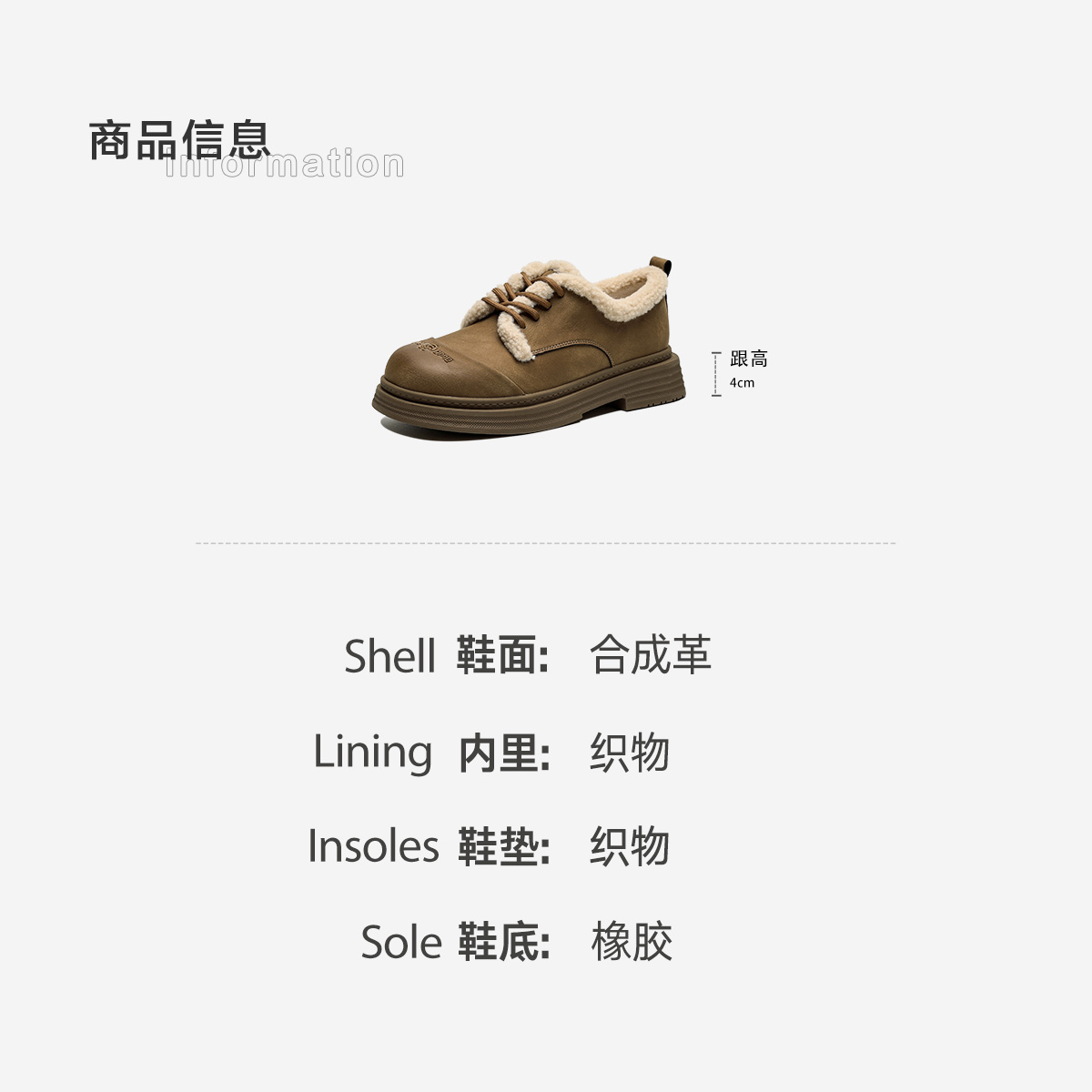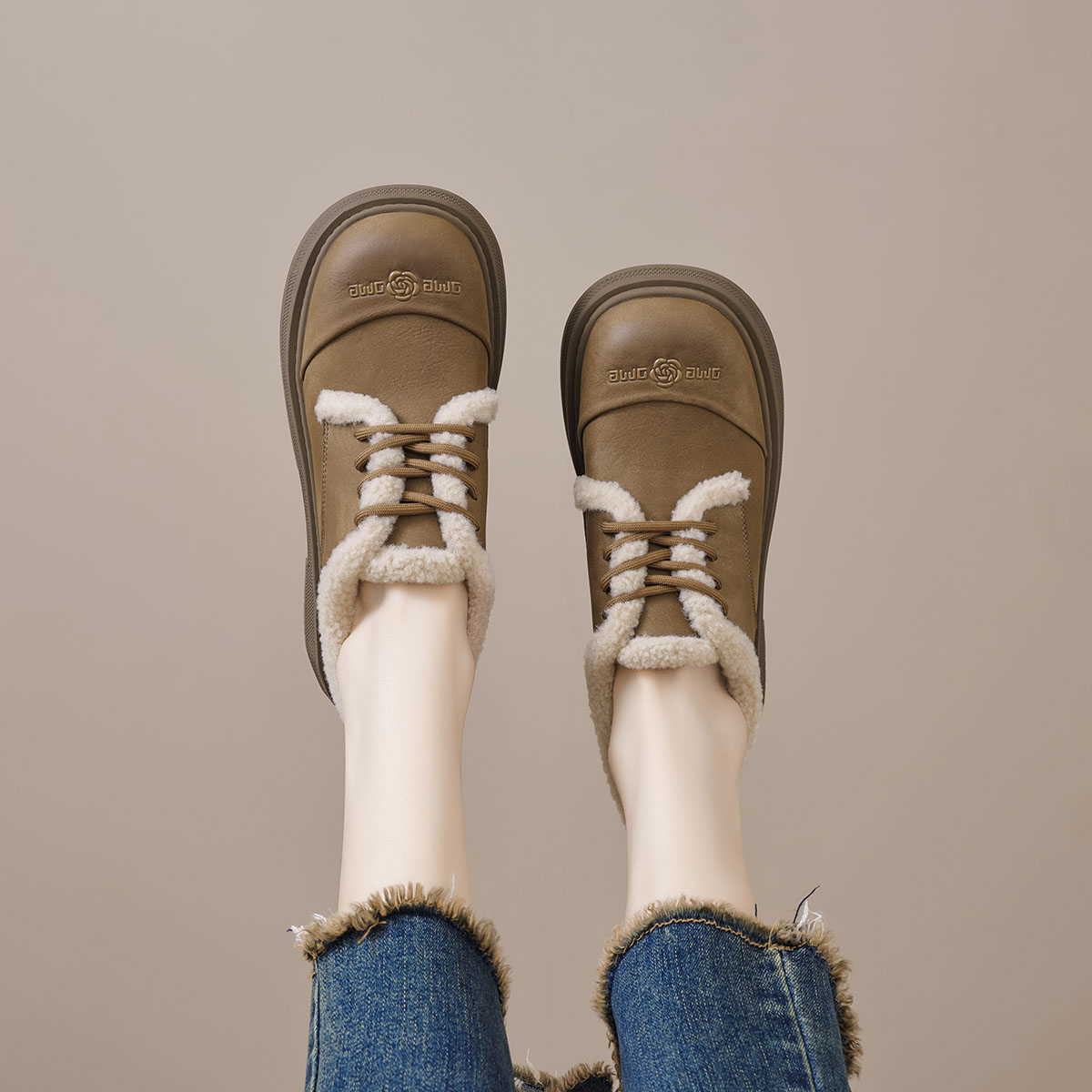2024温暖冬日百搭舒适休闲复古圆头拼接字母玫瑰系带毛毛鞋
