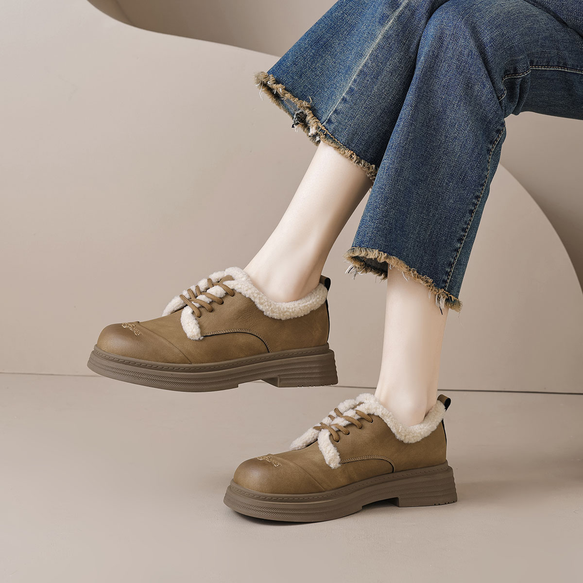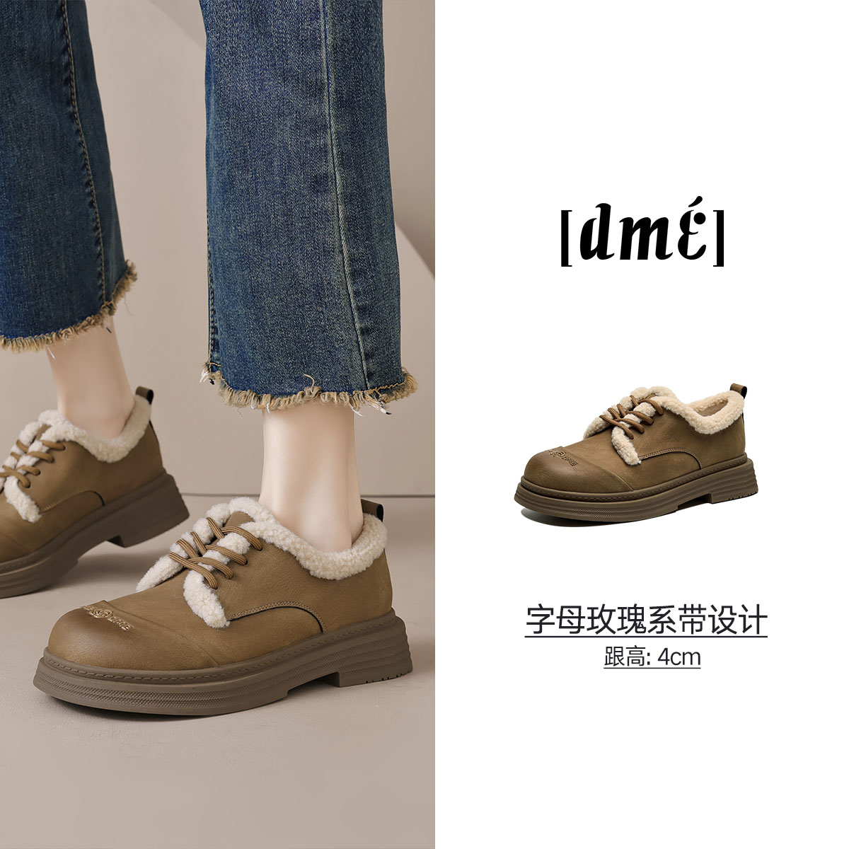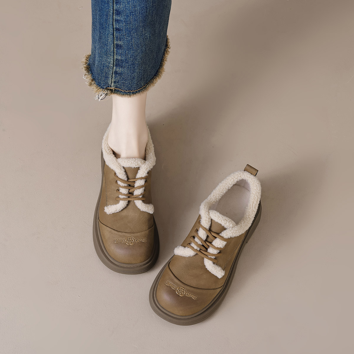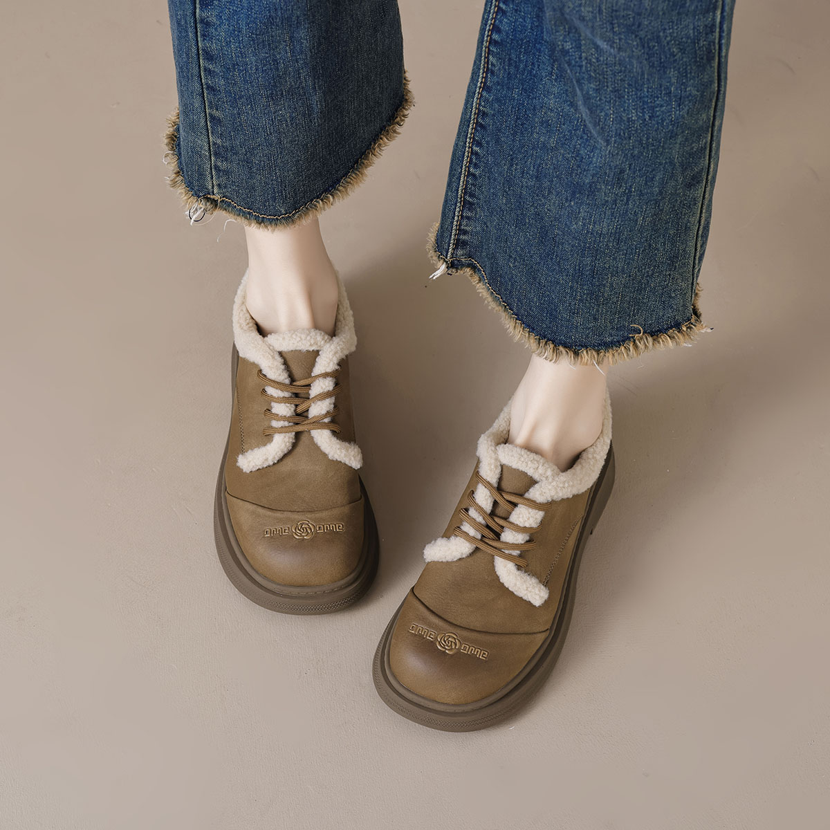 2024温暖冬日百搭舒适休闲复古圆头拼接字母玫瑰系带毛毛鞋