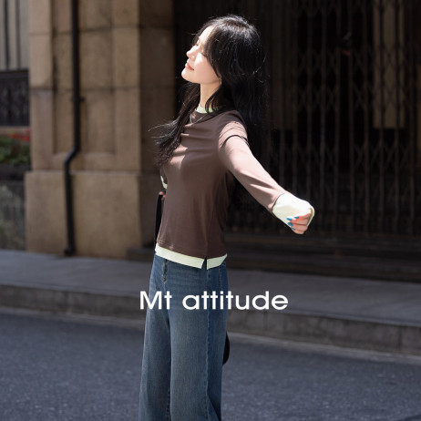 【简约撞色拼接】2024冬款加绒弹力罗纹面料长袖打底衫