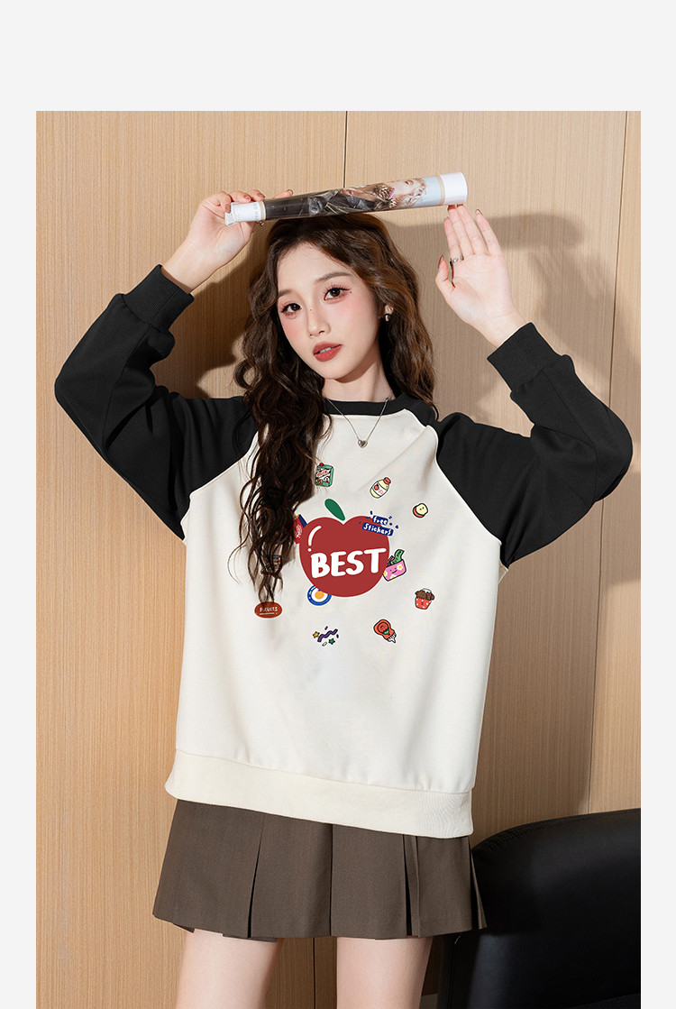 2024冬季女圆领插肩袖前胸水果图案加绒卫衣减龄百搭学院风潮