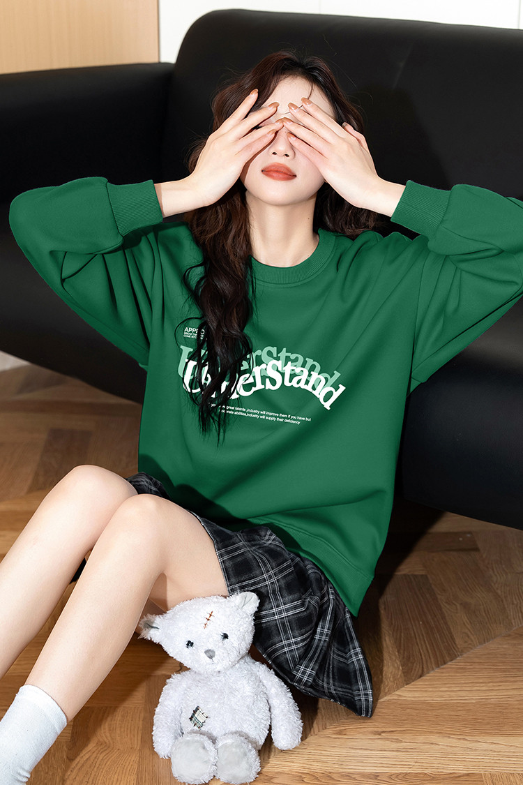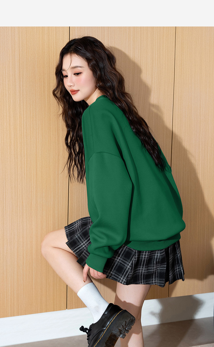 2024冬季女圆领前胸弧形字母加绒卫衣复古减龄百搭韩版慵懒风