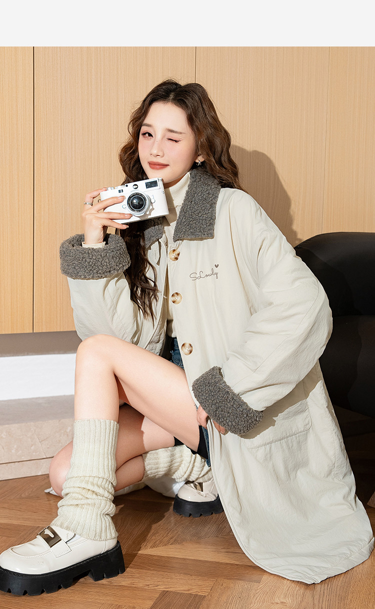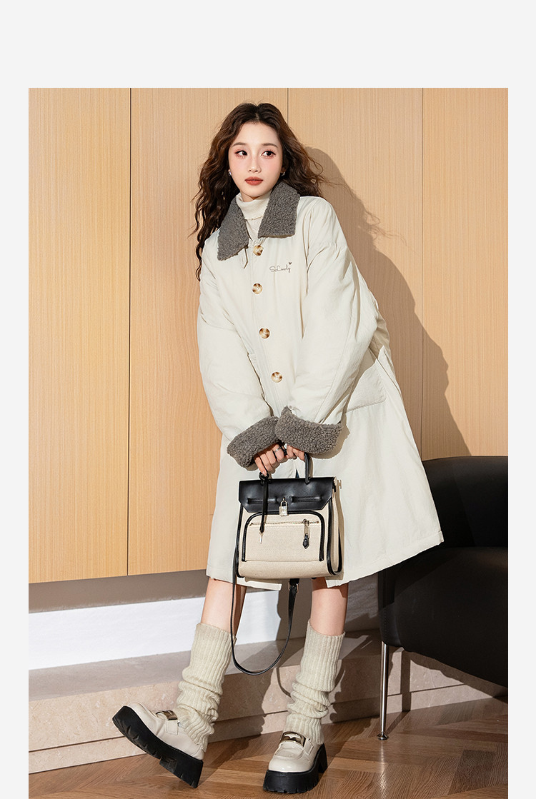 2024冬季女撞色羔毛拼接翻领长款棉衣修身舒适时尚